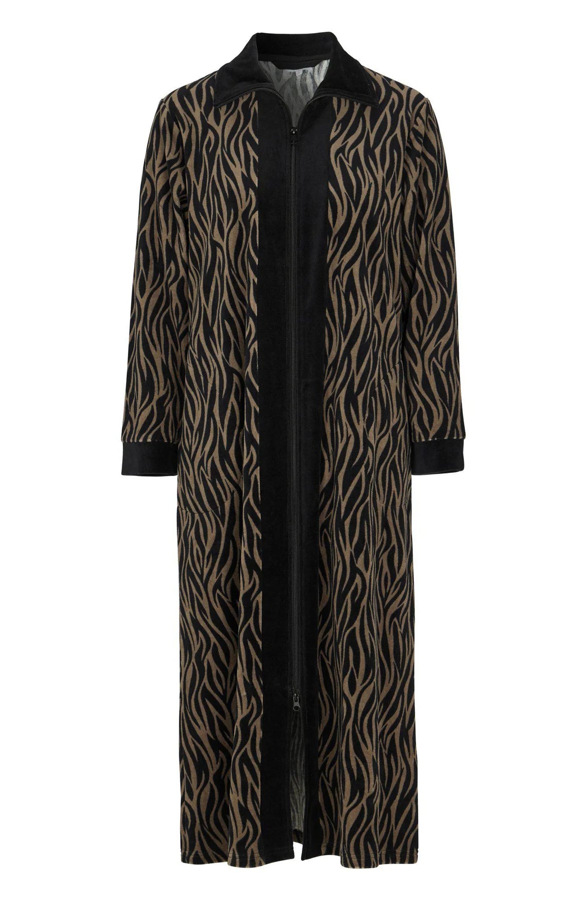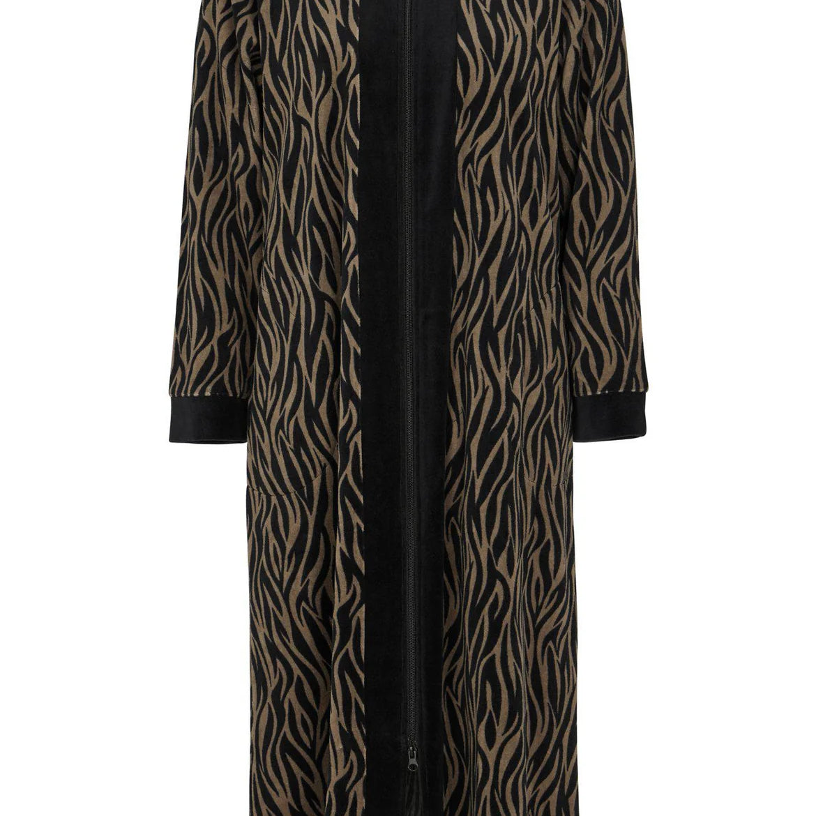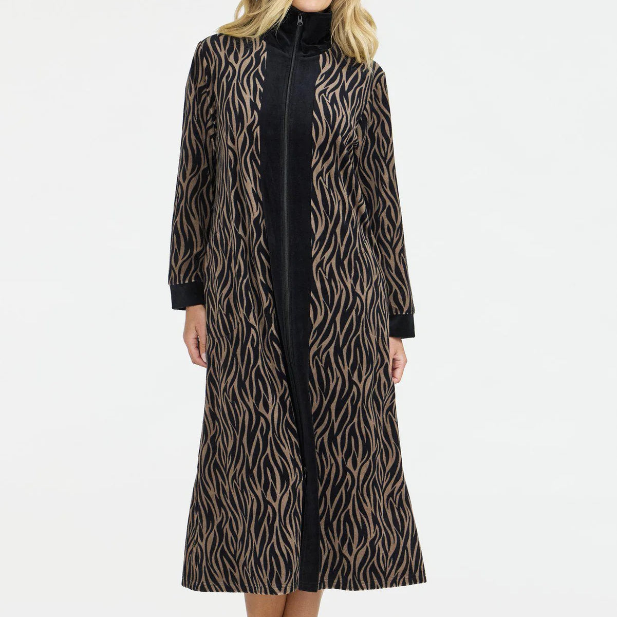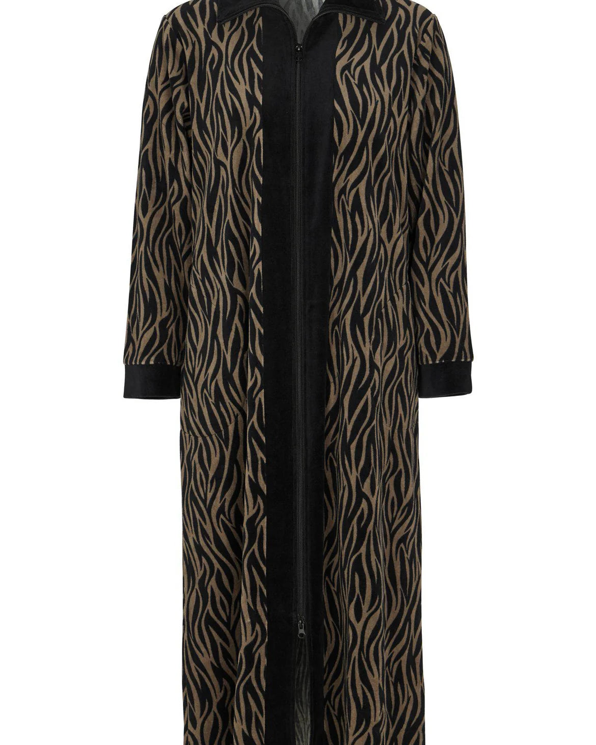 Damella Zebra vetoketjullinen oloasutakki/aamutakki. Pintamateriaali pehmeää ja ylellistä plyysiä ja sisäpuoli miellyttävää puuvillaa. Kaunis ja ylellinen musta-ruskea zebra kuosi.