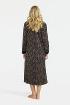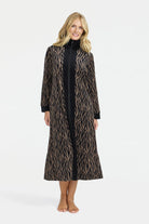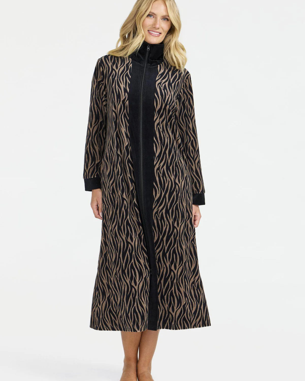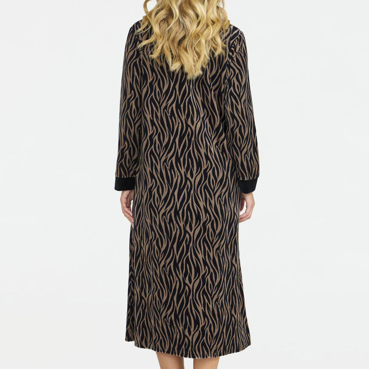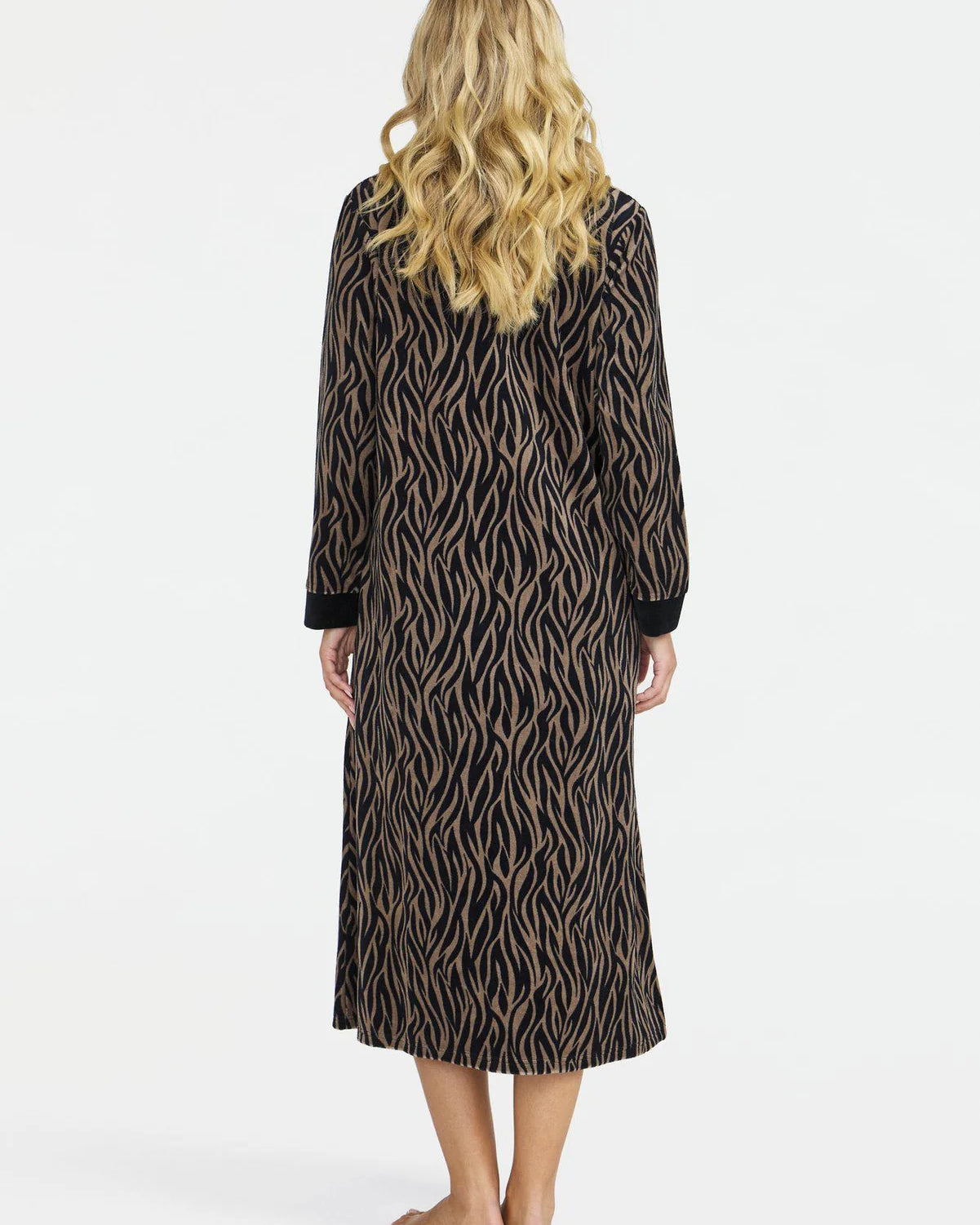 Damella Zebra vetoketjullinen oloasutakki/aamutakki. Pintamateriaali pehmeää ja ylellistä plyysiä ja sisäpuoli miellyttävää puuvillaa. Kaunis ja ylellinen musta-ruskea zebra kuosi.