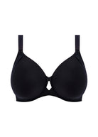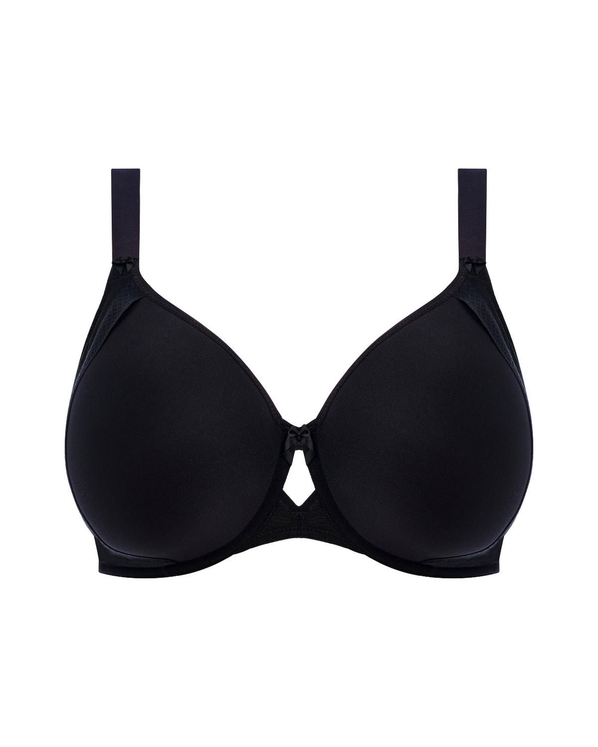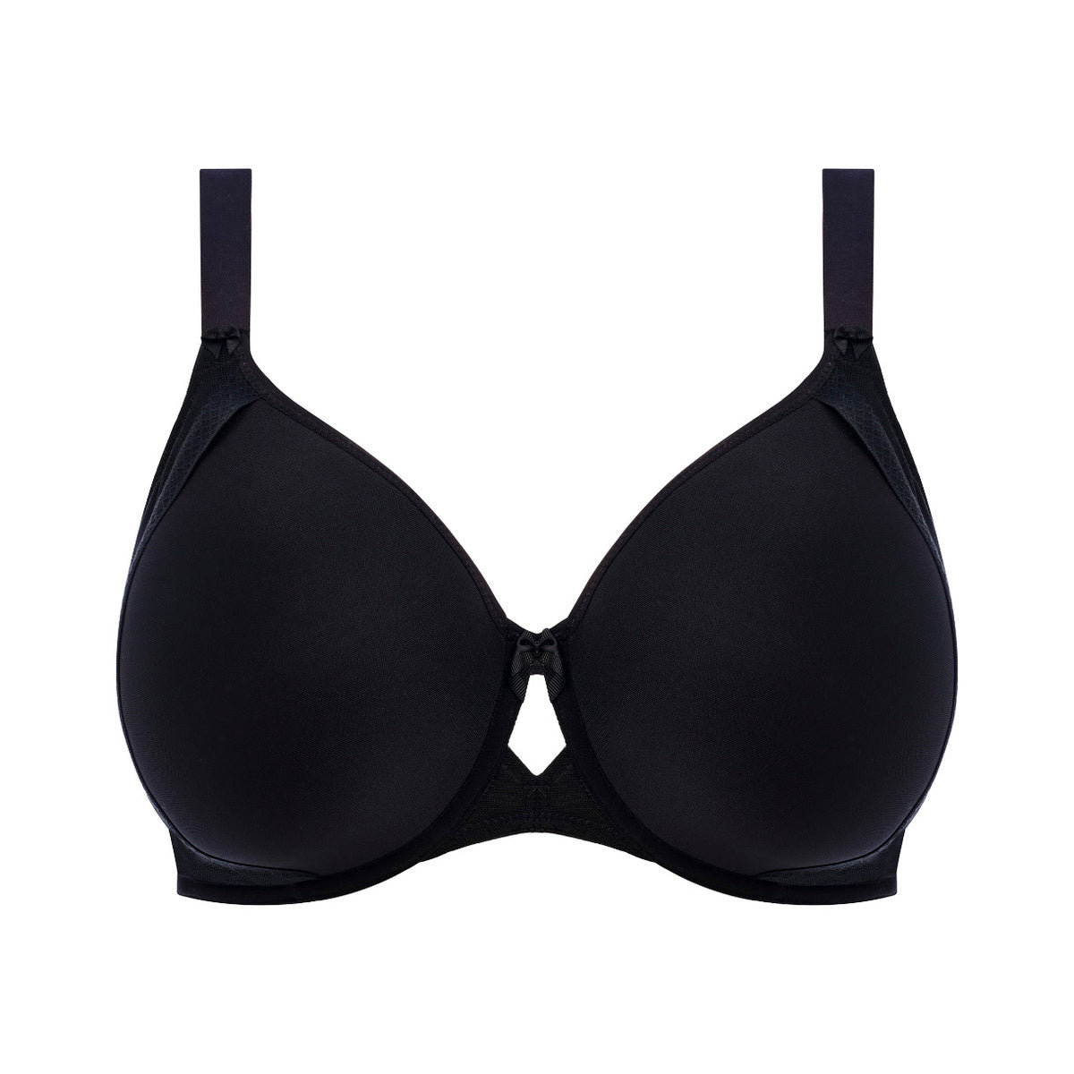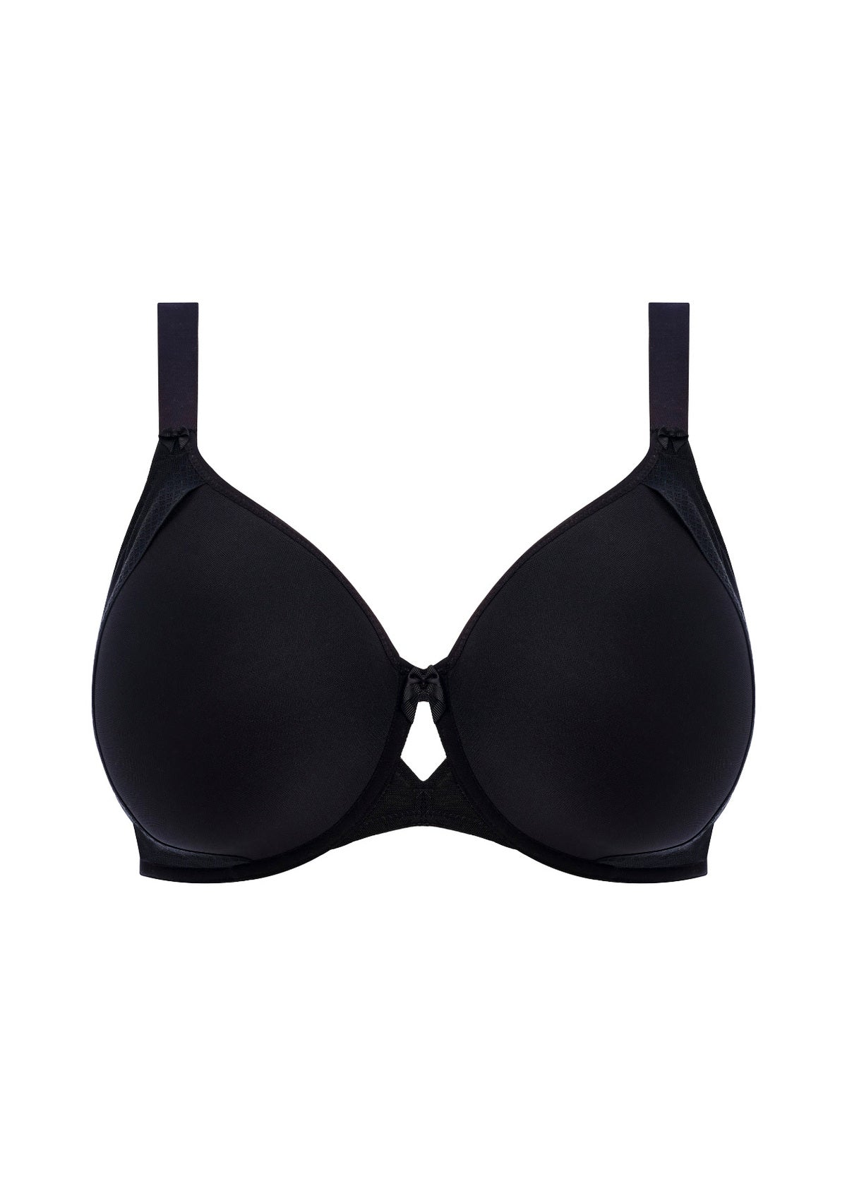 Elomi Nerina EL302710 rintaliivi. Kaarituellinen ja kevyesti spacer topattu kuppi. T-paitaliivi, jossa on sileät ja saumattomat, muotoonprässätyt kupit. Kuppien spacer-materiaali on pari millimetriä paksua ja hieman joustavaa. Muotoonprässätty kuppi antaa kauniin sileän ja pyöreän muodon. Kupin sivupaneelin on päällä joustavaa pitsiä, mikä antaa muuten sileälle liiville hieman ilmettä sekä sivupaneeli ohjaa rintaa eteenpäin kainaloista. Tämä liivimalli on ns. bandless-mallinen eli kuppien alla ei ole kangasta ja vain keskipaneeli yhdistää kupit toisiinsa. Tällainen bandless-malli sopii yleensä hyvin vatsakkaille sekä lyhytvartaloisille. Tässä mallissa ei ole sivuluita. Takaosa on kaksinkertaista neulosta, jossa lisäksi beigenvärinen vuorikangas, joka korostaa takaosan pitsikuviota. Säädettävät olkaimet.