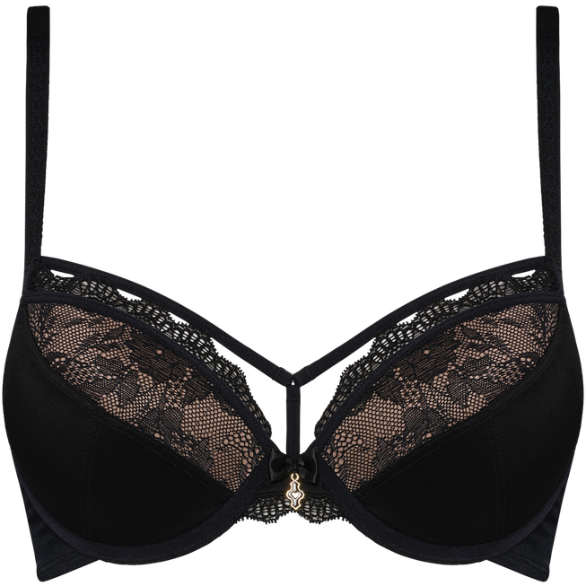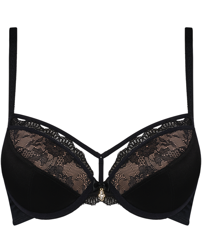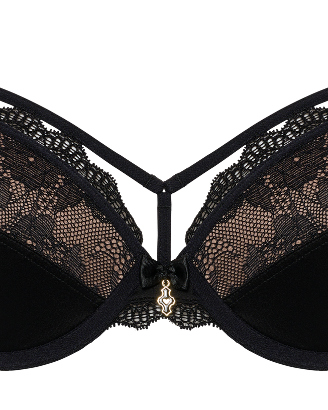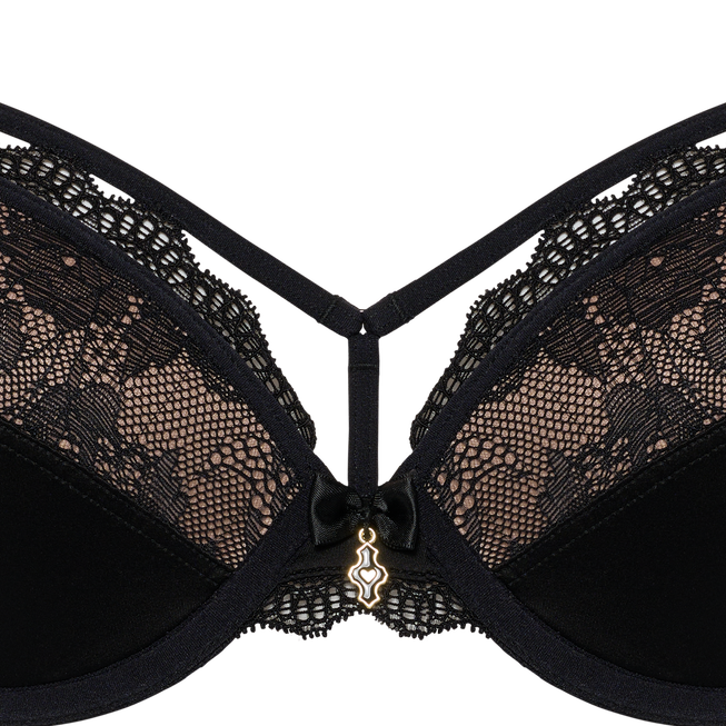 Marlies Dekkers Carita push-up rintaliivi. Värinä musta, pitsiyksityiskohdilla ja nyörisomisteilla. Olkaimet menevät ristiin takana.