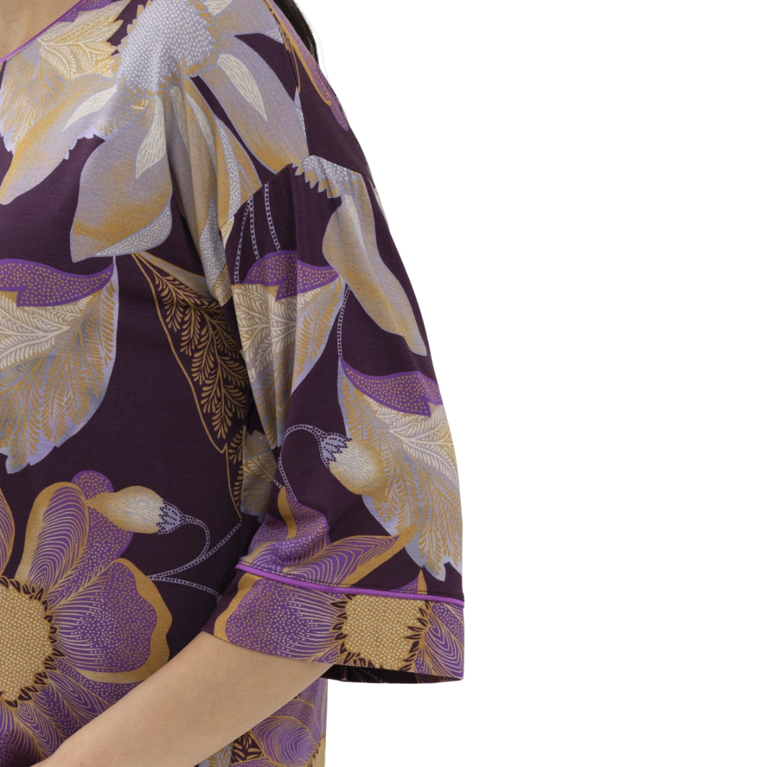 Tumma luumun sävyinen pohjaväri sekä kukkakuviointia. Kauniit viimeistellyt yksityiskohdat. Pitkat suorat lahkeet sekä rento hihanmitta.