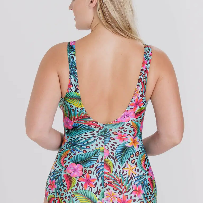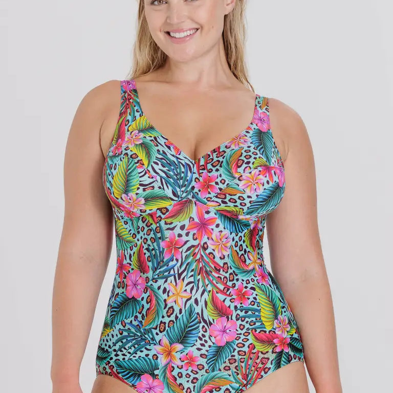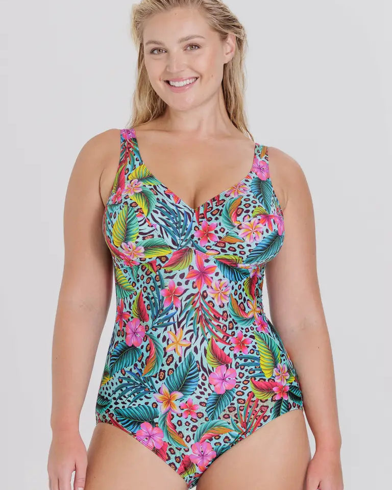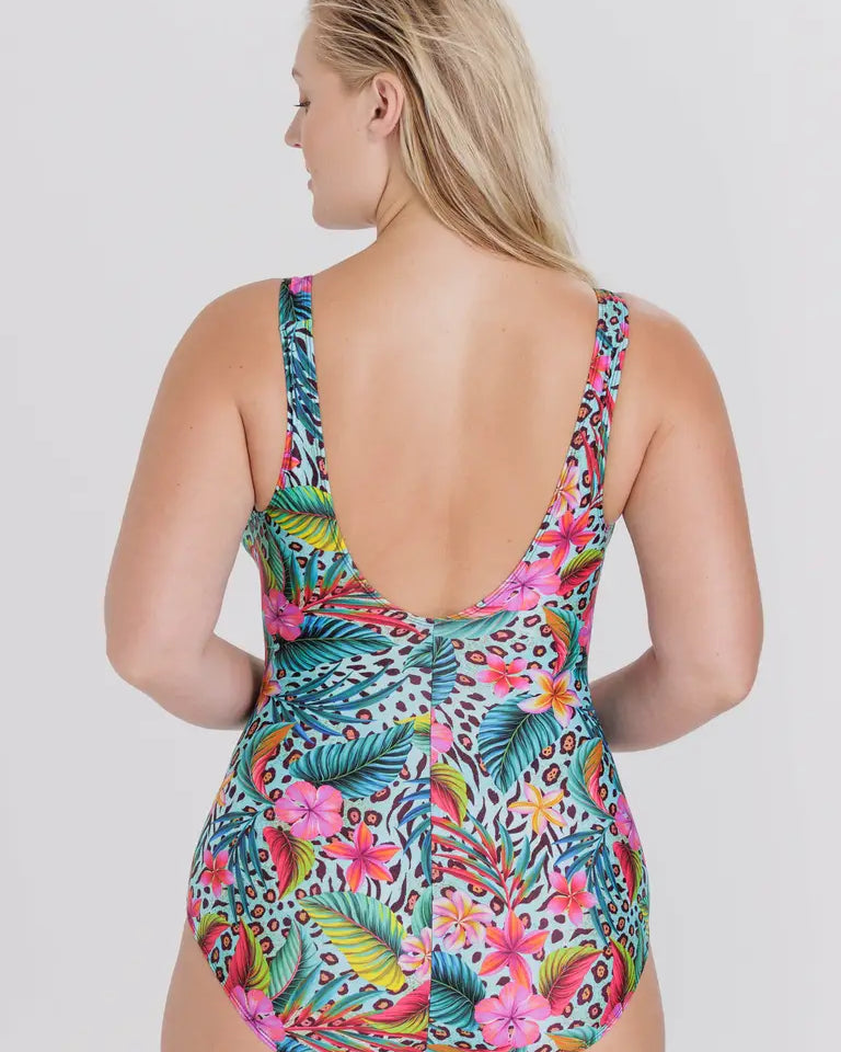 Peittävä kuosi edessä ja takana iloisenvärisellä kasvi- ja eläinteemalla. Kloorinkestävän materiaalin ansiosta sopii myös uima-altaaseen. Kaaritueton kuppi verkkovuorilla. Imarteleva v-pääntie. Kuppiosan alla leikkaus, joka tukee rintoja. Etuosassa on vahvikkeena mesh-vuori, joka lisää tukea. Ei säädettäviä olkaimia. Vuorattu haaraosa.