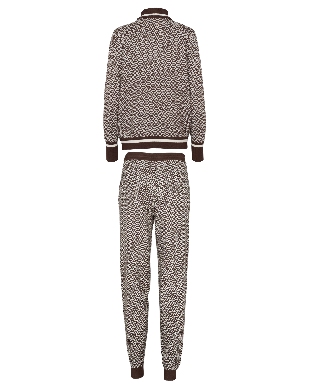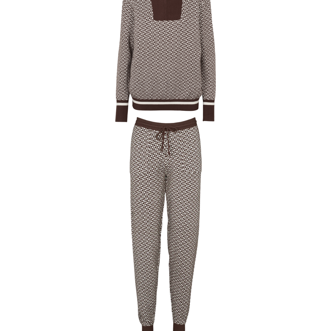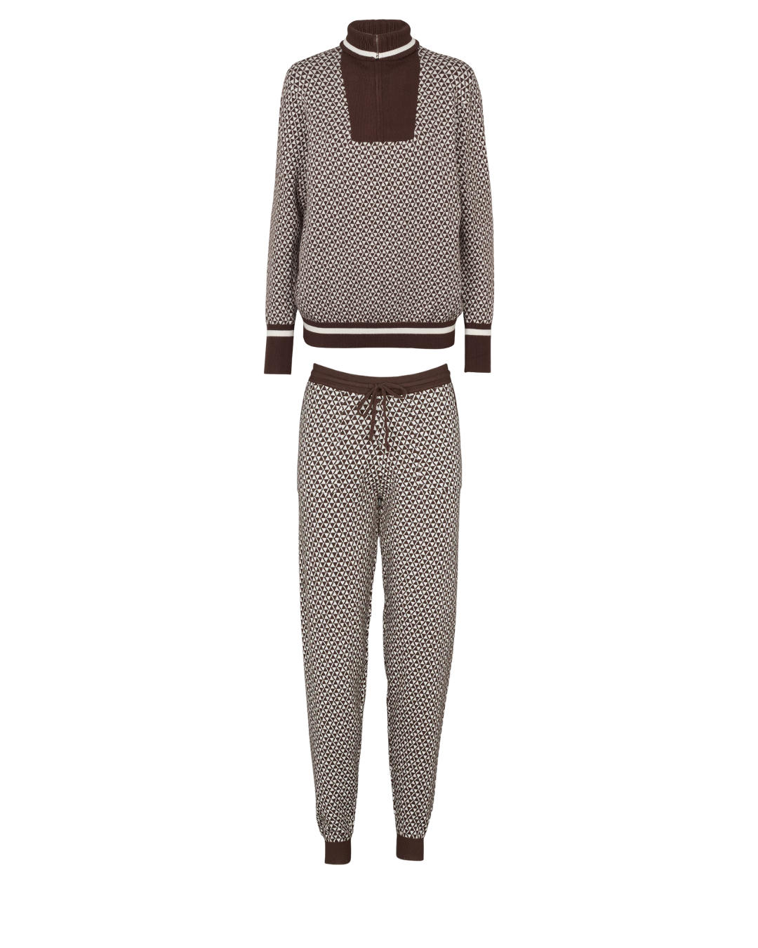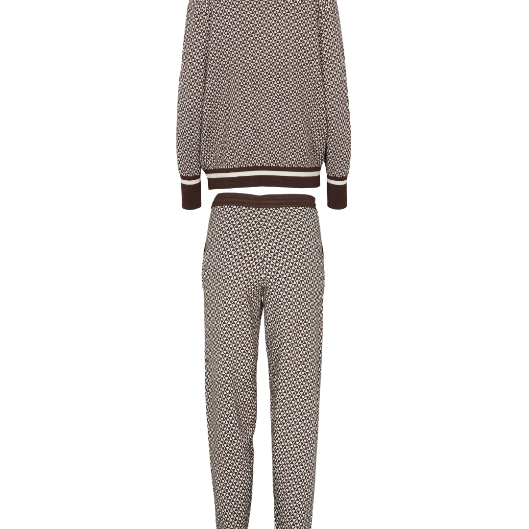 Missya Luna neuloskankainen oloasu. Pehmeä ja lämmin kahvinruskea-vaalea kuviollinen oloasu. Paidassa vetoketju kaulus ja resorineulokset hihansuissa ja helmassa. Housussa vyötäröllä nauhakiristys ja punteissa resorit. Soveltu myös lämpimäksi kerrastoksi ulkoiluvaatteiden alle.