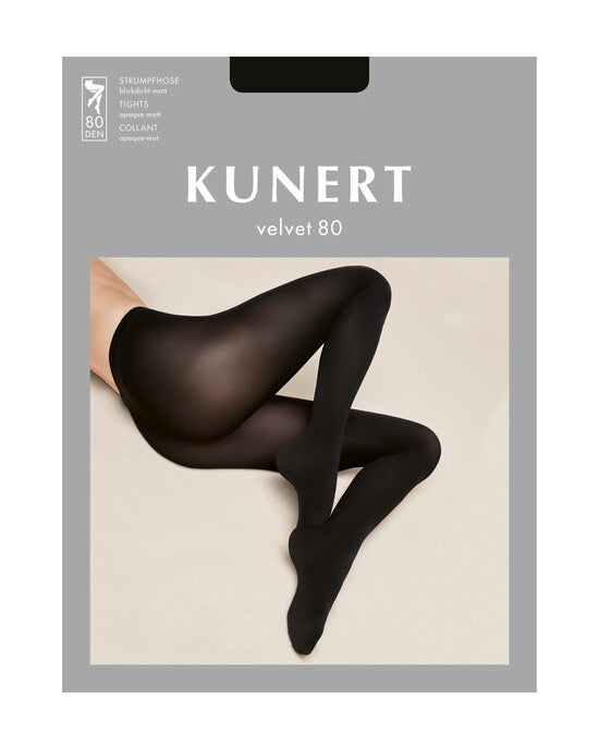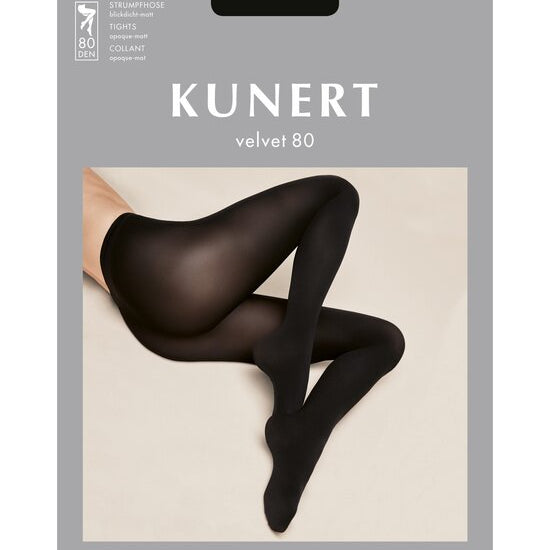 Kunert Velvet 80 denierin paksuiset mattapintaiset sukkahousut. Peittävät sukkahousut, jotka tuntuvat pehmeiltä ja sopivat hyvin viileämpiin päiviin. Kärkivahvikkeettomien sukkahousujen litteä vyötärönauha ei kiristä ja housuissa on miellyttävät litteät ja ihoystävälliset saumat.