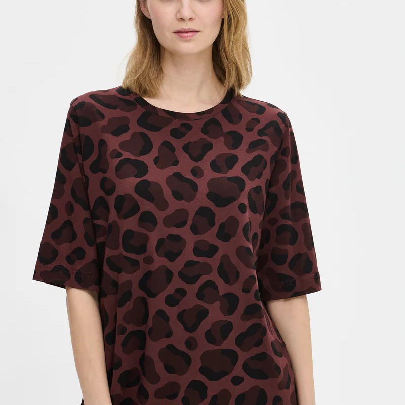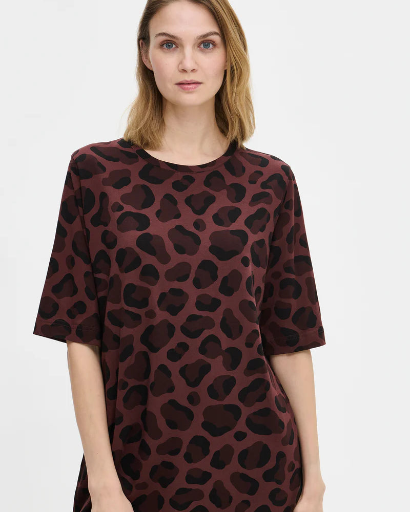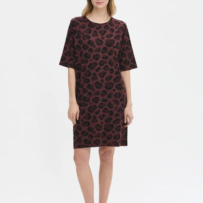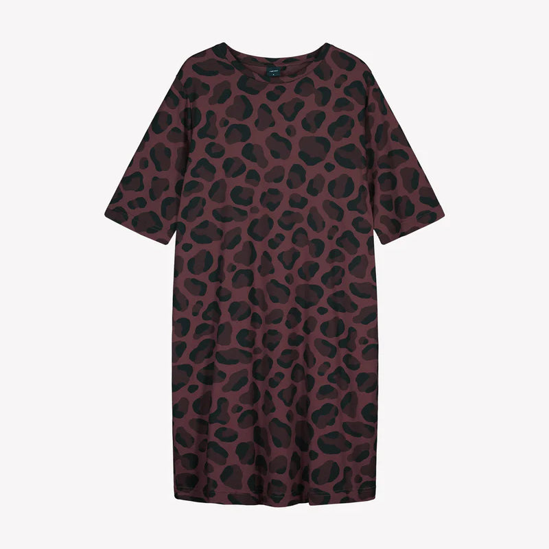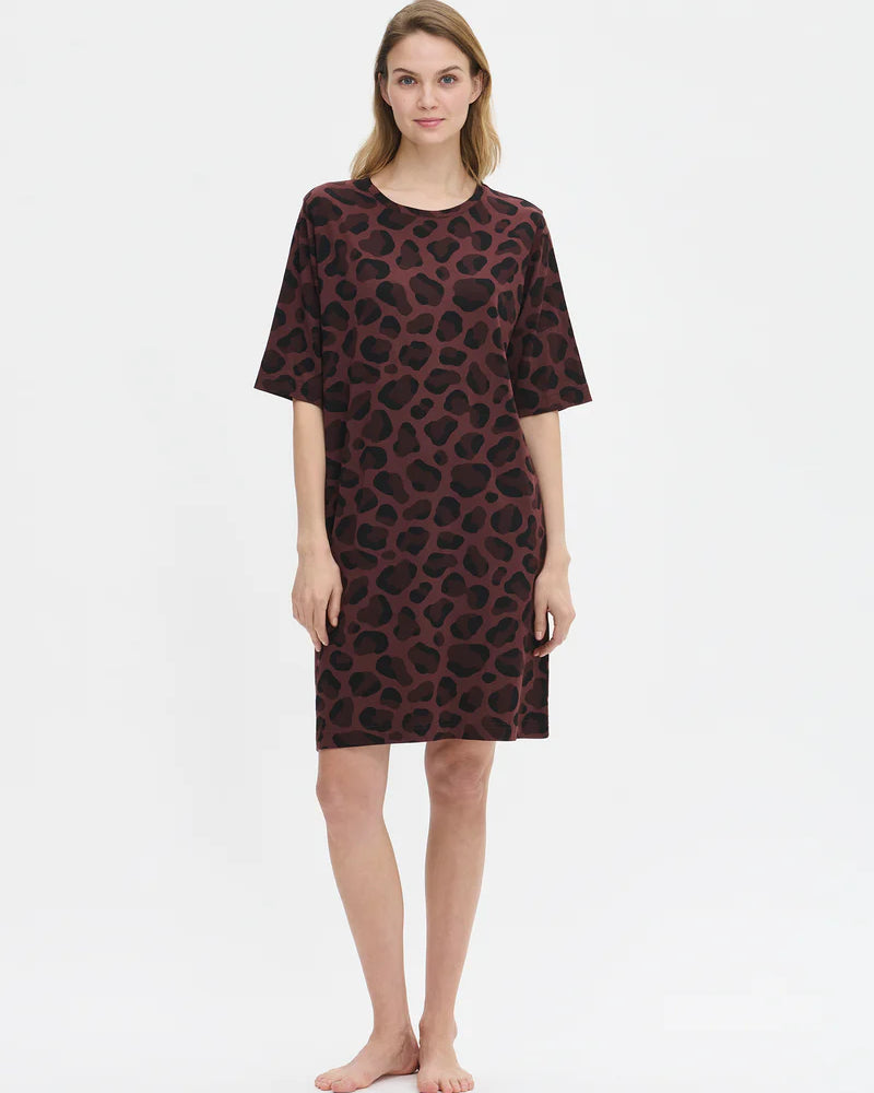 Nanso Pantteri sarjan lyhyt yöpaita / paituli. Veikeä ja tyylikäs punaruskean kirjava kuosi, jossa tyyliteltyä leopardikuviota. Väljät pidemmät t-paitahihat.
