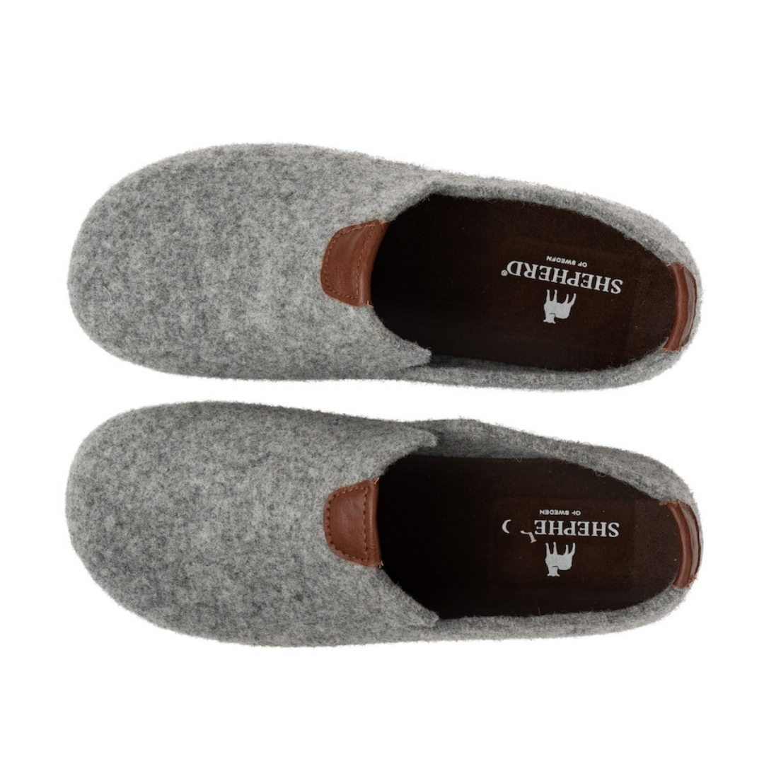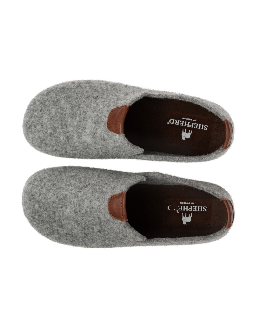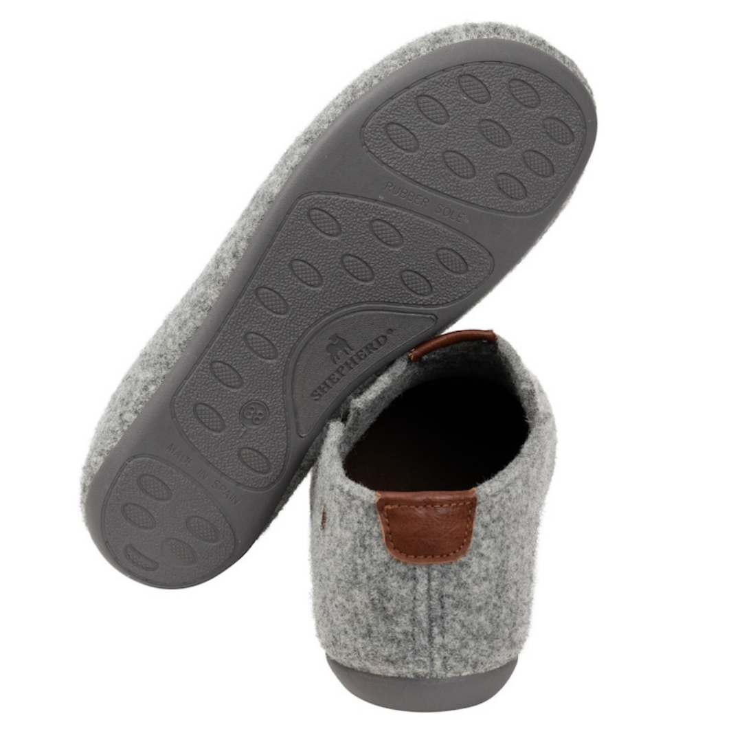Shepherd Elma on matala nilkkakorkuinen luonnollisesta villasta valmistettu tossu, joka on pehmeä, lämmin ja helppo pukea sivuilla olevien halkioiden ansiosta. Hillityt nahkaiset yksityiskohdat ja sivulla oleva logo antavat yksilöllisen ilmeen.