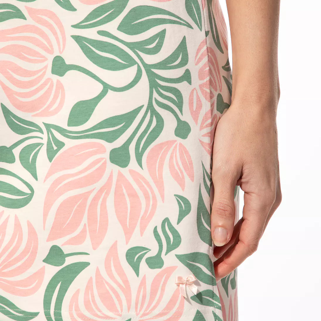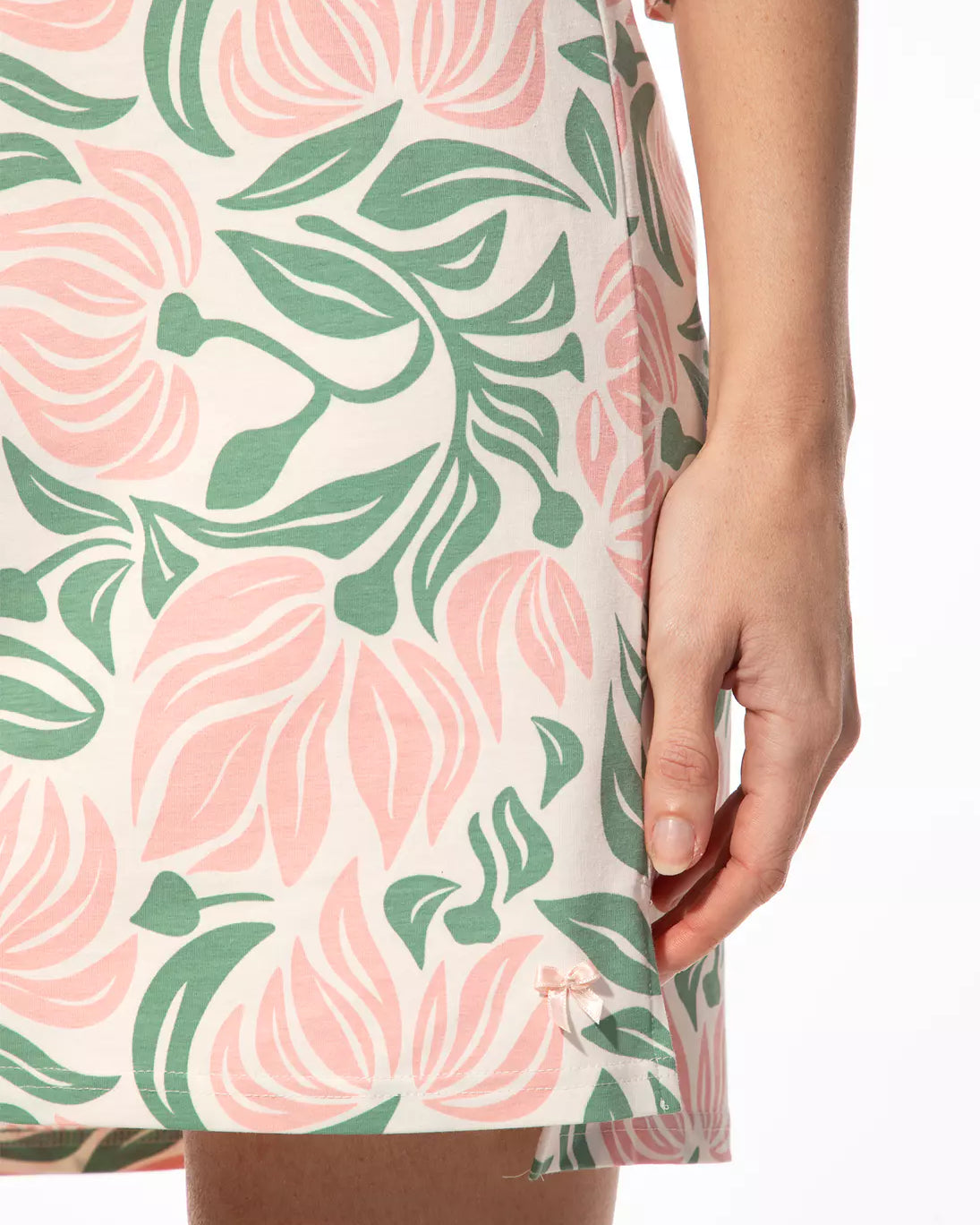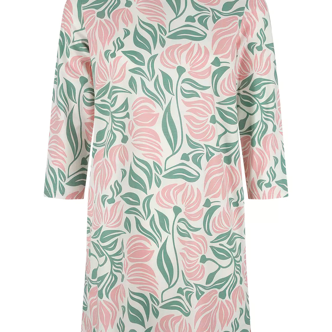 Short Stories yöpaita. Vajaamittainen 3/4 -hiha ja lyhyt helma. Ihanan pehmeää ja joustavaa puuvilla-elastaania. Hempeä roosa-vihreä kuviointi.