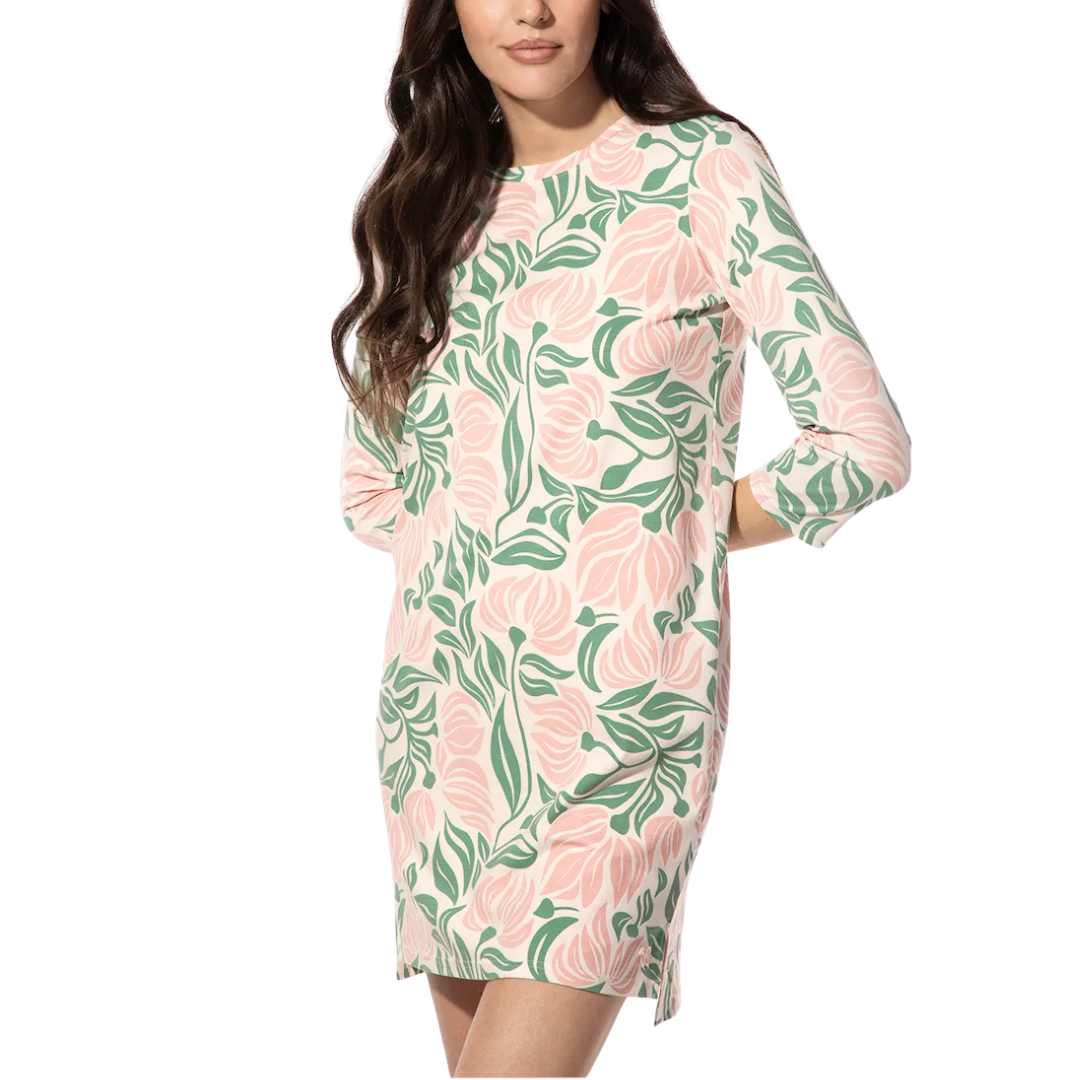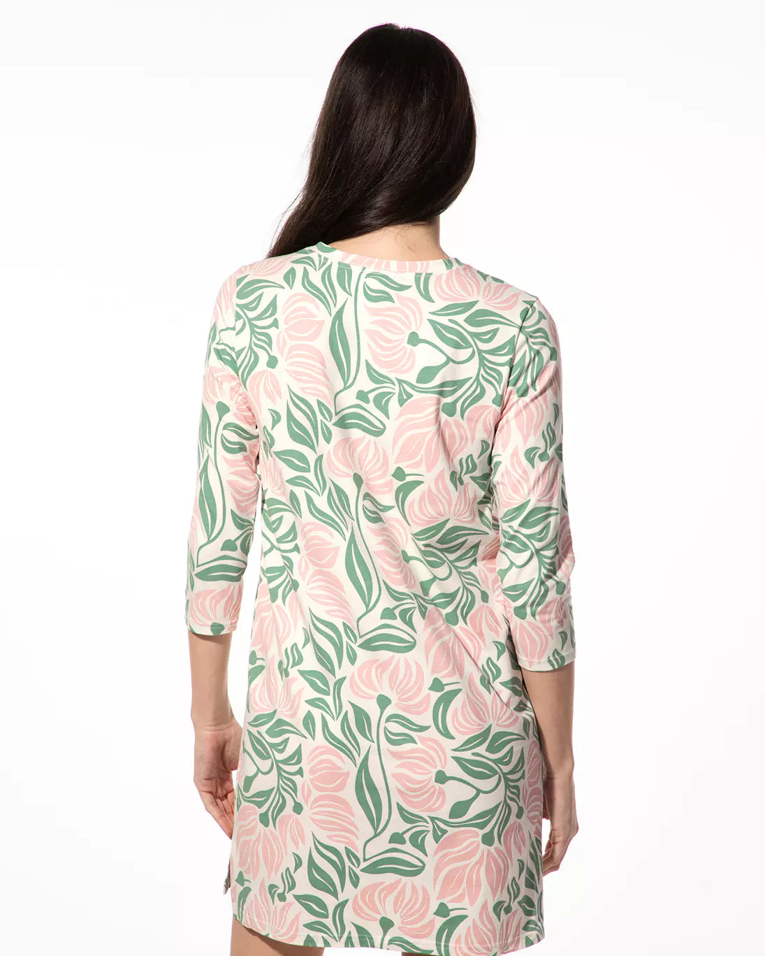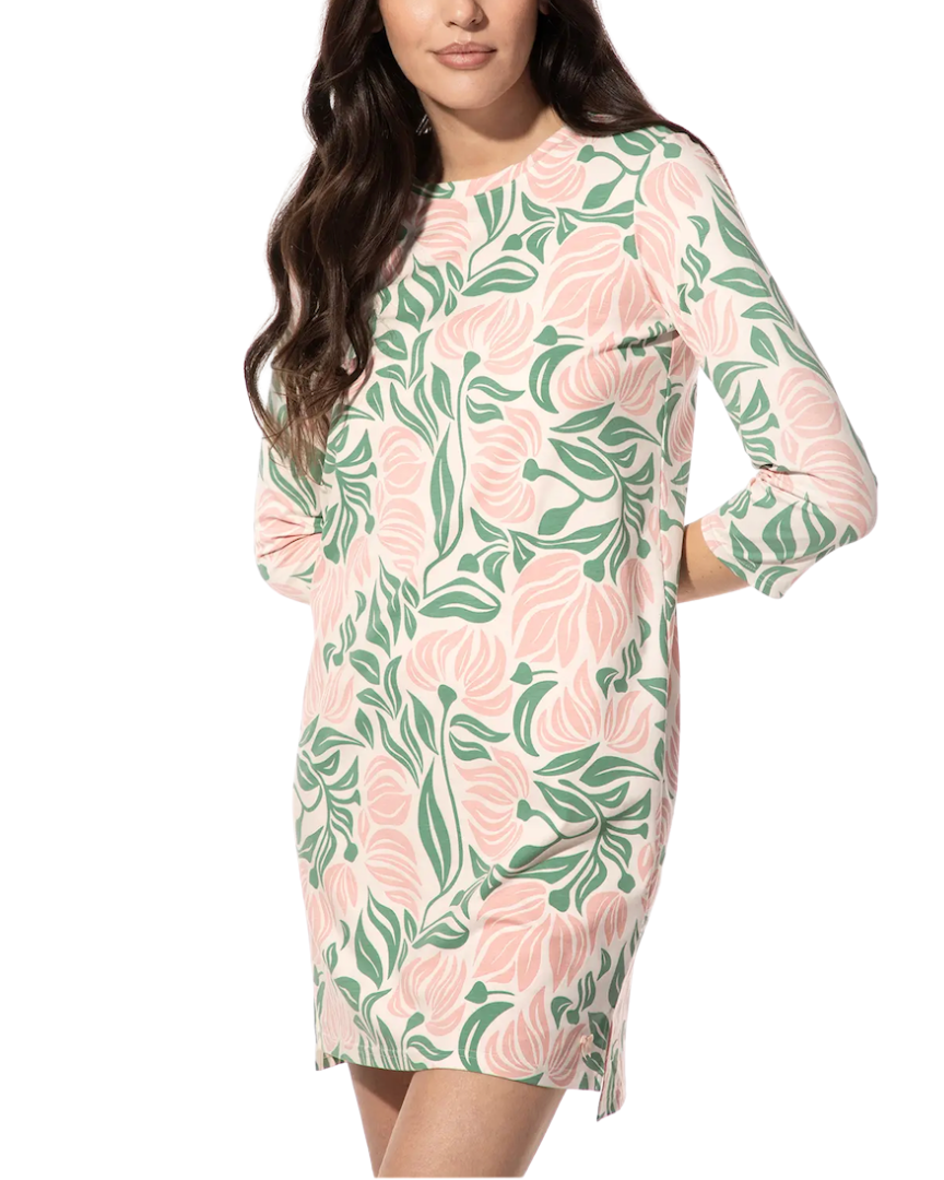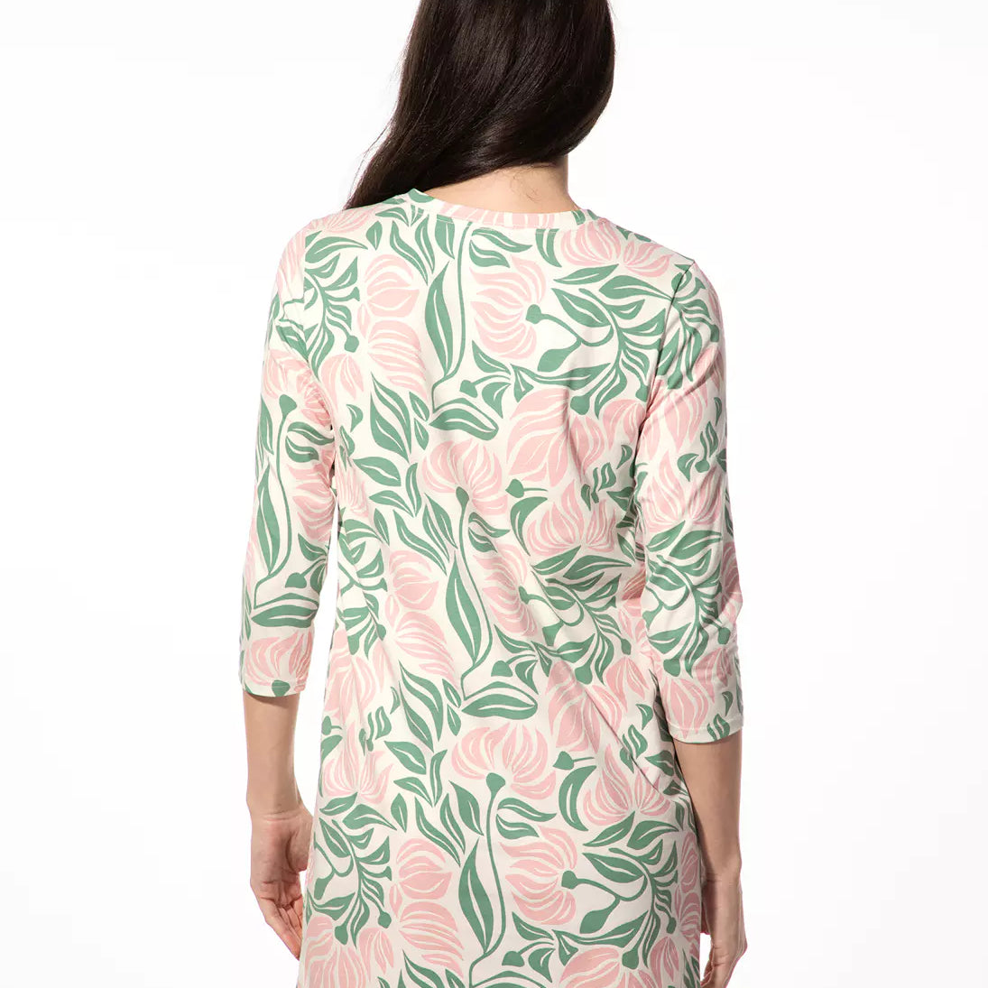 Short Stories yöpaita. Vajaamittainen 3/4 -hiha ja lyhyt helma. Ihanan pehmeää ja joustavaa puuvilla-elastaania. Hempeä roosa-vihreä kuviointi.