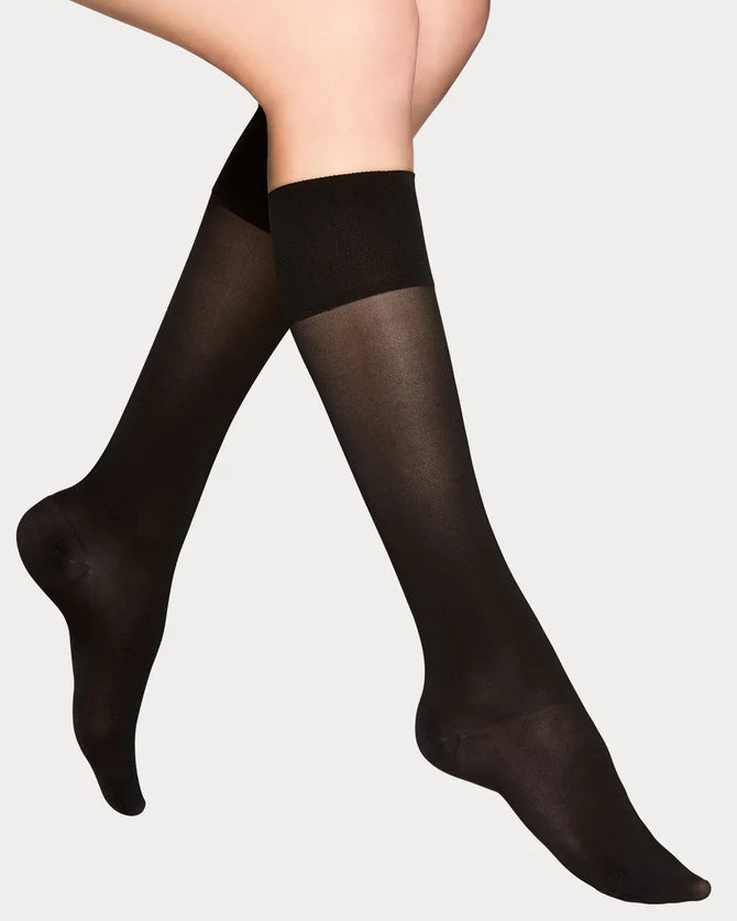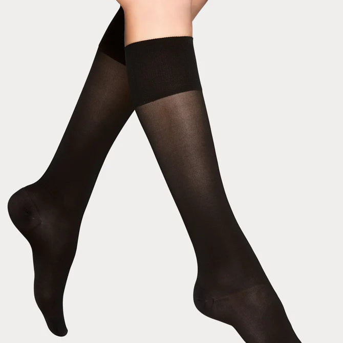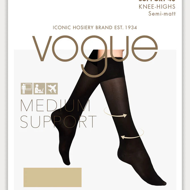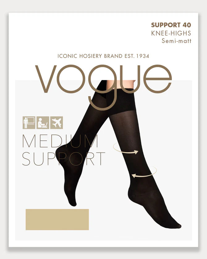 Voguen 40 denierin polvisukat keskivahvalla tuella saavat jalkasi tuntumaan kevyiltä koko päivän. Leveä miellyttävä resori, vahvistettu kärki ja muotoon neulottu kantapää.