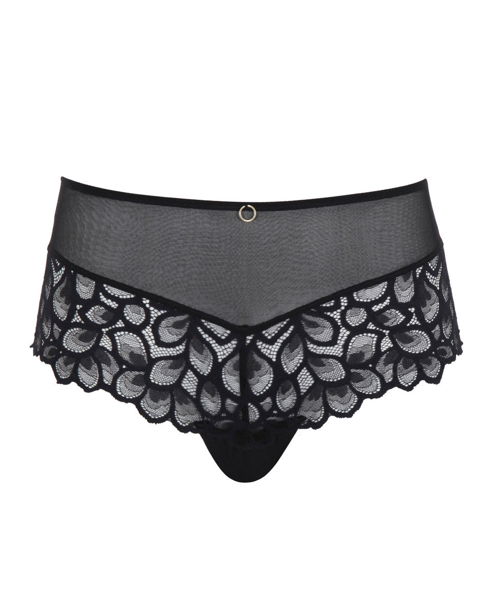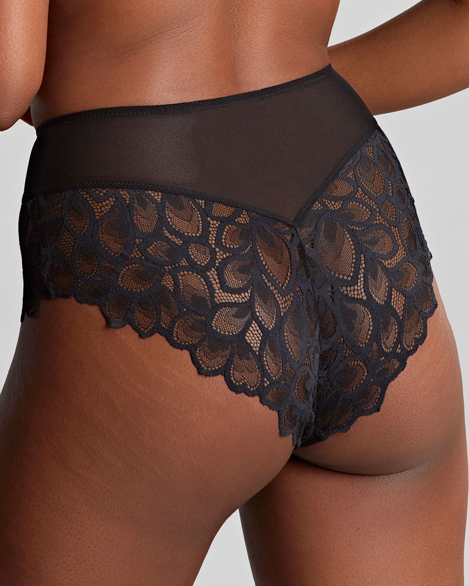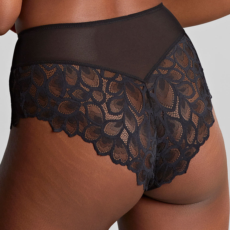 Panache Allure sarjan Deep Brief korkean mallinen alushousu. Pehmeää meshiä ja joustopitsiä. Upeassa isokuvioisessa pitsissä on lehtiä tai paisley-kiehkuroita muistuttava kuviointi ja se on superpehmeää ihoa vasten. Edessä pieni kullanvärinen koriste. Puuvillavuorattu haaraosa.