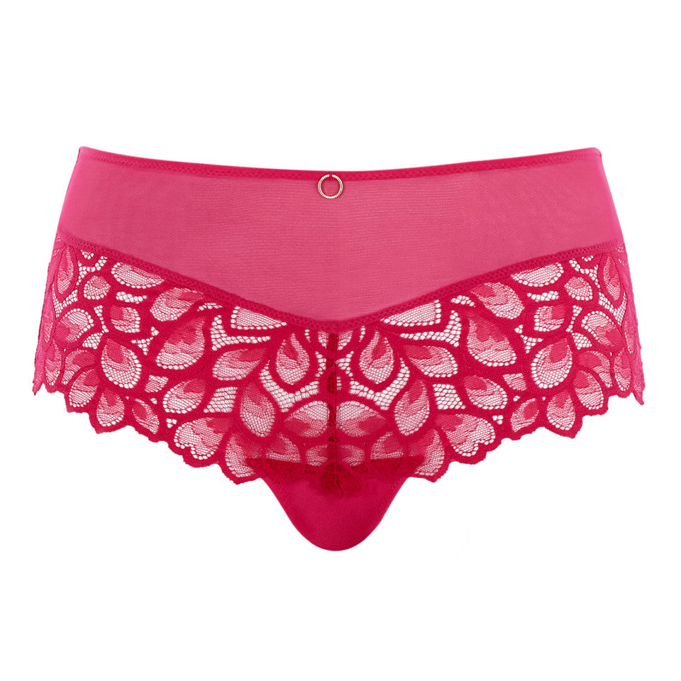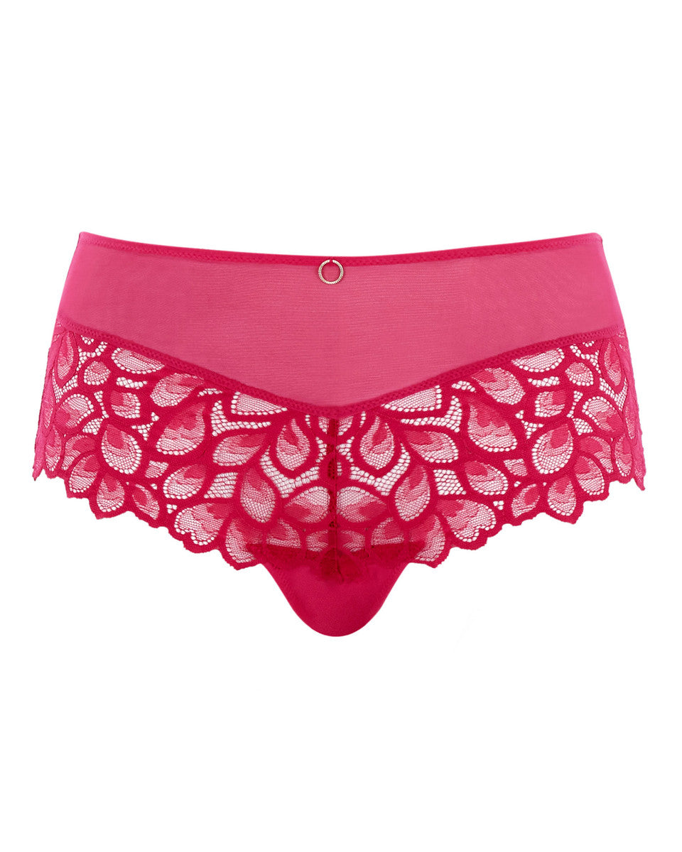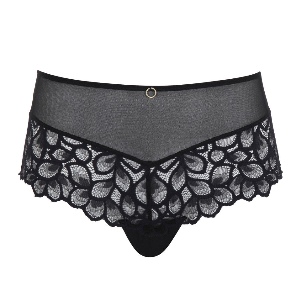 Panache Allure sarjan Deep Brief korkean mallinen alushousu. Pehmeää meshiä ja joustopitsiä. Upeassa isokuvioisessa pitsissä on lehtiä tai paisley-kiehkuroita muistuttava kuviointi ja se on superpehmeää ihoa vasten. Edessä pieni kullanvärinen koriste. Puuvillavuorattu haaraosa.