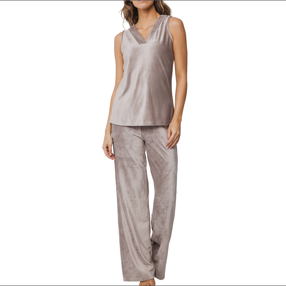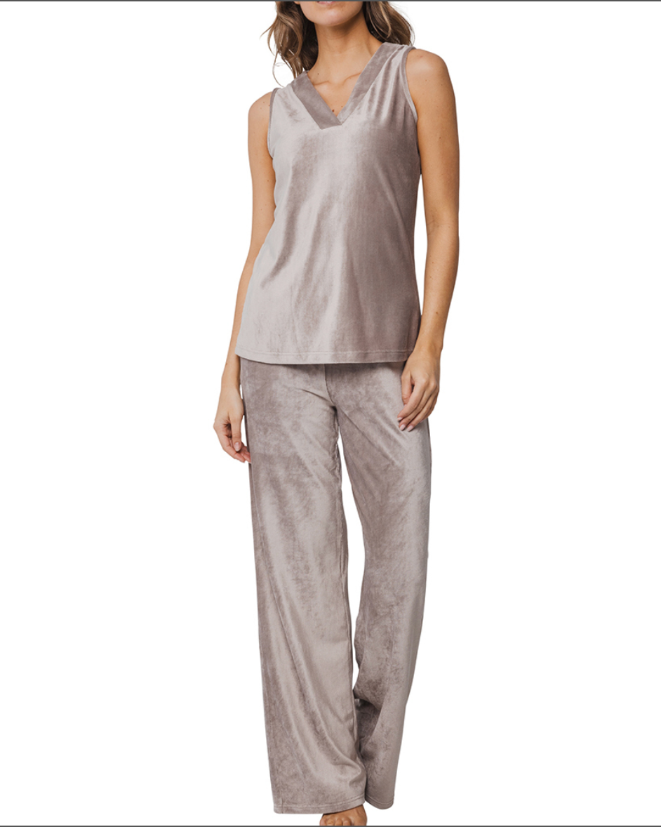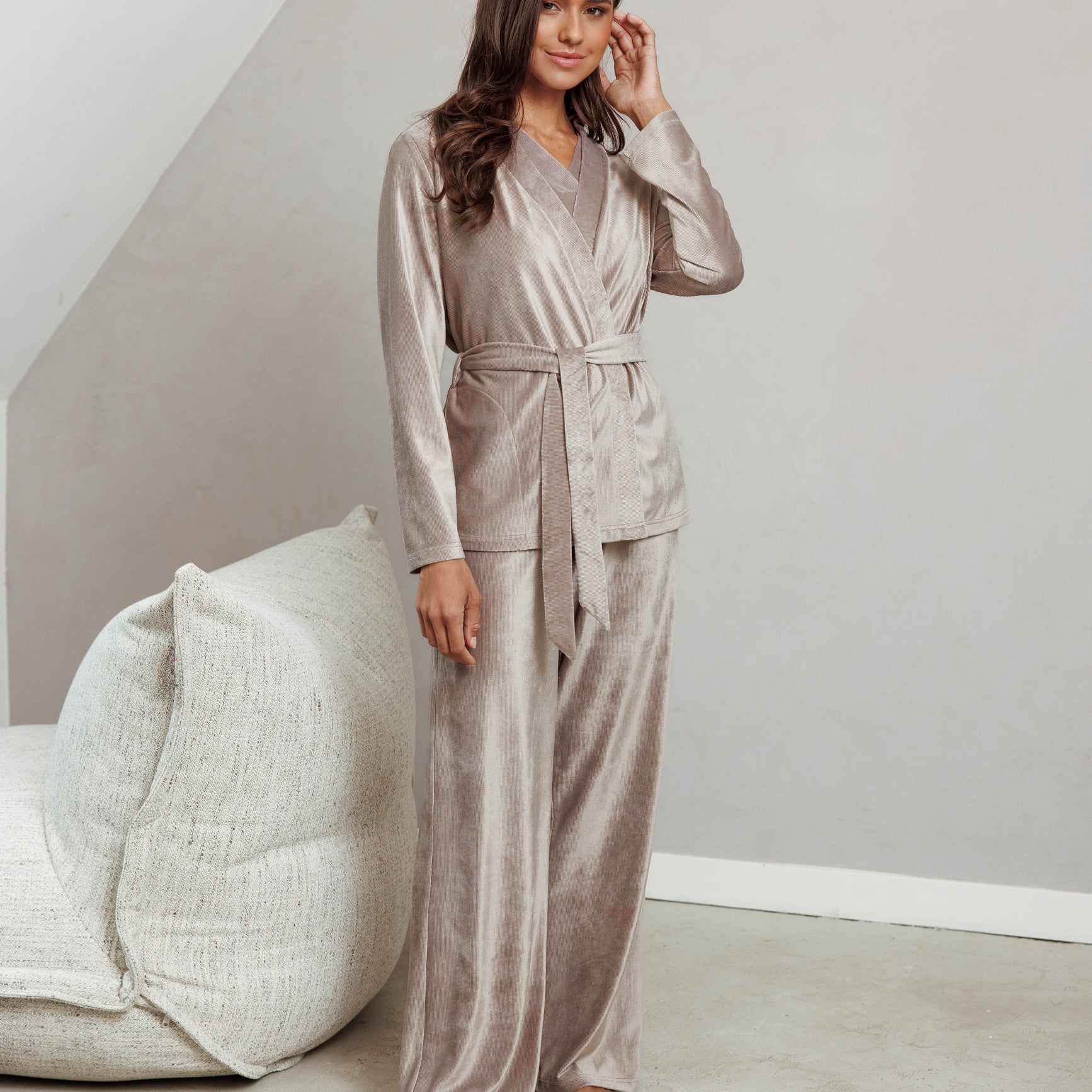 Hihaton toppi, lyhyt kietaisumallinen takki ja pitkät housut. Täydellinen ja ylellinen asu kotoiluun.