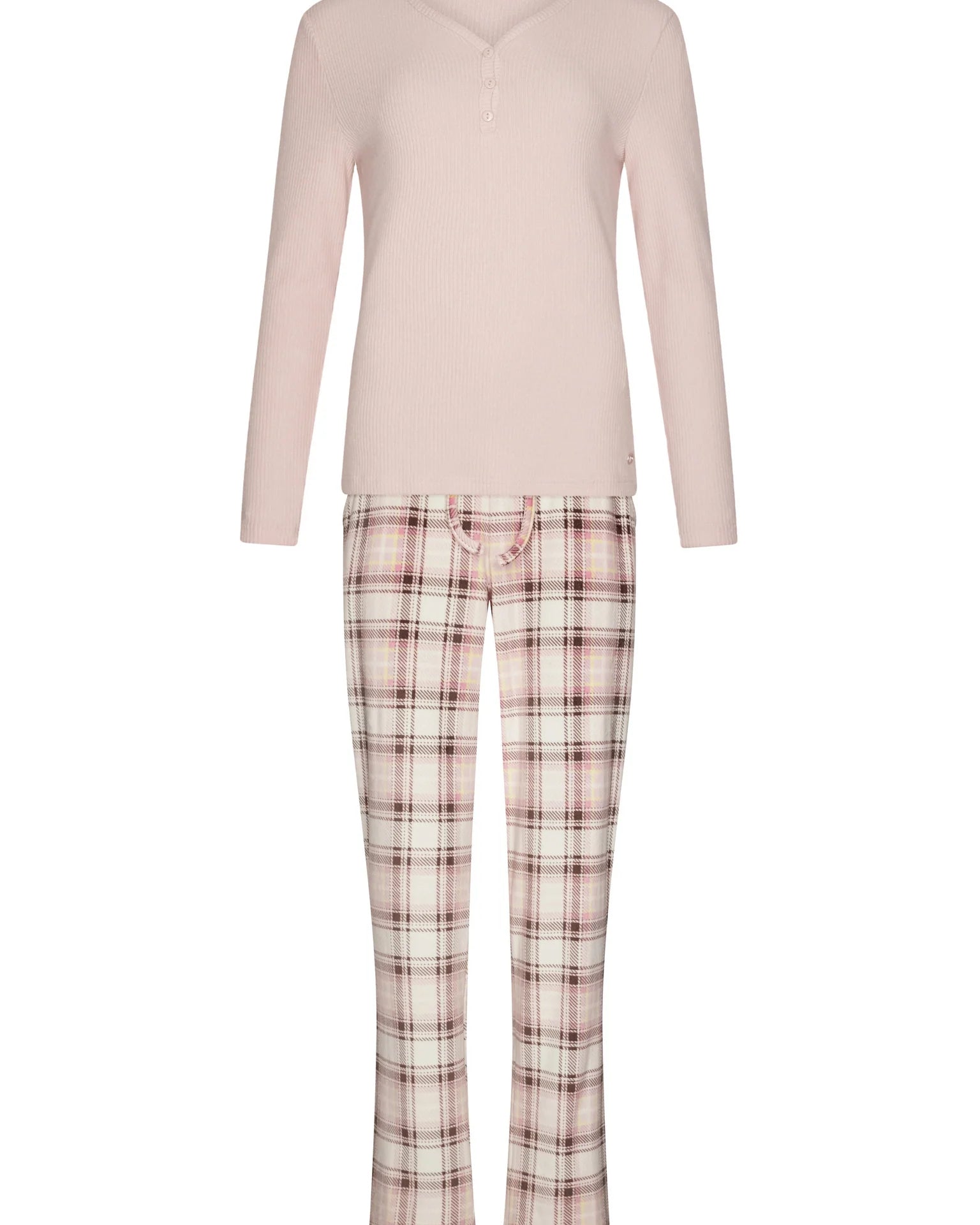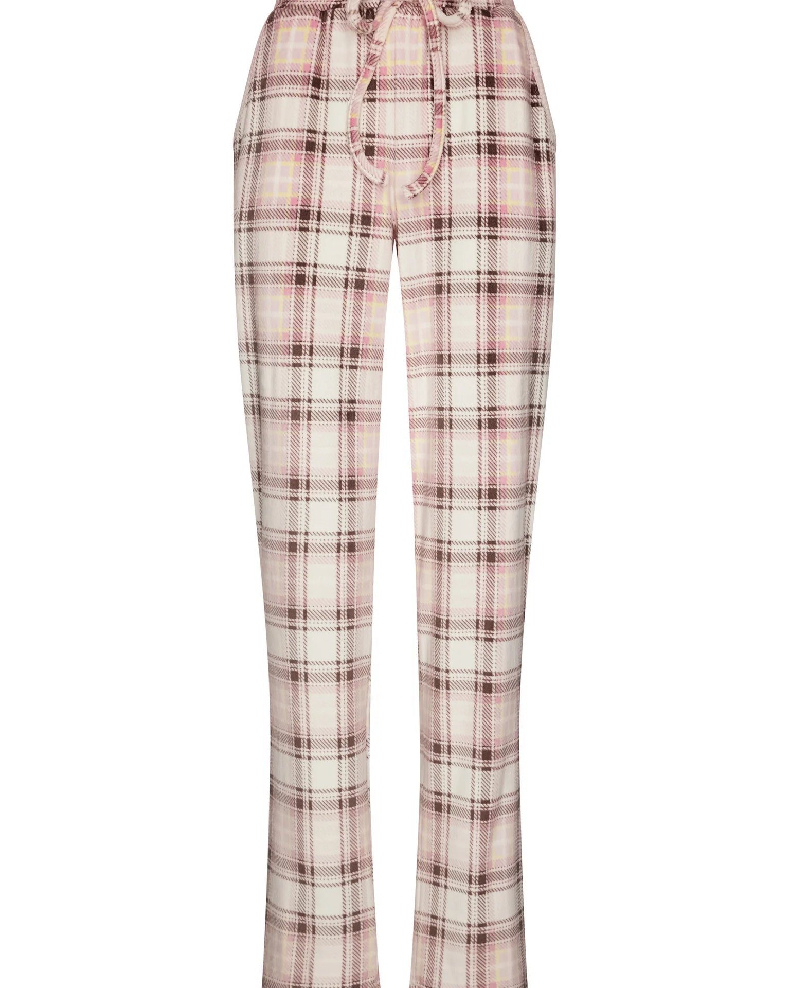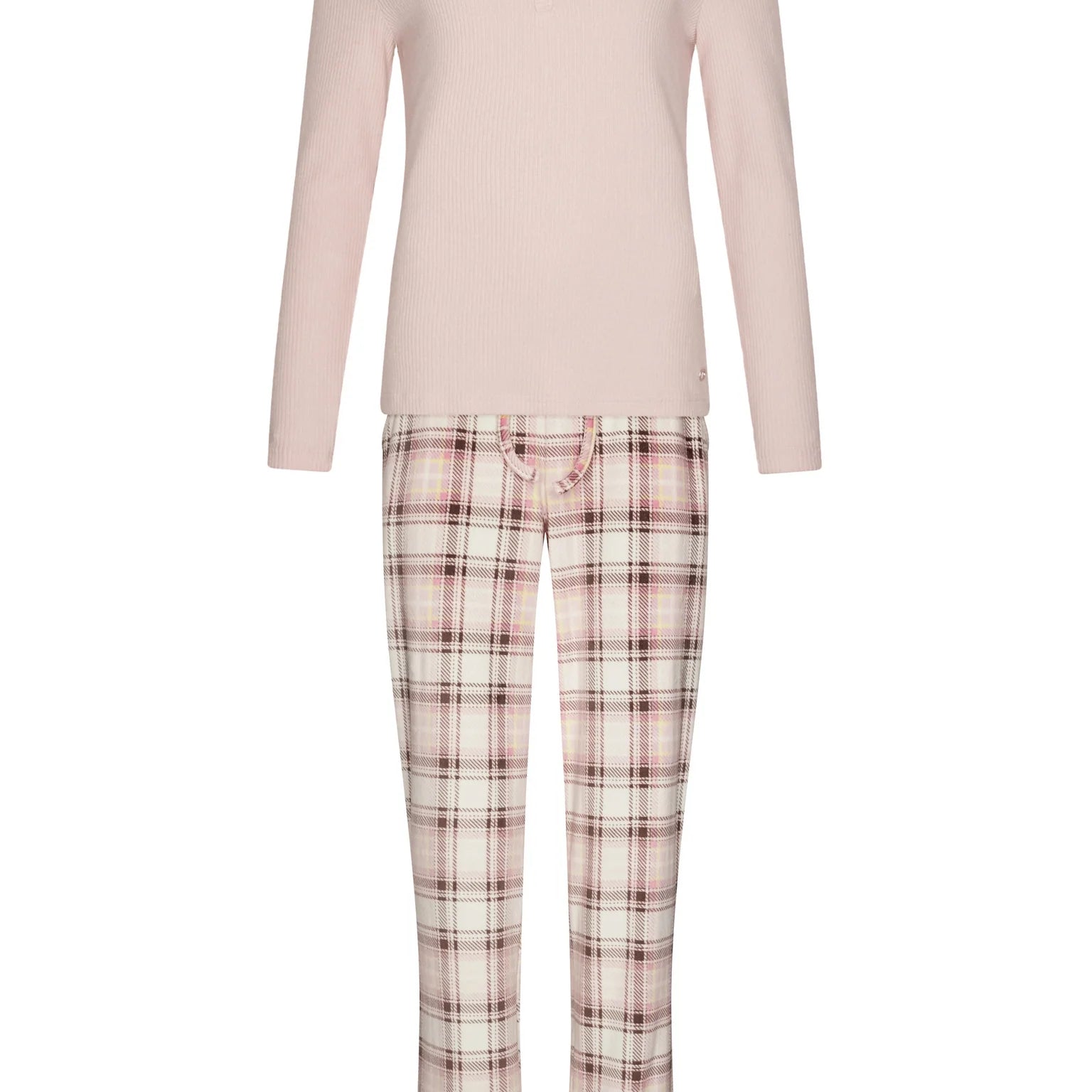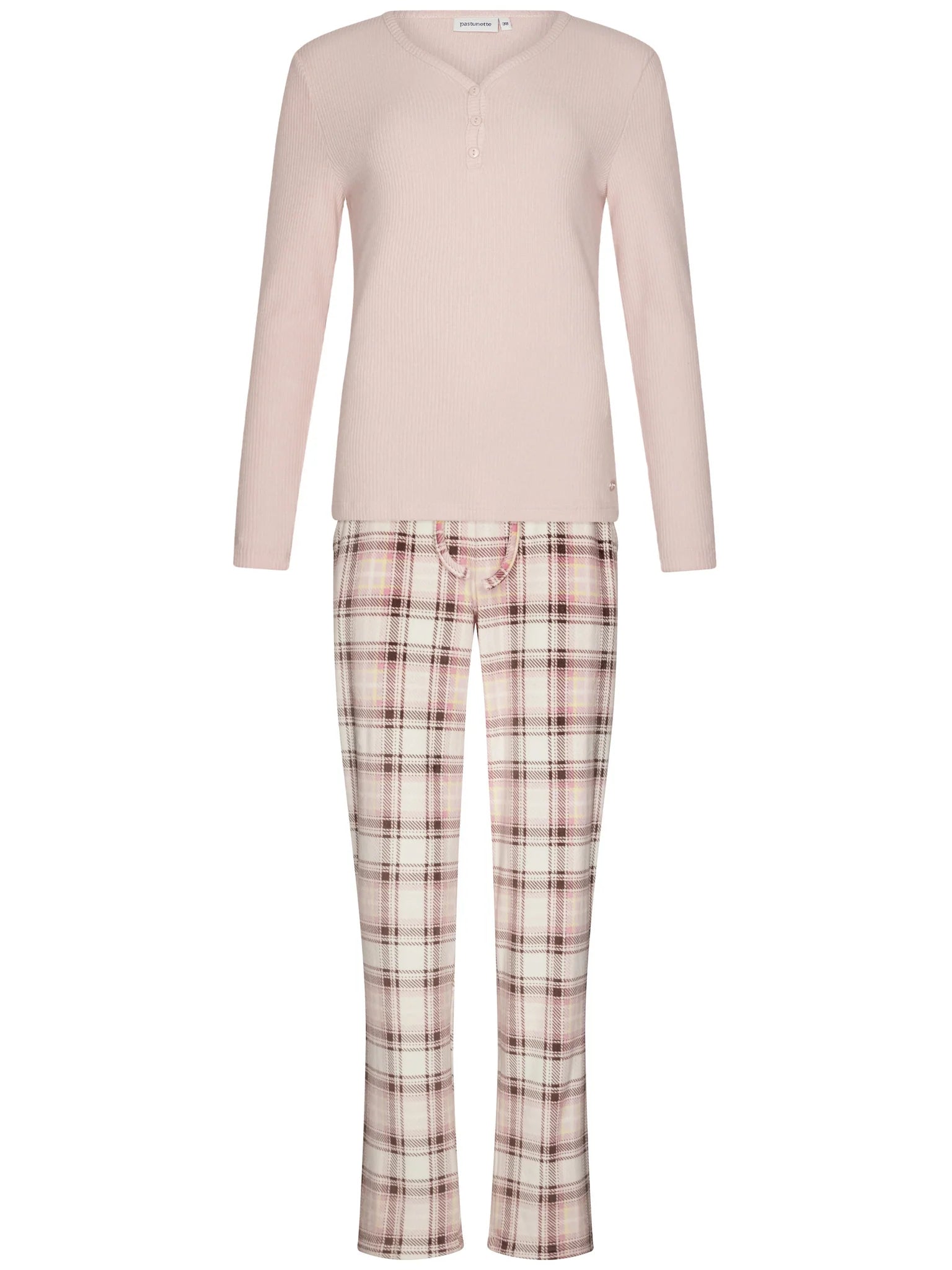 Pastunetten unelman pehmeä fleece-oloasu. Roosan värisessä puserossa on ribattu neulos ja naisellinen v-pääntie napeilla. Housuissa on ekrun värisellä pohjalla tyylikäs ruutukuvio. Joustava vyötärönauha kiristysnauhalla varmistaa täydellisen istuvuuden, ja housuissa on kätevät taskut.