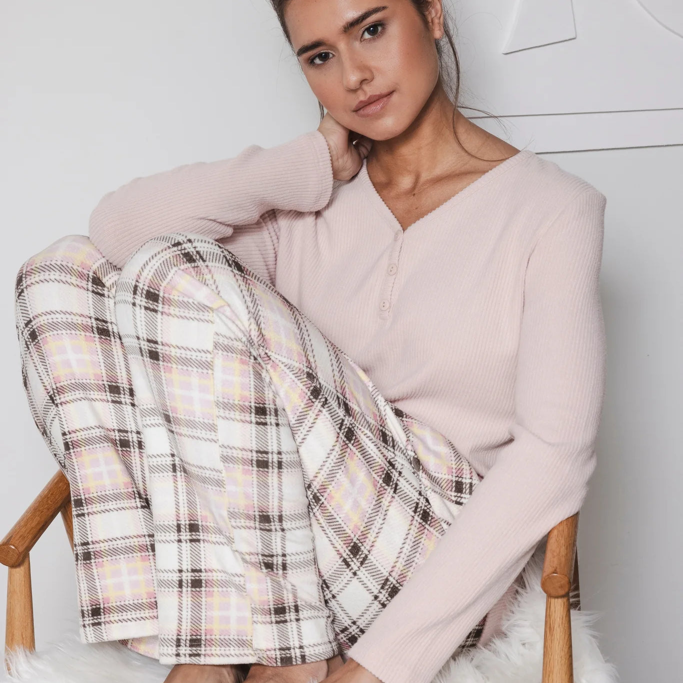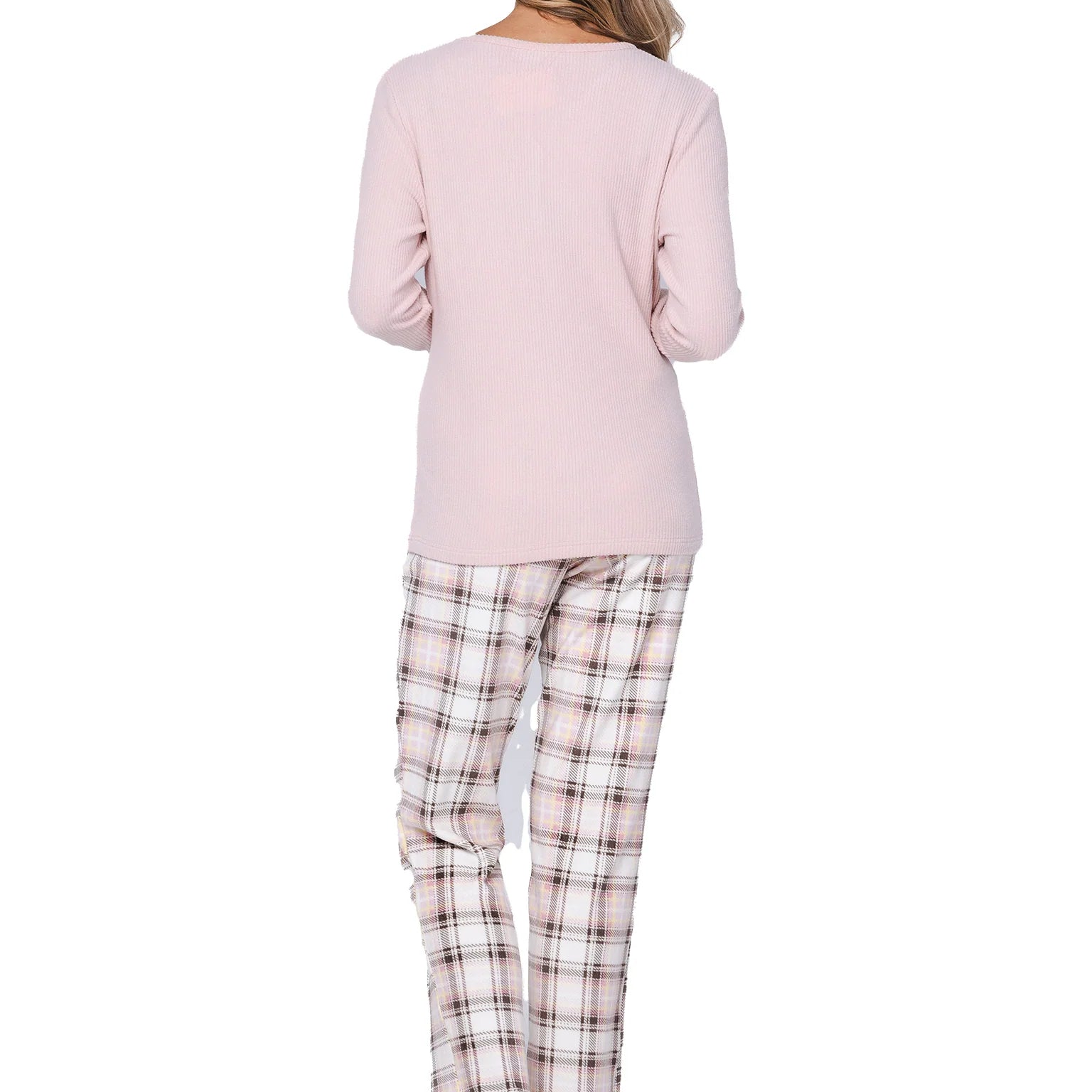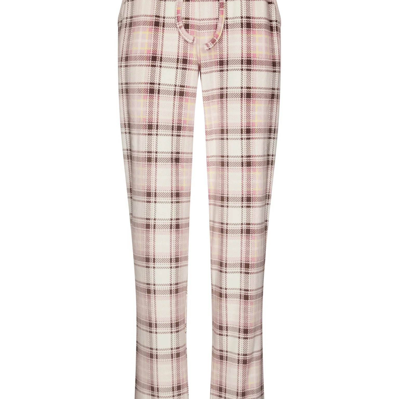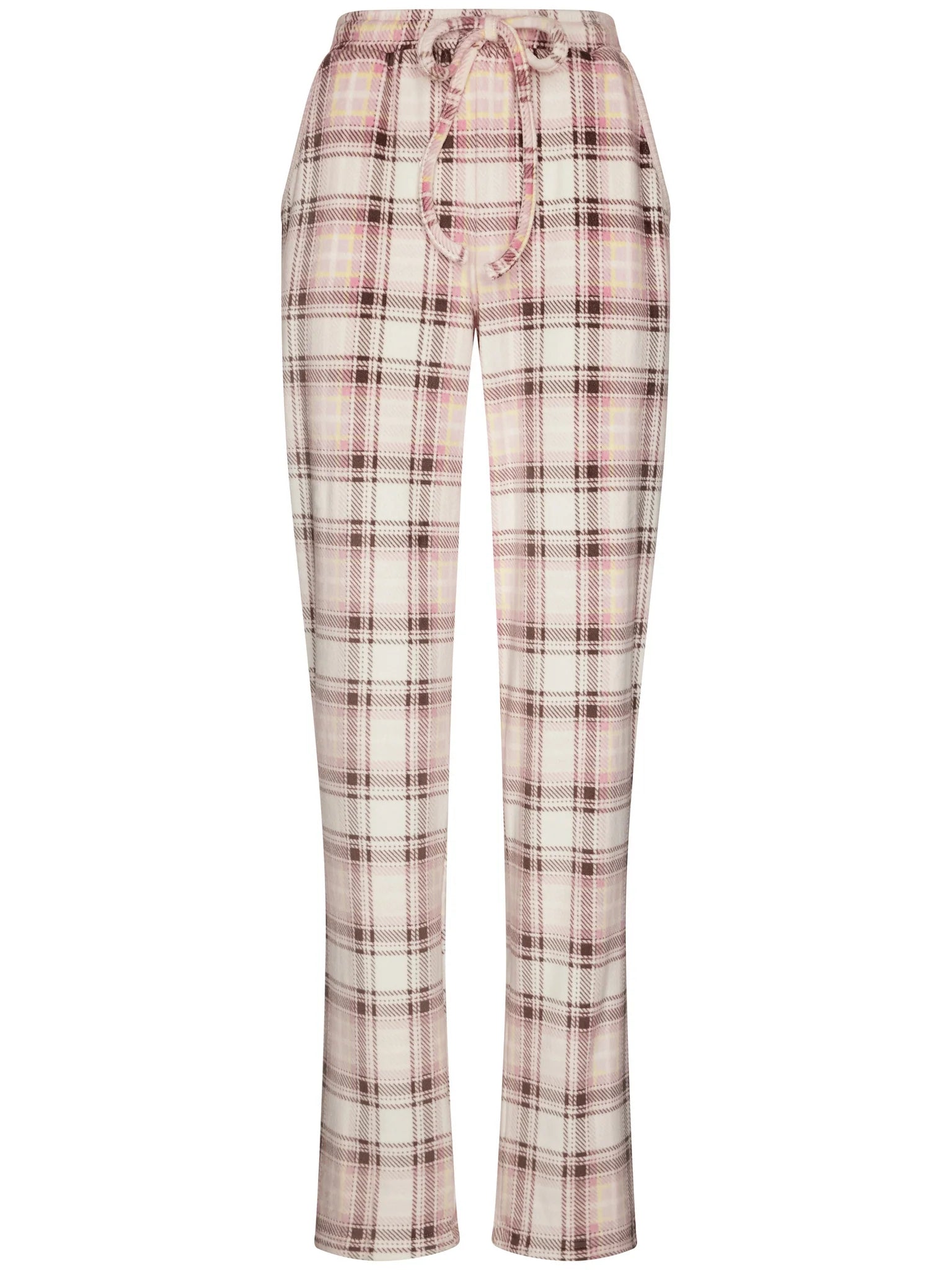 Pastunetten unelman pehmeä fleece-oloasu. Roosan värisessä puserossa on ribattu neulos ja naisellinen v-pääntie napeilla. Housuissa on ekrun värisellä pohjalla tyylikäs ruutukuvio. Joustava vyötärönauha kiristysnauhalla varmistaa täydellisen istuvuuden, ja housuissa on kätevät taskut.