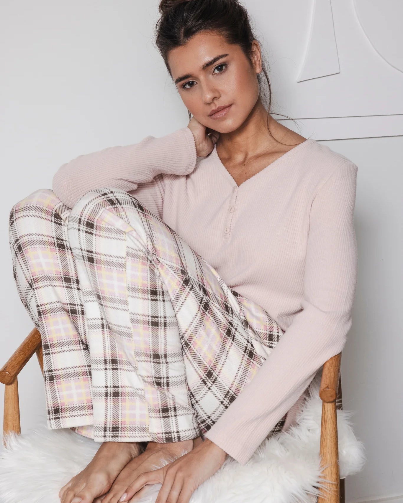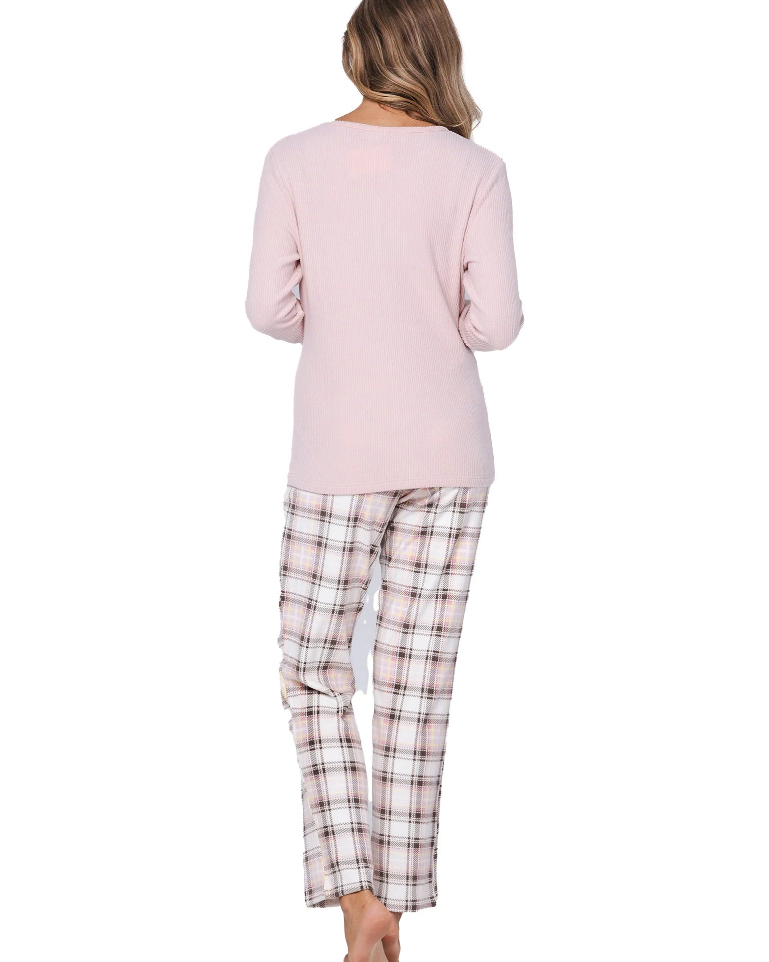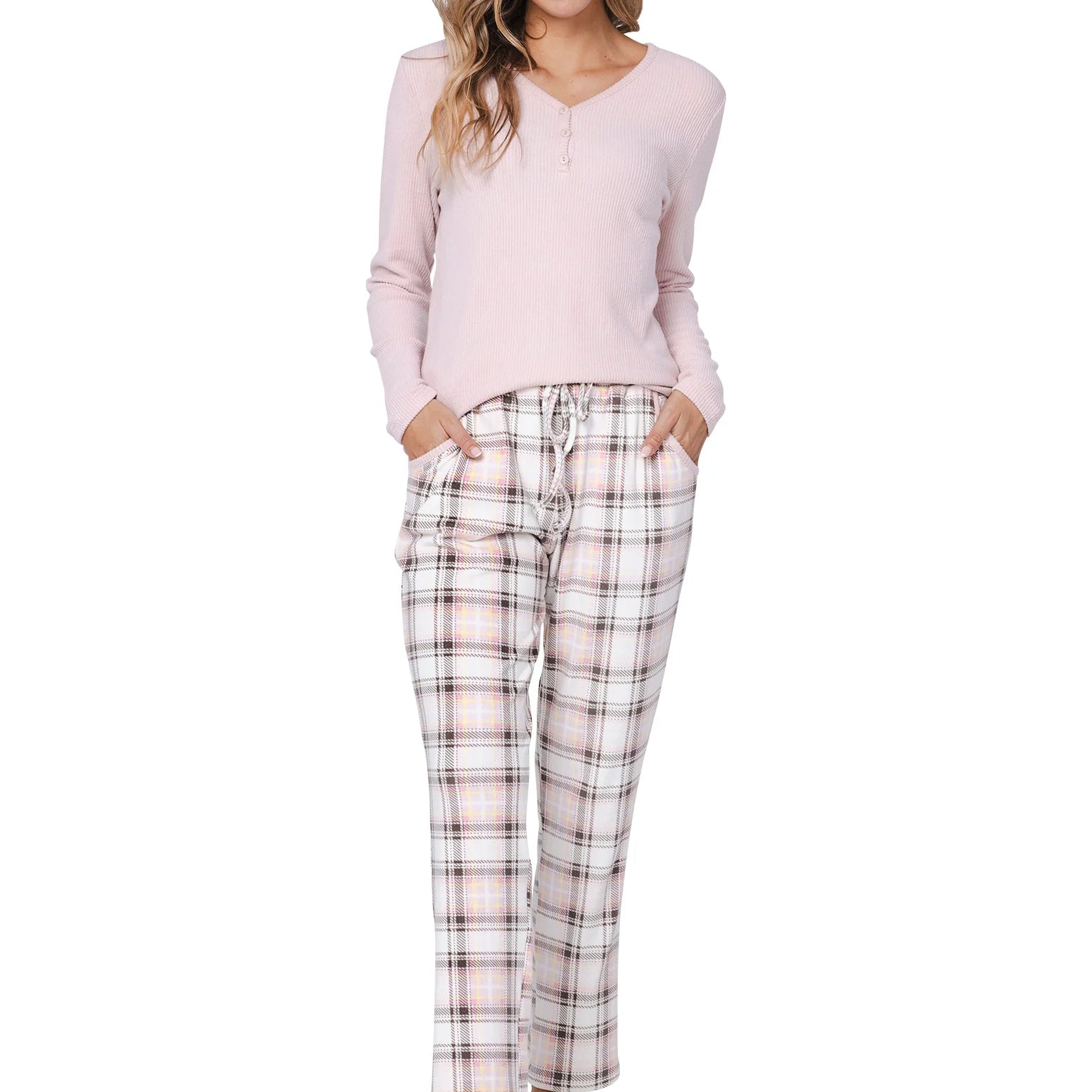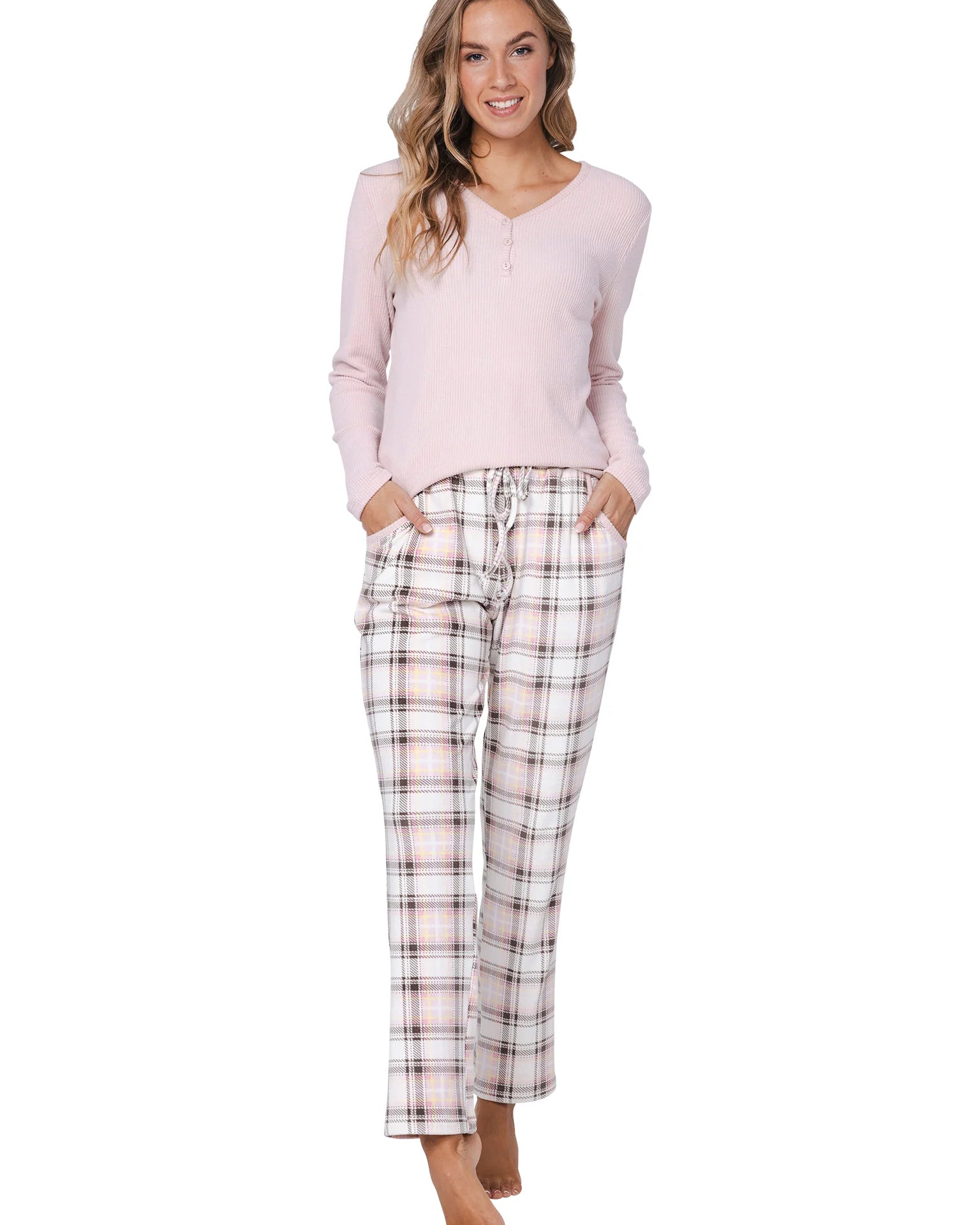 Pastunetten unelman pehmeä fleece-oloasu. Roosan värisessä puserossa on ribattu neulos ja naisellinen v-pääntie napeilla. Housuissa on ekrun värisellä pohjalla tyylikäs ruutukuvio. Joustava vyötärönauha kiristysnauhalla varmistaa täydellisen istuvuuden, ja housuissa on kätevät taskut.