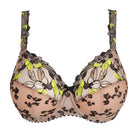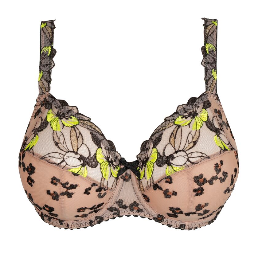 PrimaDonna Manali kaarituellinen rintaliivi toppaamattomalla tukevalla kupilla. Upea ja näyttävä musta pitsibrodeeraus leopardikuosia muistuttavalla kuvionnilla beigessä pohjavärissä. Ripaus limenvihreää. Kupissa kaksinkertainen materiaali ja ihoa vasten ihanan silkkisen tuntuinen pinta. Säädettävät olkaimet levenevät koon mukana.