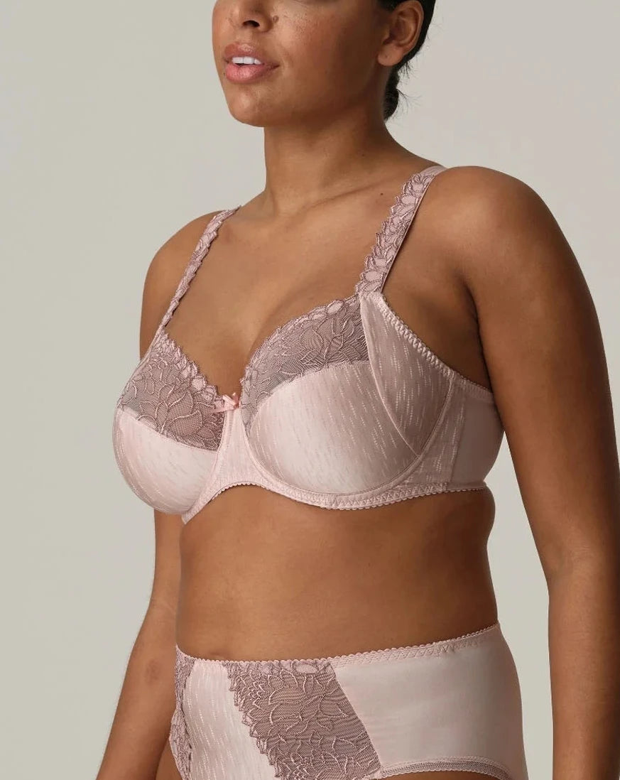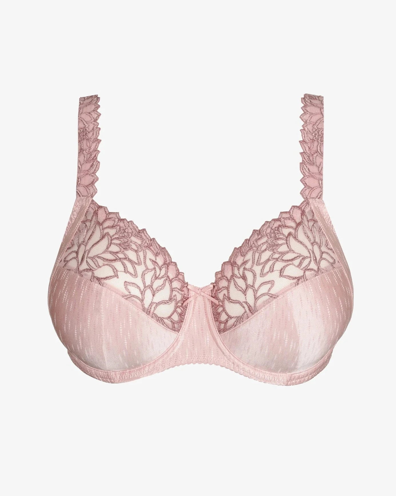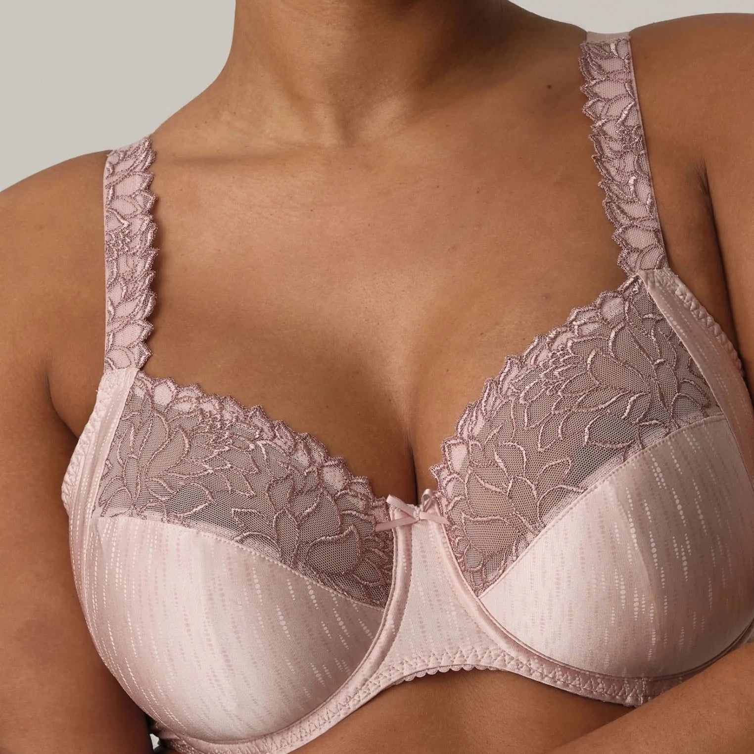 Primadonna Monterrey kaarituellinen rintaliivi ilman toppausta. Kokokuppinen kuppimalli, jossa sisäpuolella alaosassa puuvillainen vuori. Kuppiosa tukee hyvin ja antaa kauniin, luonnollisen muodon rinnalle. Säädettävät olkaimet. Värinä heleä hieman kiiltävä puuterinen vanharoosa, joka on helppo yhdistää myös vaaleiden vaatteiden alle.