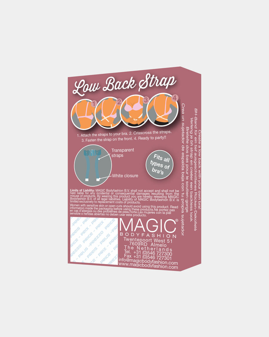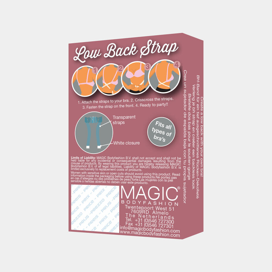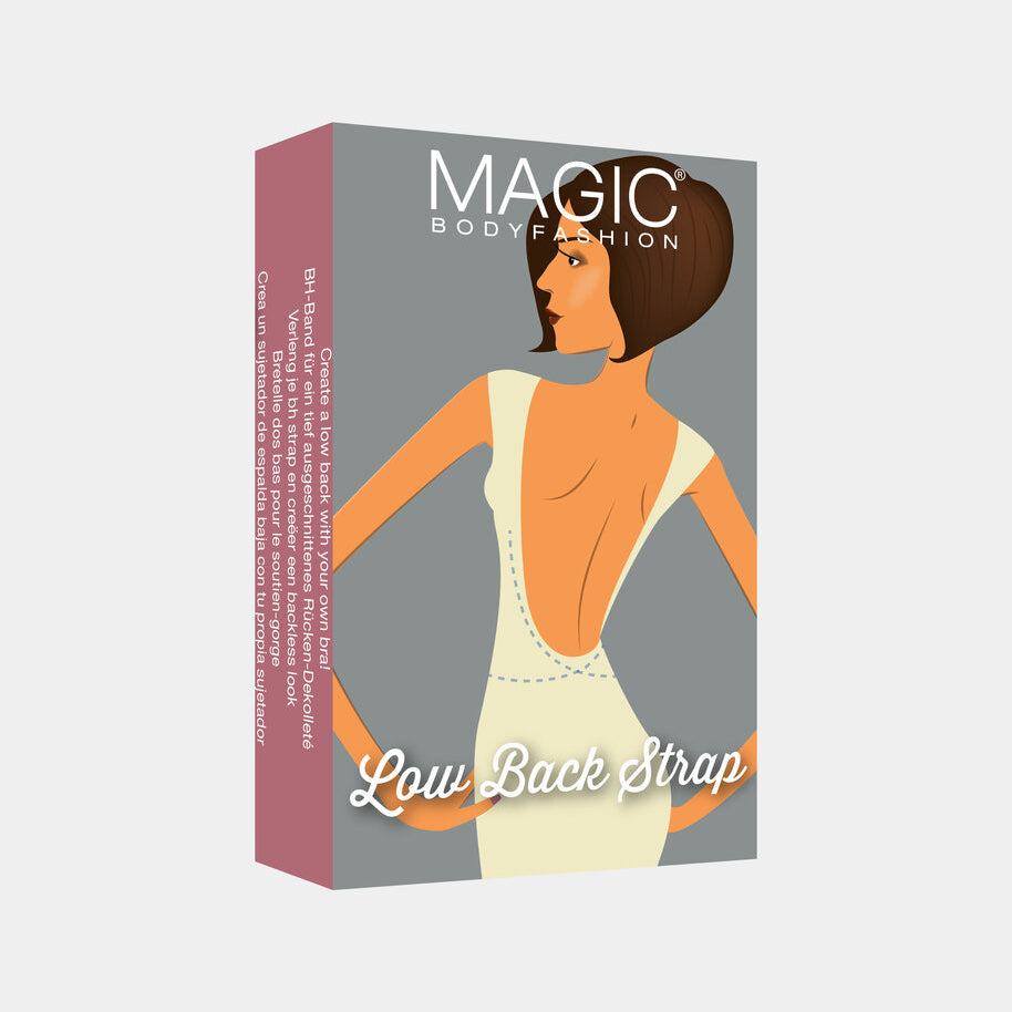 Magic Bodyfashion Low Back Strap -säädettävä silikoninen jatkonauha on käytännöllinen valinta avoselkäisille toppeille ja mekoille. Voidaan kiinnittää useimpiin rintaliiveihin. Se kiinnitetään rintaliivien takahakasiin ja kiristetään sitten vartalon ympärille, ja kiinnitetään kappaleet yhteen klipsulla kehon etupuolelle.