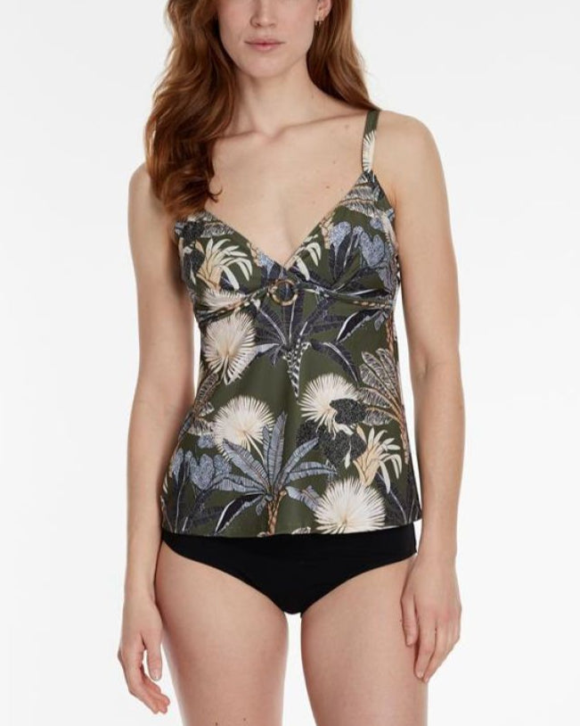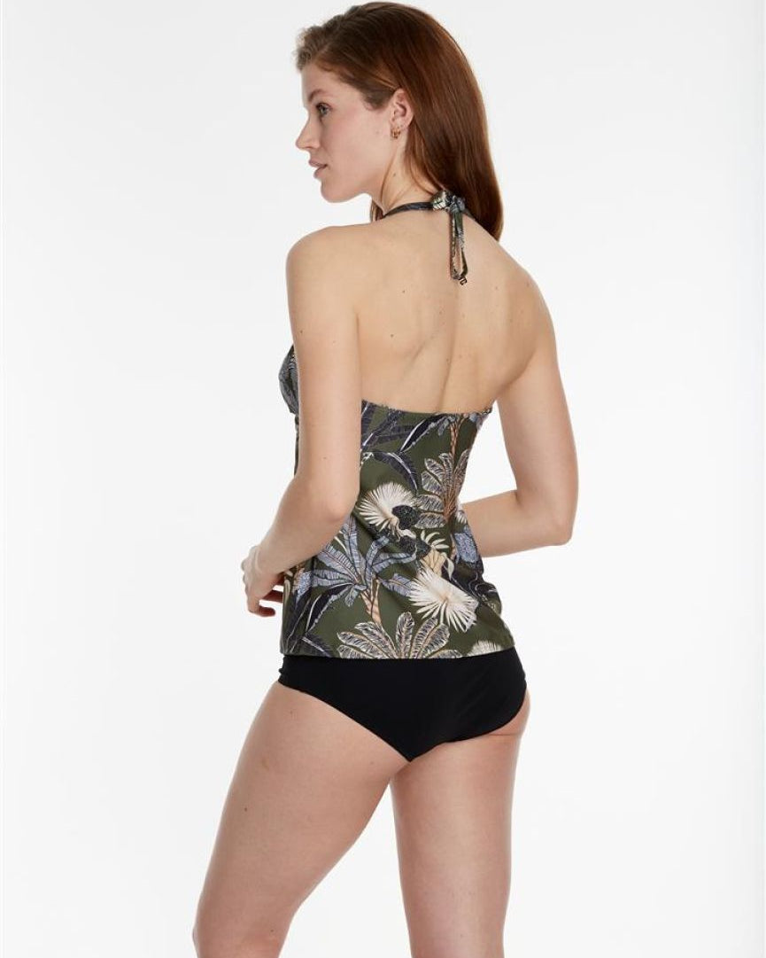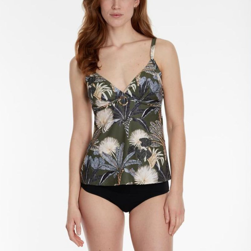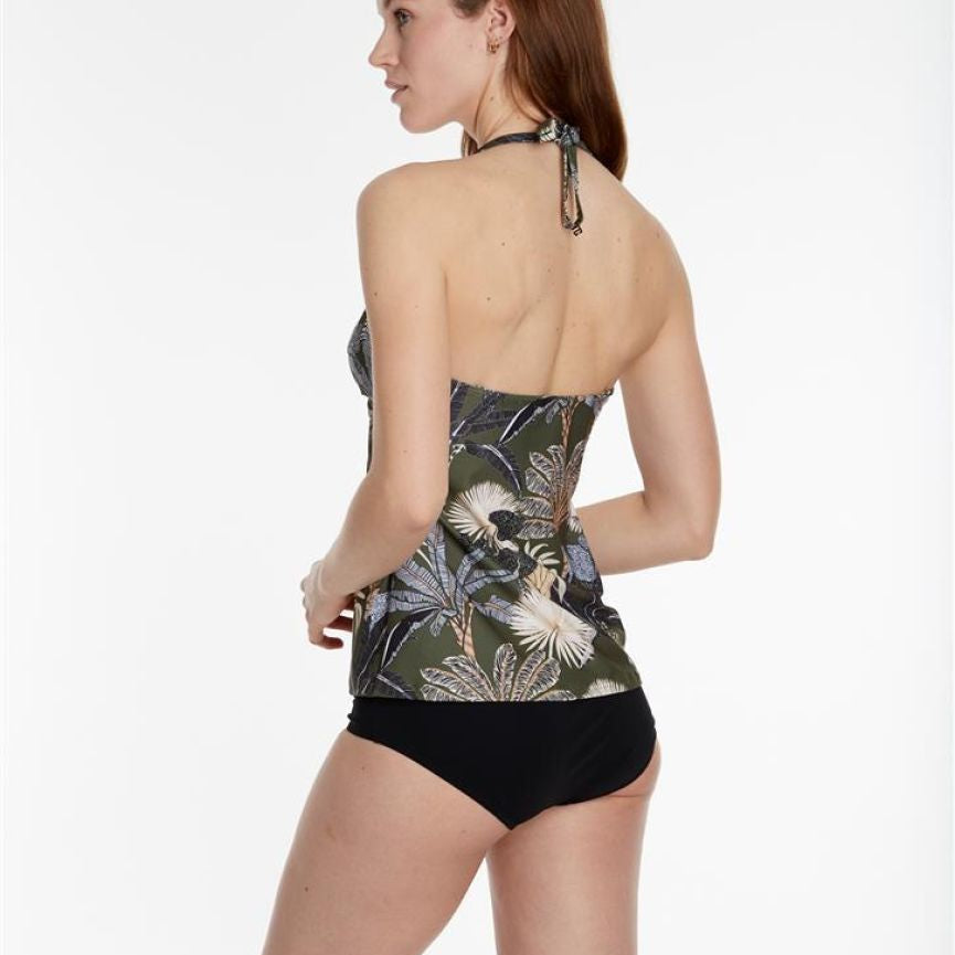 Sunflair 78004 tankini ja korkean mallinen housu. Kaunis khakin vihreä sävy beige-mustalla kuvionnilla. Koristerinkula sekä nauhat edessä. Kevyesti topatut kupit ja sauma/leikkaus rintojen alla. Yläosassa on myös tukivuoraus napakalla mesh -verkolla selkäosassa, joten liiviosa tuntuu tukevalta. Säädettävät olkaimet, jotka saa laitettua myös niskalenkille. Suora selkäosa ja hieman a -mallinen helma. Musta korkea housumalli. Tankinissa ja housussa ei ole vuorausta, joten se kuivuu nopeasti