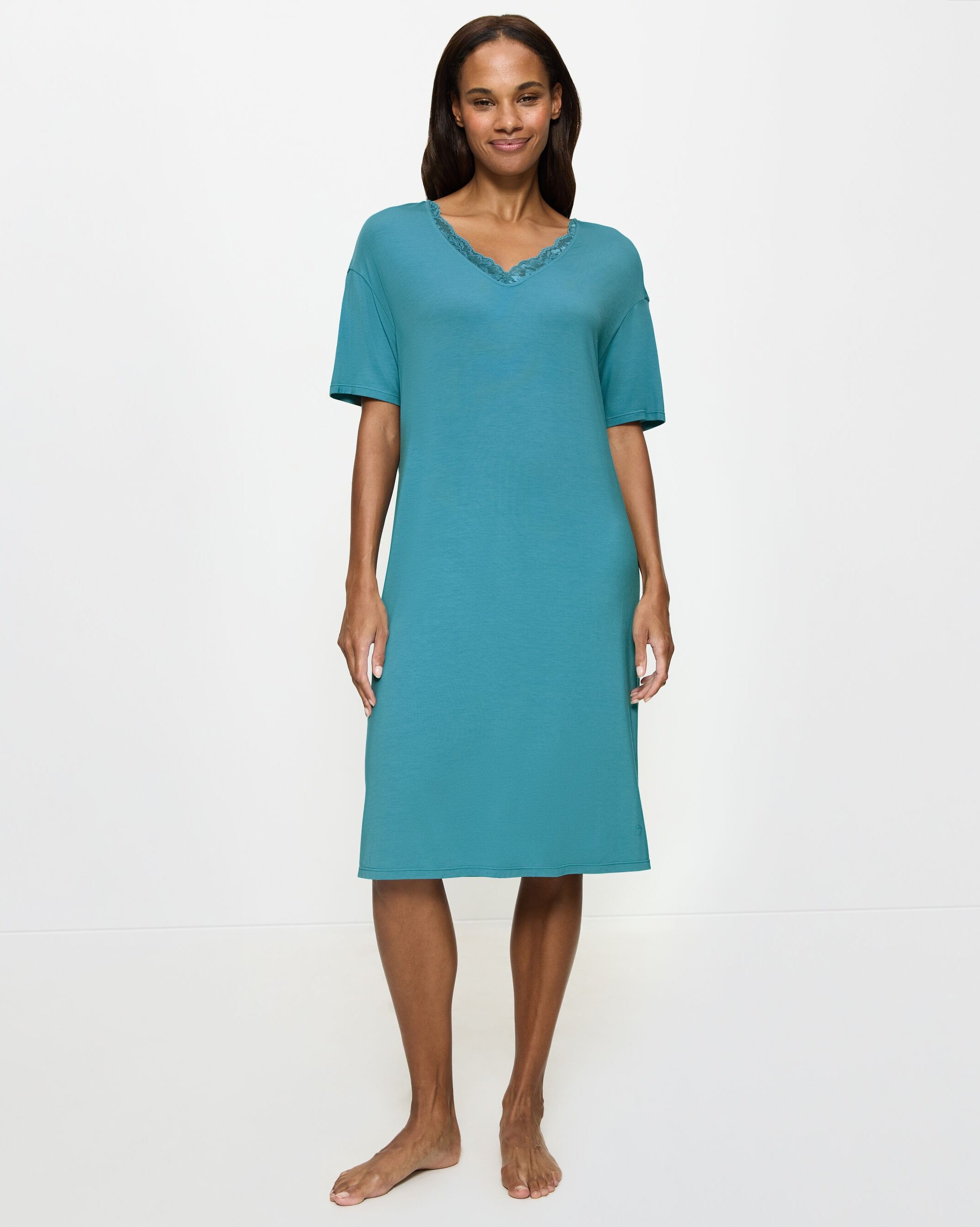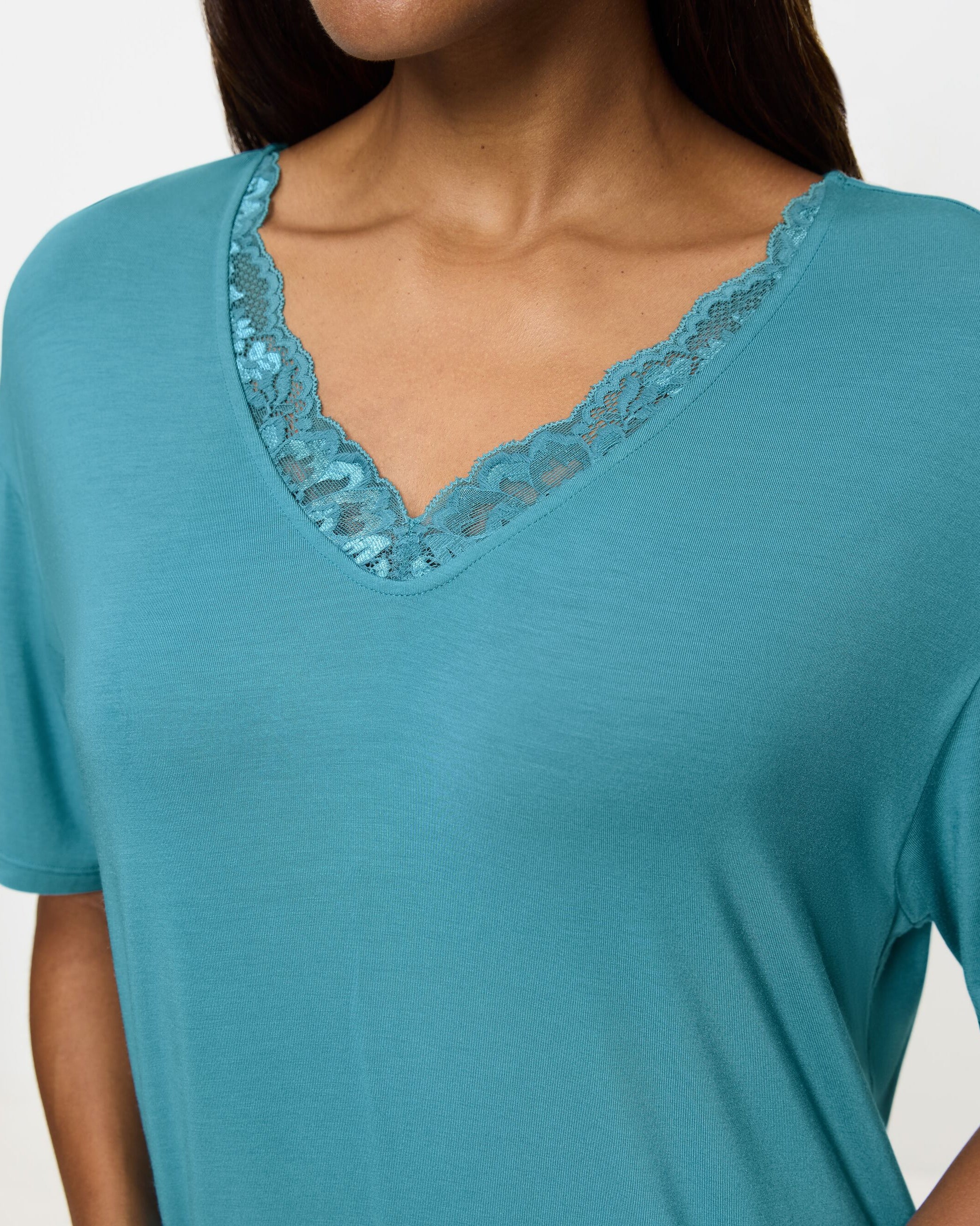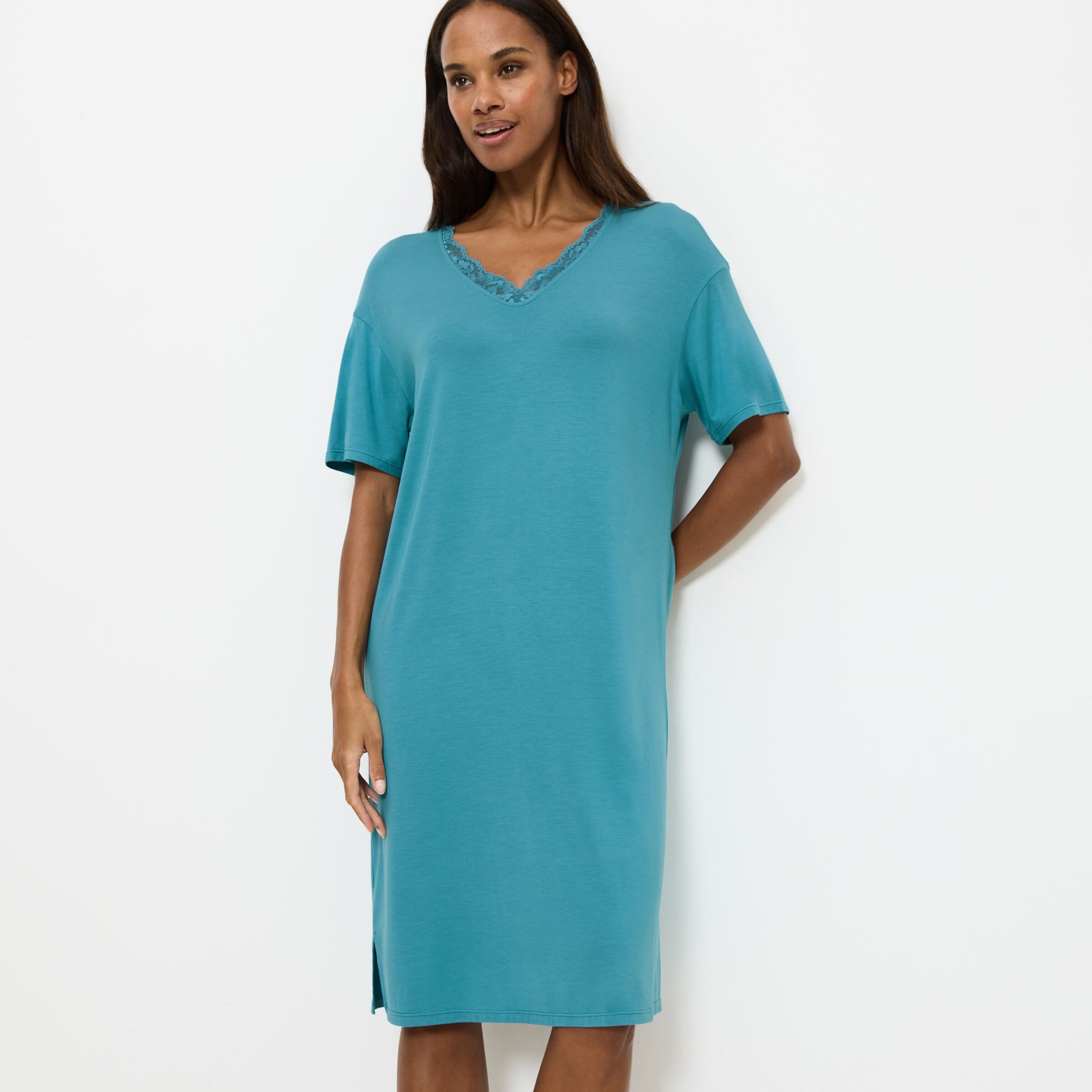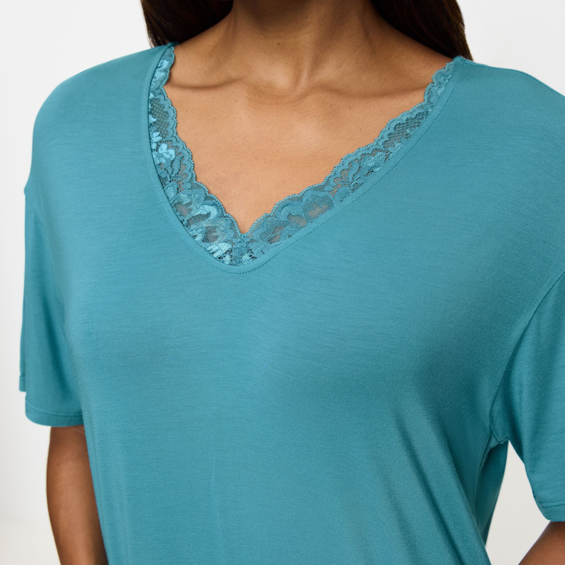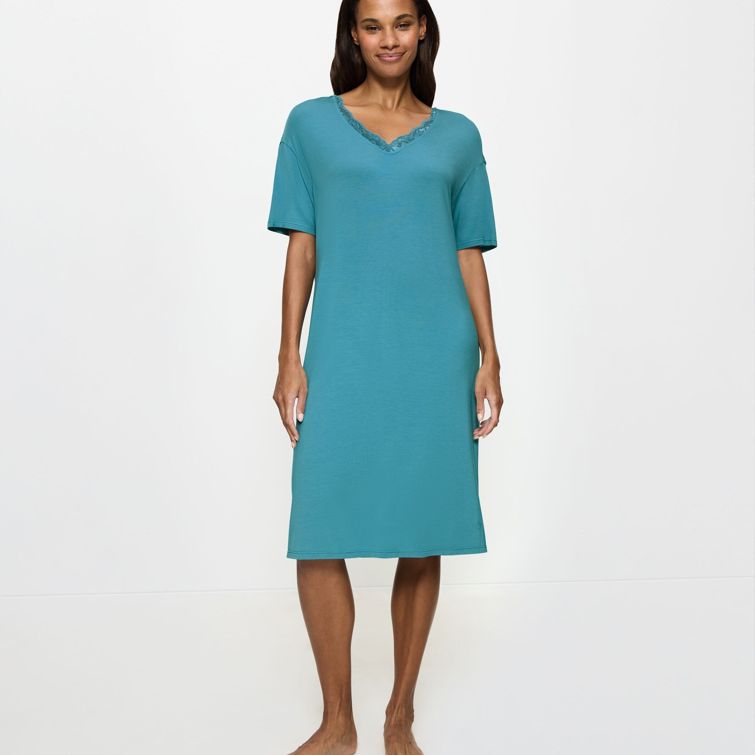 Triumph Timeless Sensuality yöpaita ihanan pehmeää ja joustavaa modaali elastaani materiaalia. Turkoosin värinen yöasu kauniilla pitsi yksityiskohdalla. Reilu / väljä mitoitus.