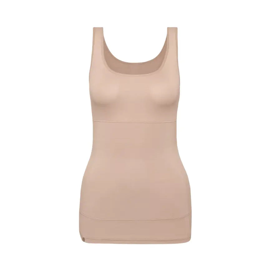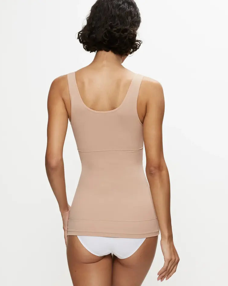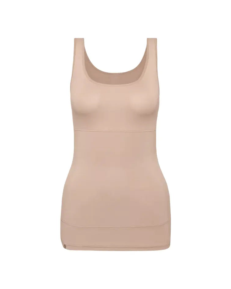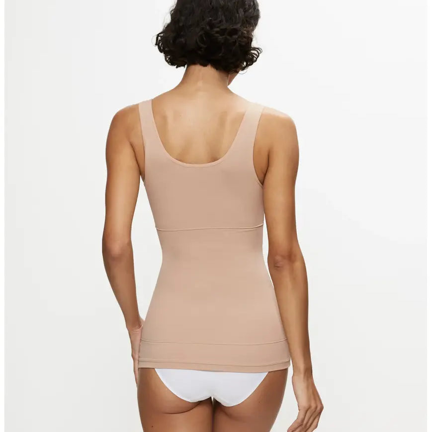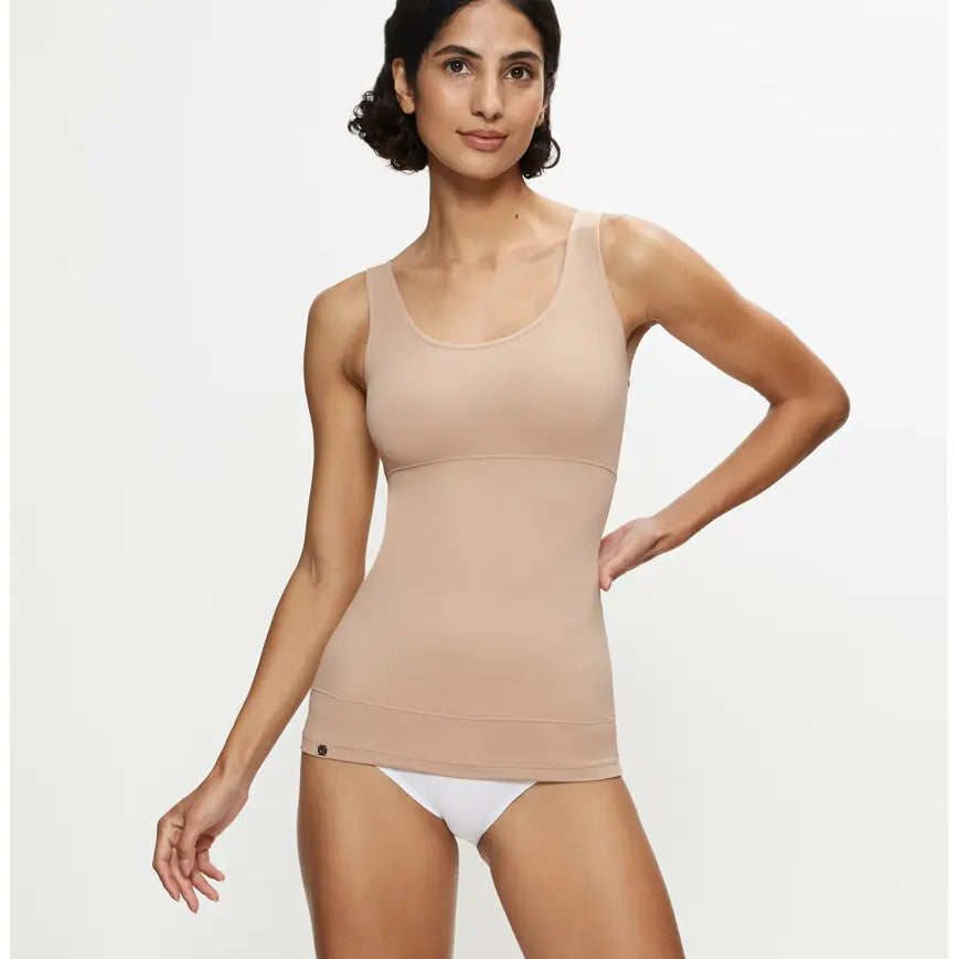 Triumph Trendy Sensation, kevyesti keskivartaloa muotoileva toppi. Yläosassa yksinkertainen kangas, joka ei litistä rintoja. Vatsa- ja selkäosa vuorattu sisäpuolelta tukevalla mesh-kankaalla.