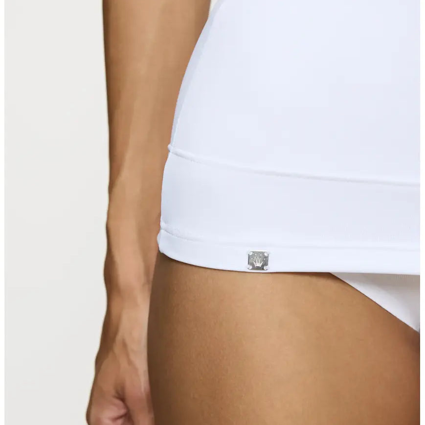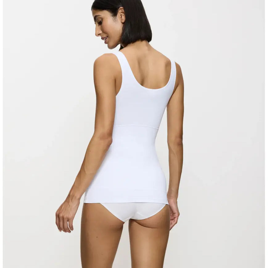 Triumph Trendy Sensation, kevyesti keskivartaloa muotoileva toppi. Yläosassa yksinkertainen kangas, joka ei litistä rintoja. Vatsa- ja selkäosa vuorattu sisäpuolelta tukevalla mesh-kankaalla.