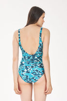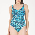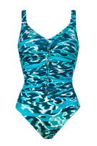 Charmline Aqua, kevyesti vartaloa muotoileva uimapuku. Ohuesti topattu rintaa tukeva kuppiosa ilman kaaritukea, ja vartaloa imartelevat rypytykset edessä. Kokonaan vuorattu. Eläväinen veden liikettä ja värejä imitoiva kuosi.