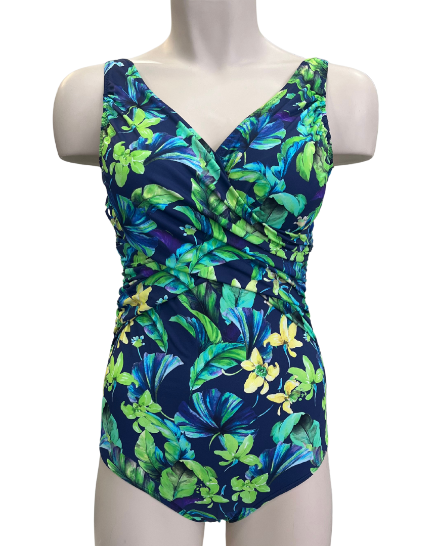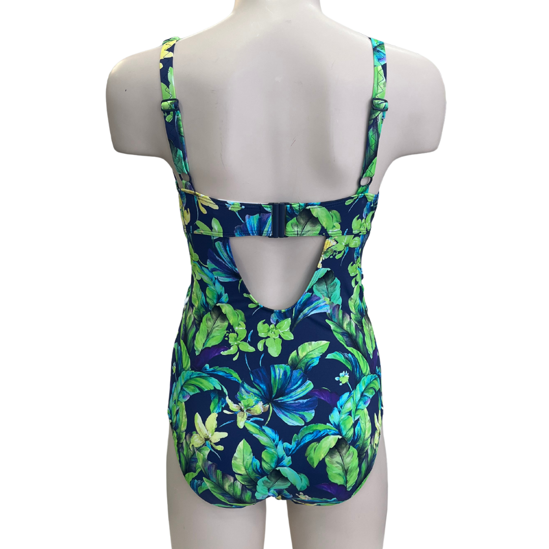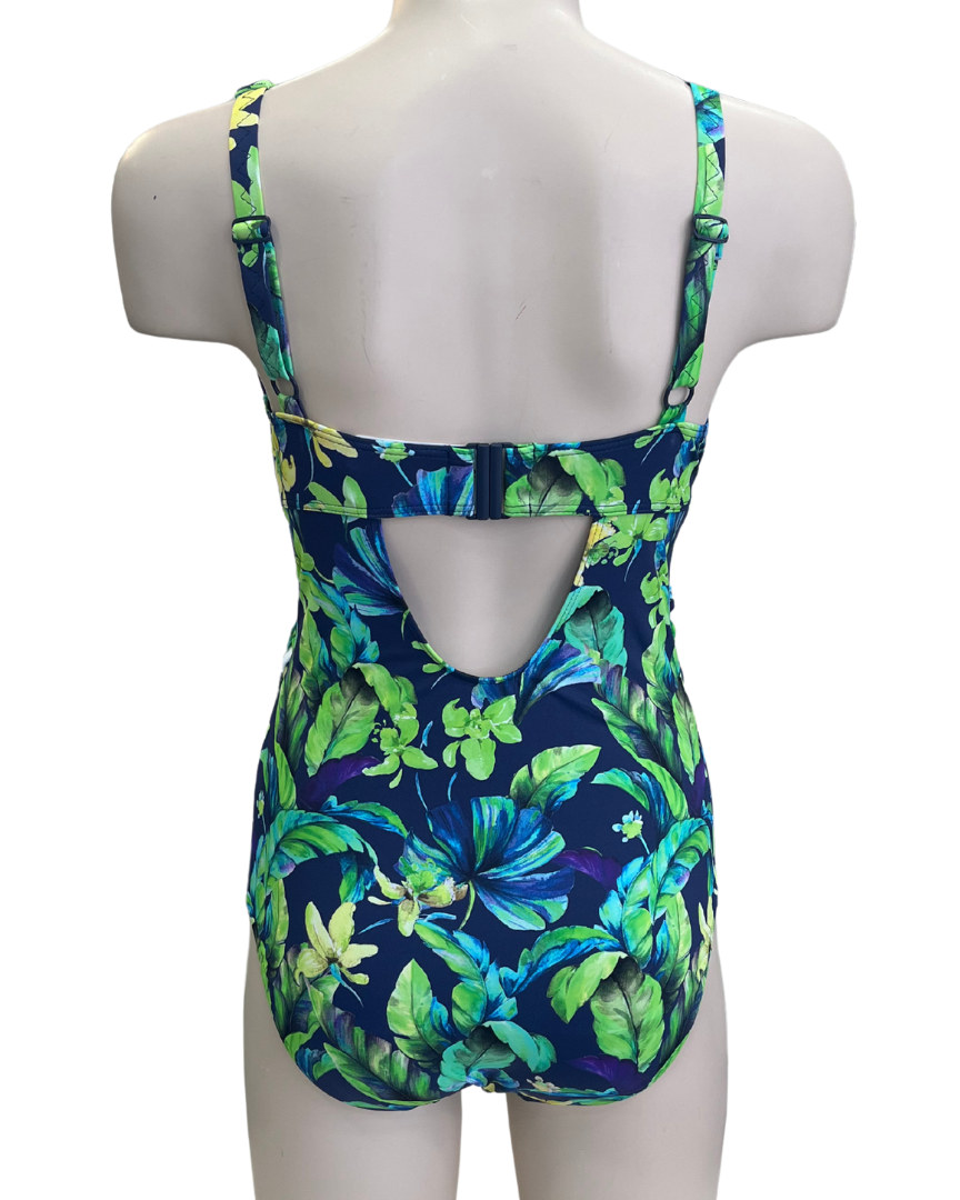 Saltabad Dolores sini-vihreäkuosinen kaarituellinen uimapuku, jossa on selkäpuolella kiinnitys, se helpottaa pukemista ja antaa hyvä tuen povelle.