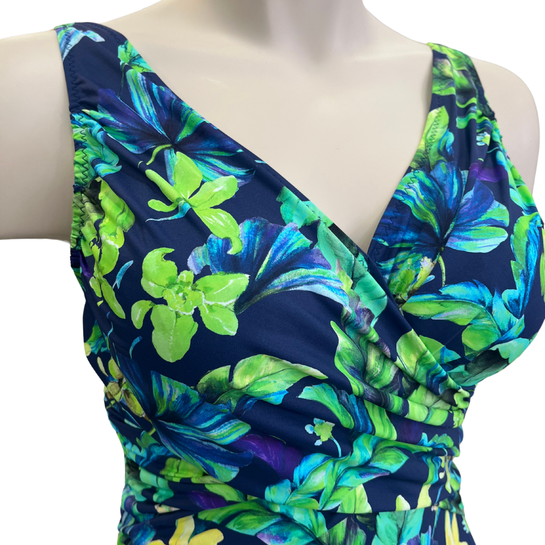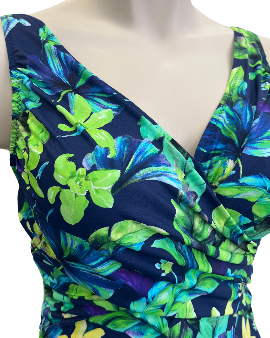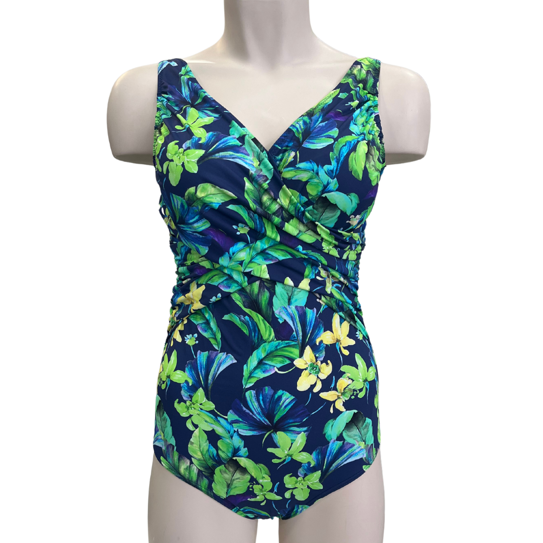 Saltabad Dolores sini-vihreäkuosinen kaarituellinen uimapuku, jossa on selkäpuolella kiinnitys, se helpottaa pukemista ja antaa hyvä tuen povelle.