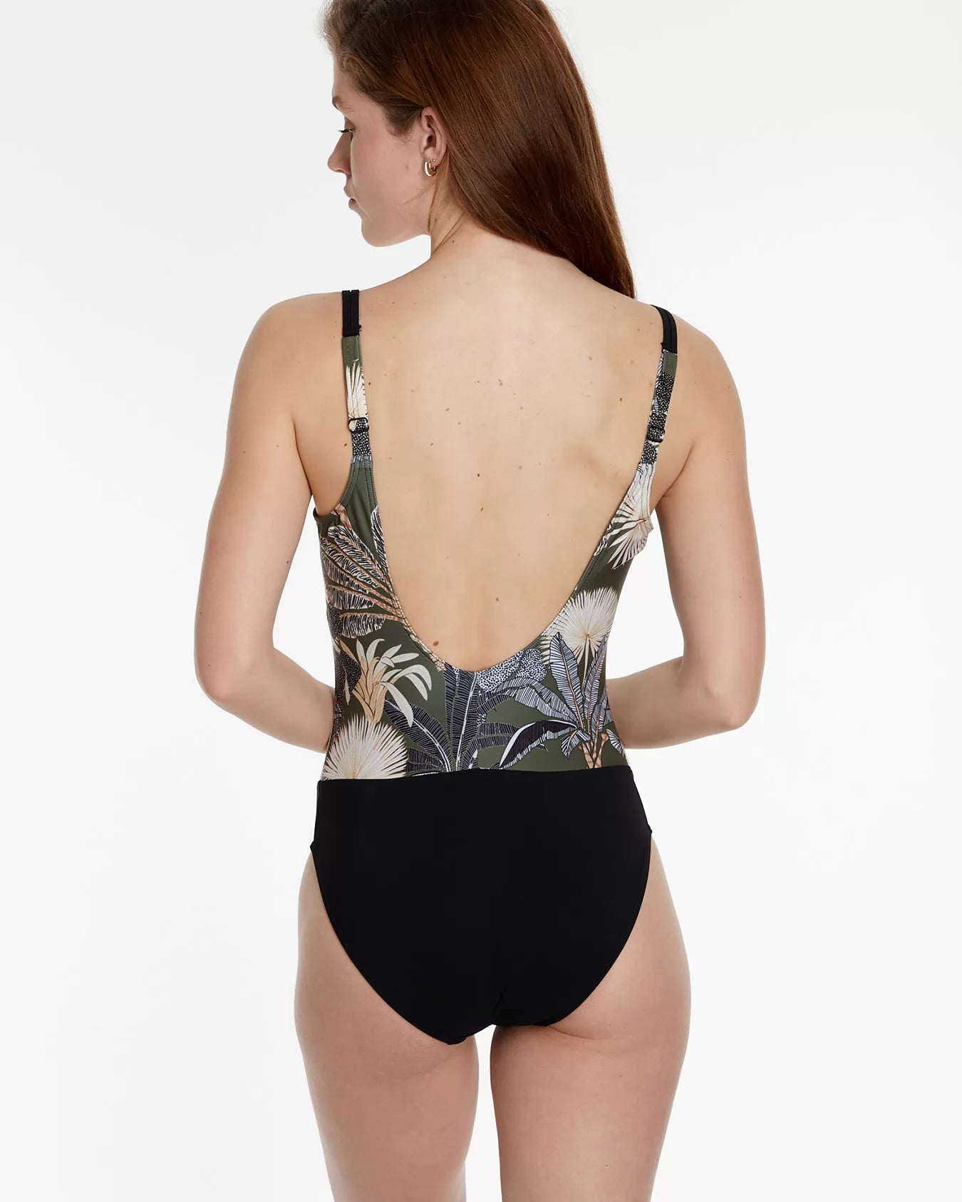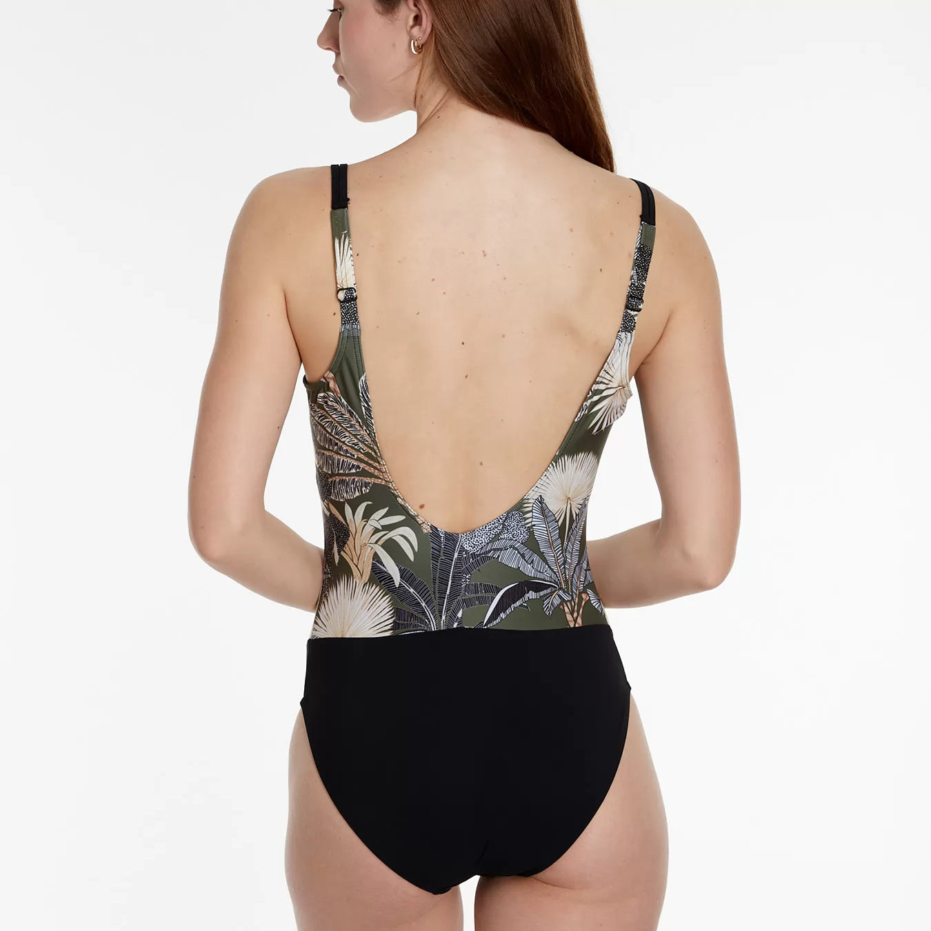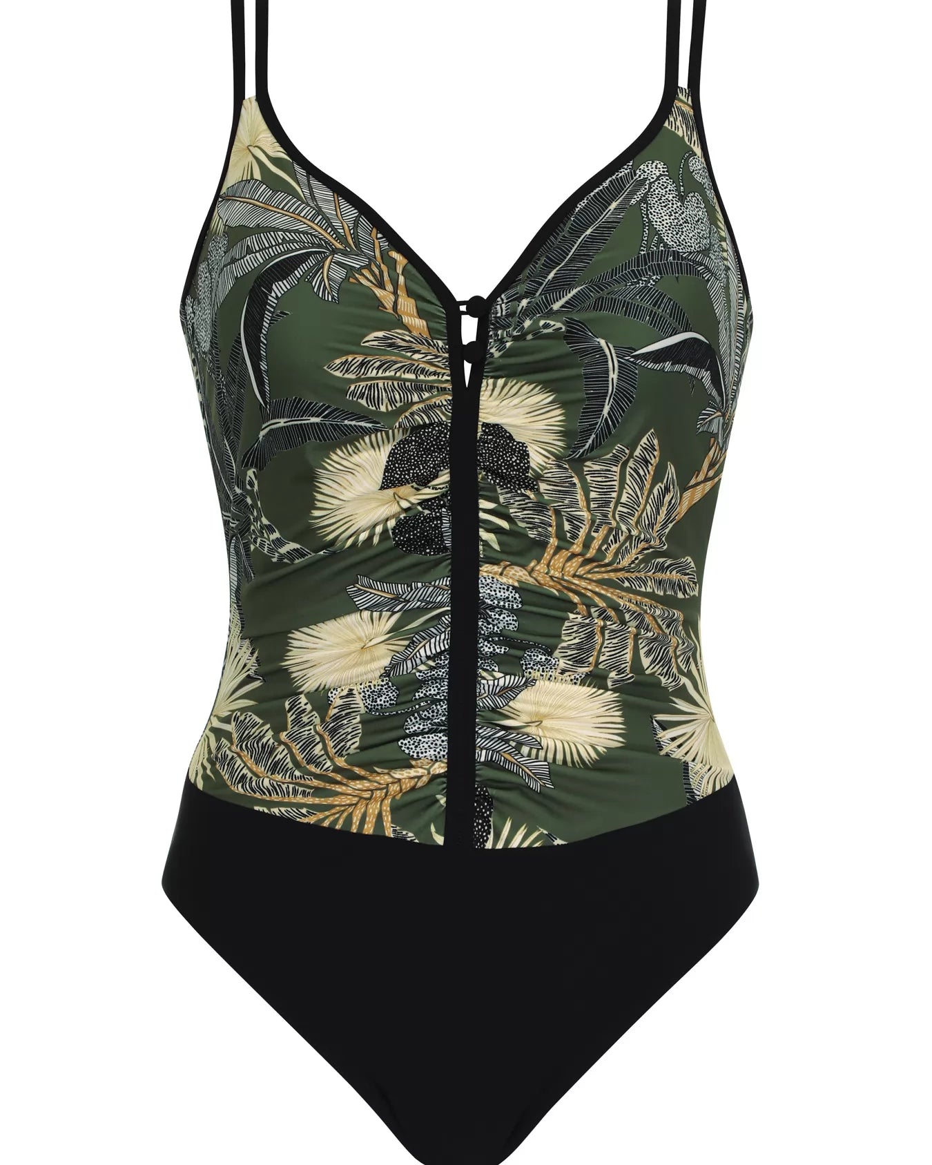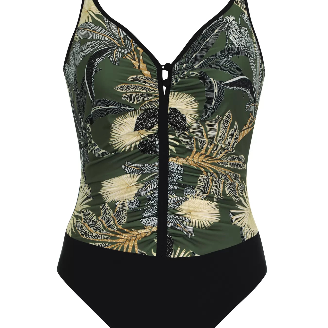Sunflair Khaki uimapuku. Kaunis vihreän sävyinen yksityiskohtainen kokopuku. Musta-beige kuviointi ja yksivärinen alaosa. Kuppiosa on kevyesti topattu. Näyttävät olkaimet, joissa säätö. Avara selkäosa. Etuosassa rypytys ja keskellä tukeva leikkaus. Edessä on myös hauskat nappi yksityiskohdat. Uimapuku on kevyesti vuorattu. Kierrätetty laadukas materiaali.