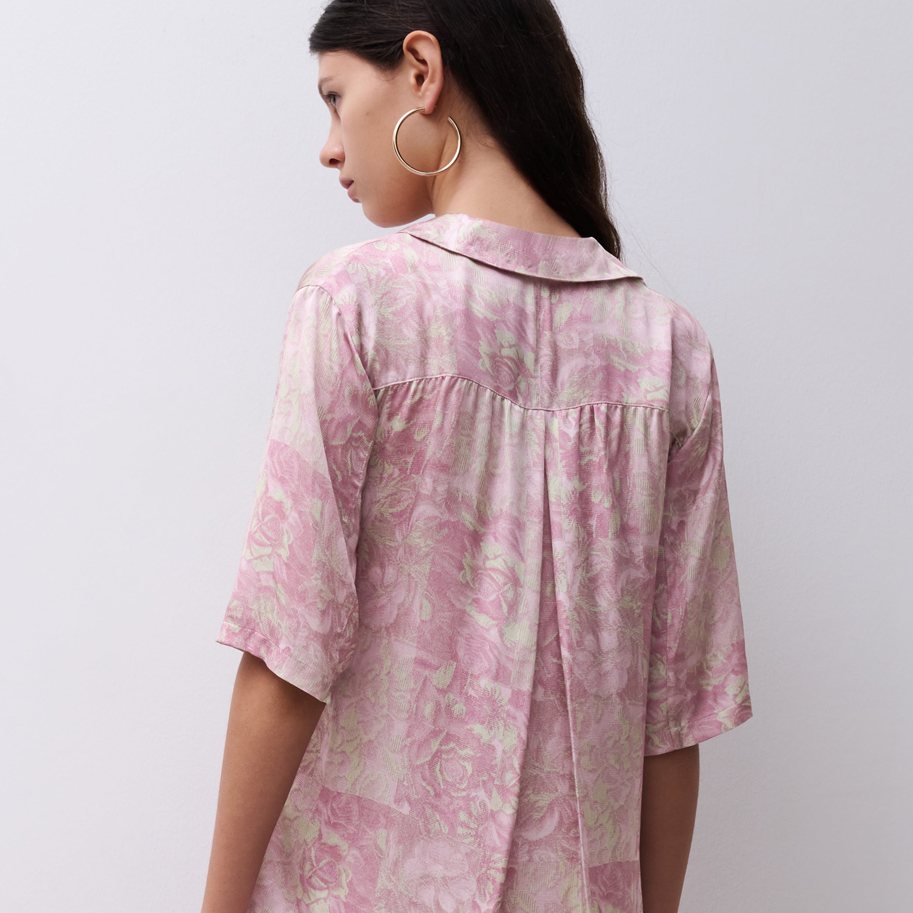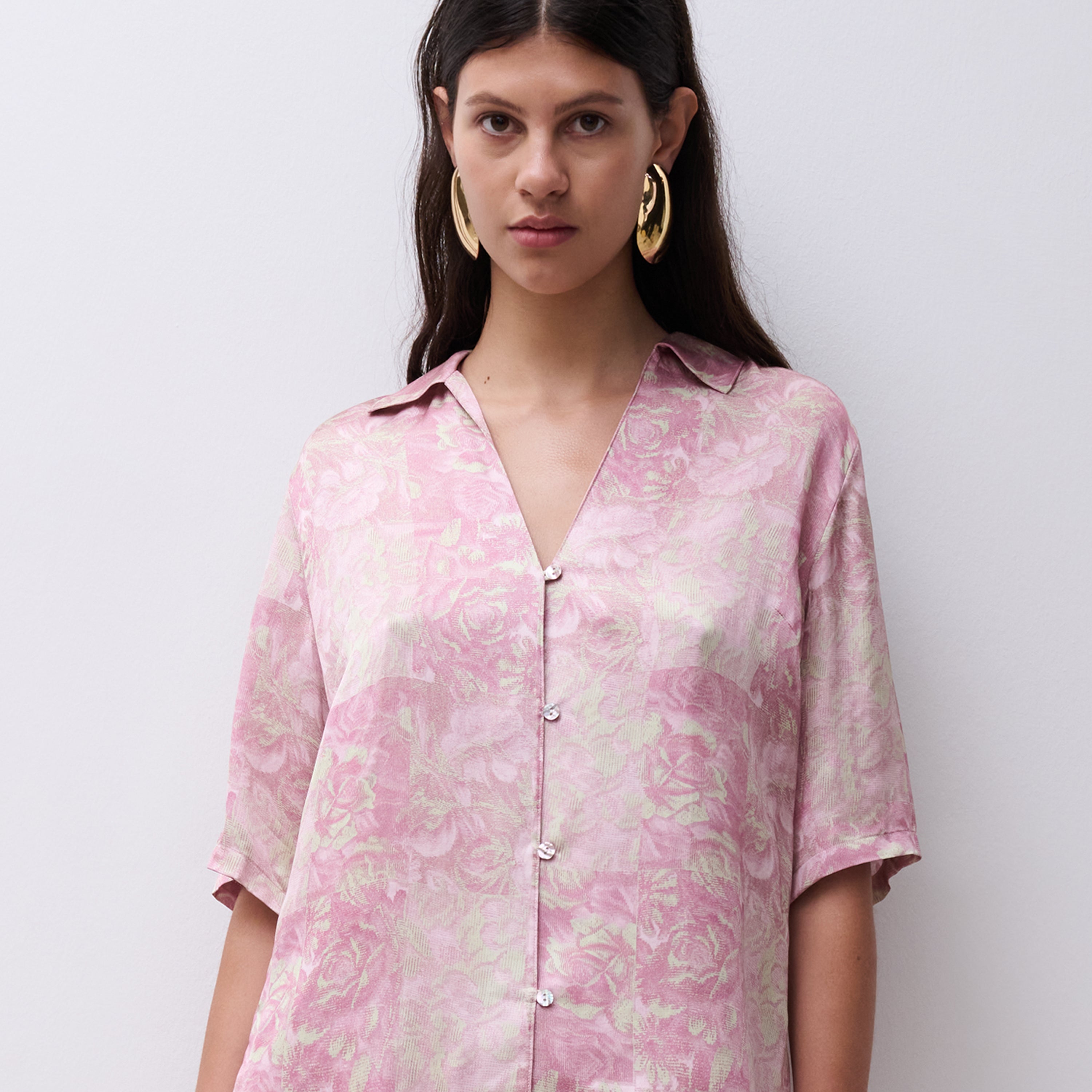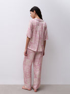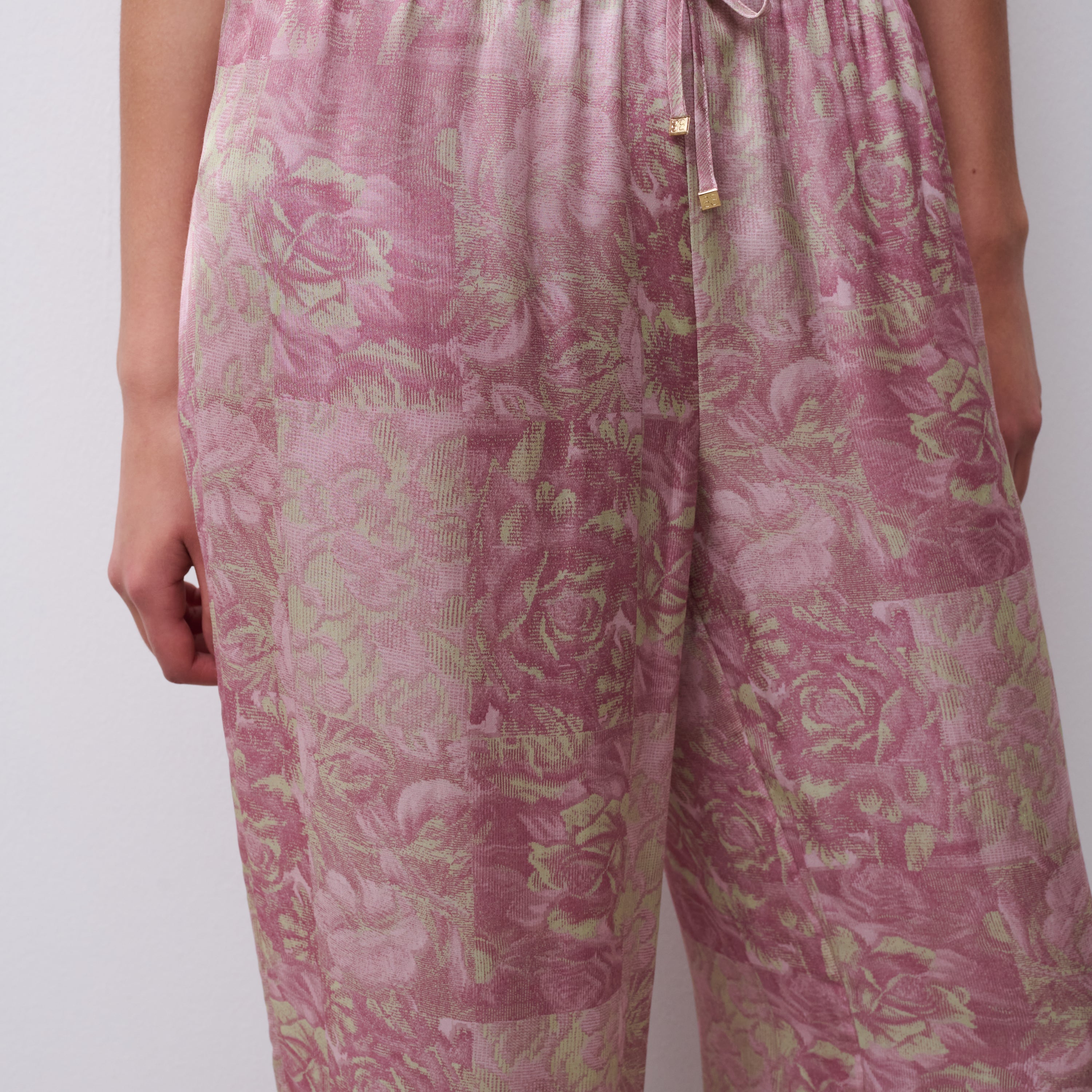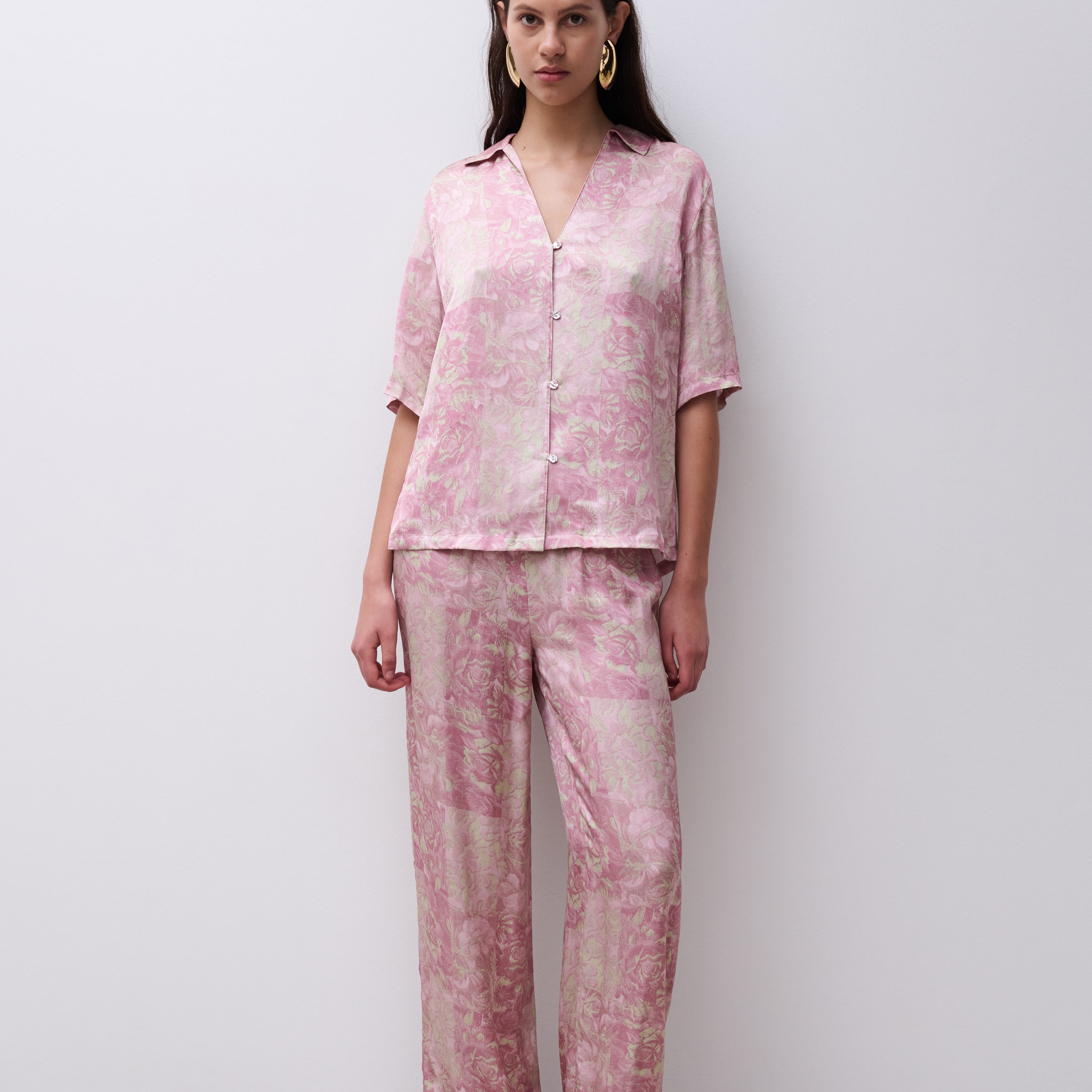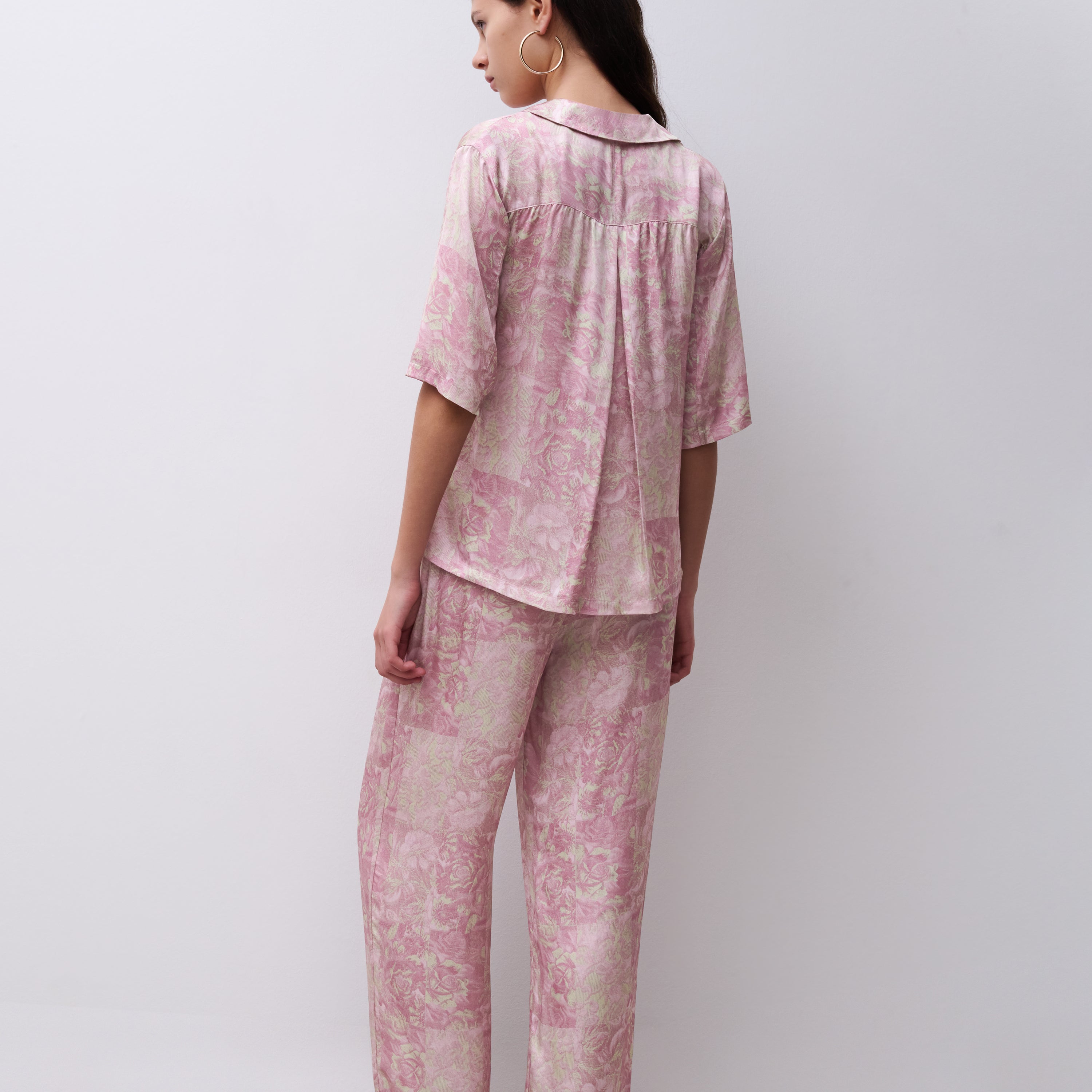 Pyjamasetissä on napillinen lyhythihainen paita sekä suorat housut, joissa taskut. Värinä heleän roosa-vihreä kuosi.