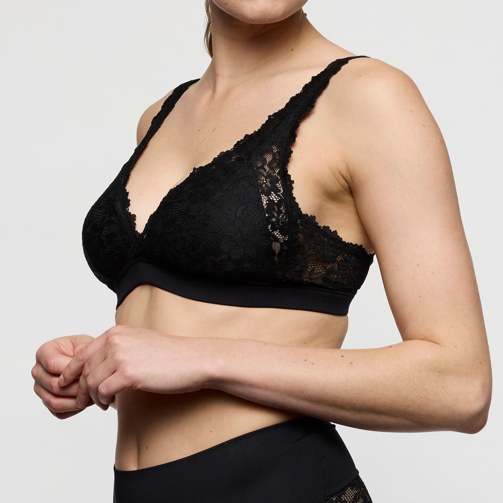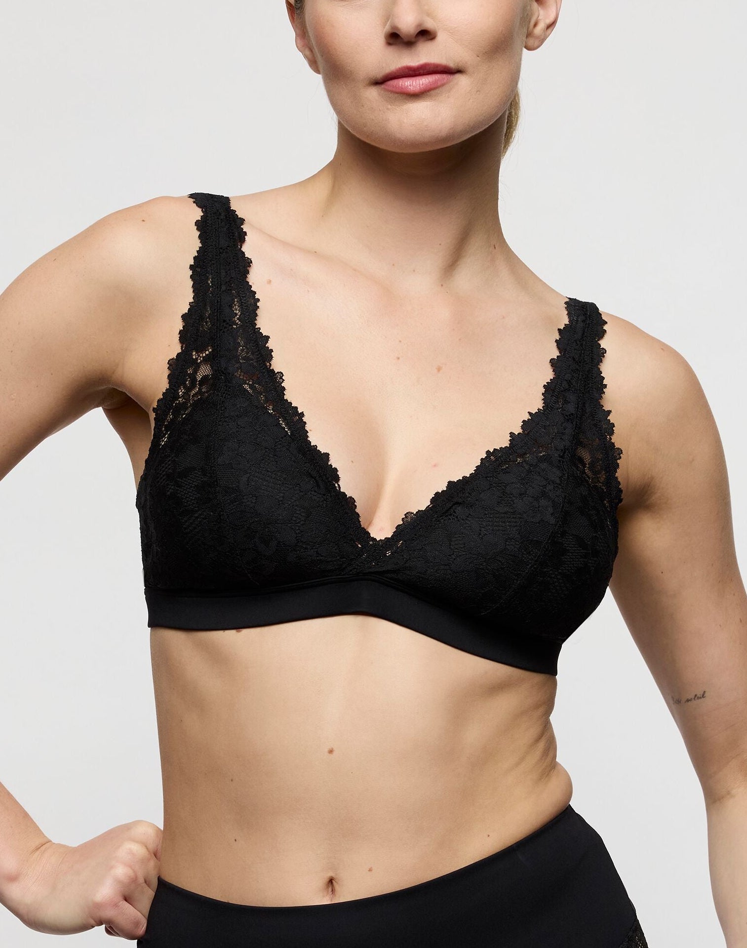 Marie Jo Soft Studio pehmeä kaaritueton rintaliivi. Liivissä pitsinen topattu kuppi ja kolmionmallinen leikkaus. Alareunan kanttaus on pehmeällä kankaalla päällystetty kuminauha. Olkaimien säätö takapuolella. Täydellinen valinta sinulle, jos haluat keveyttä, luonnollista muotoa ja erityisen hienostunutta istuvuutta.