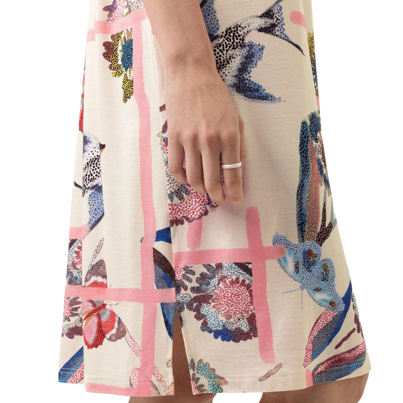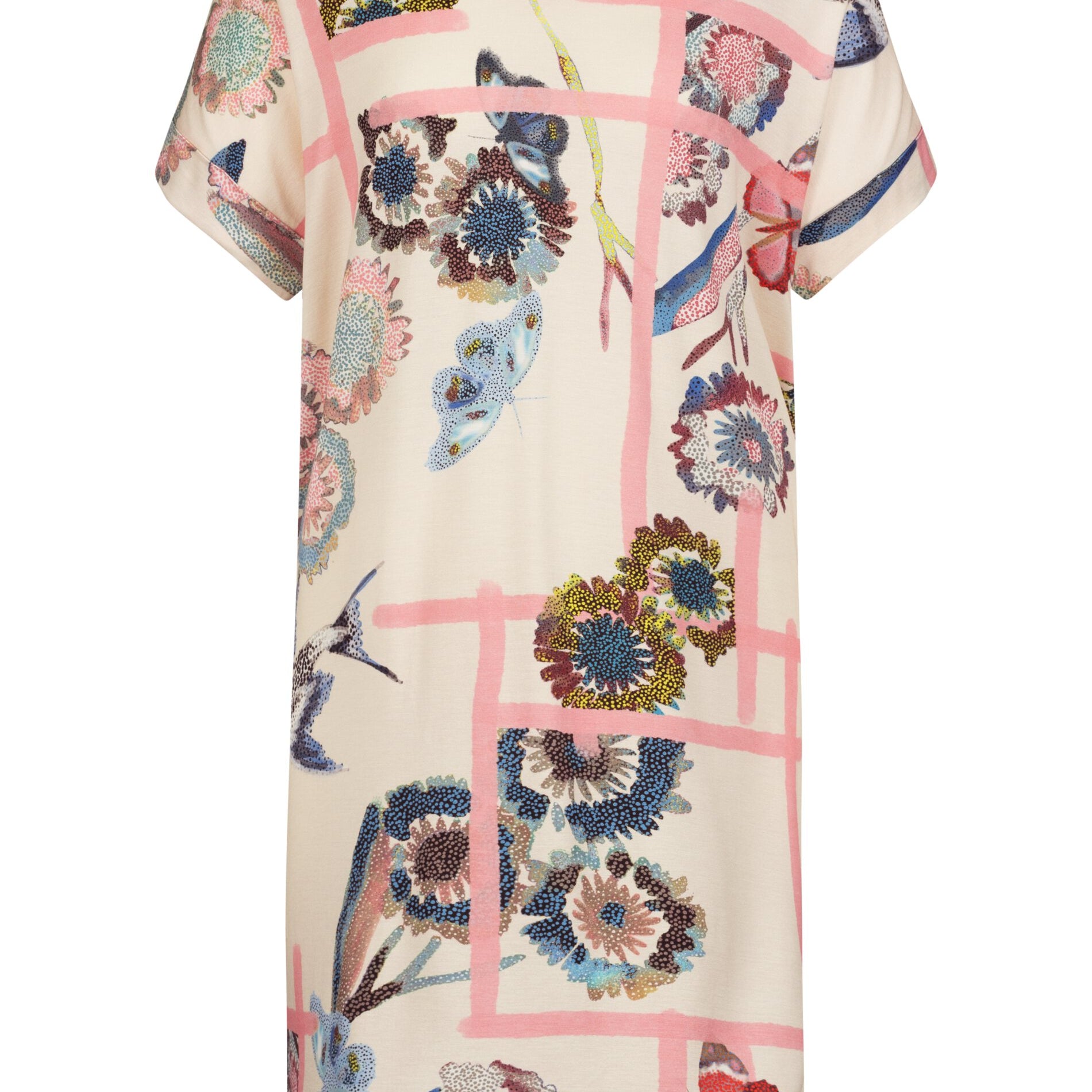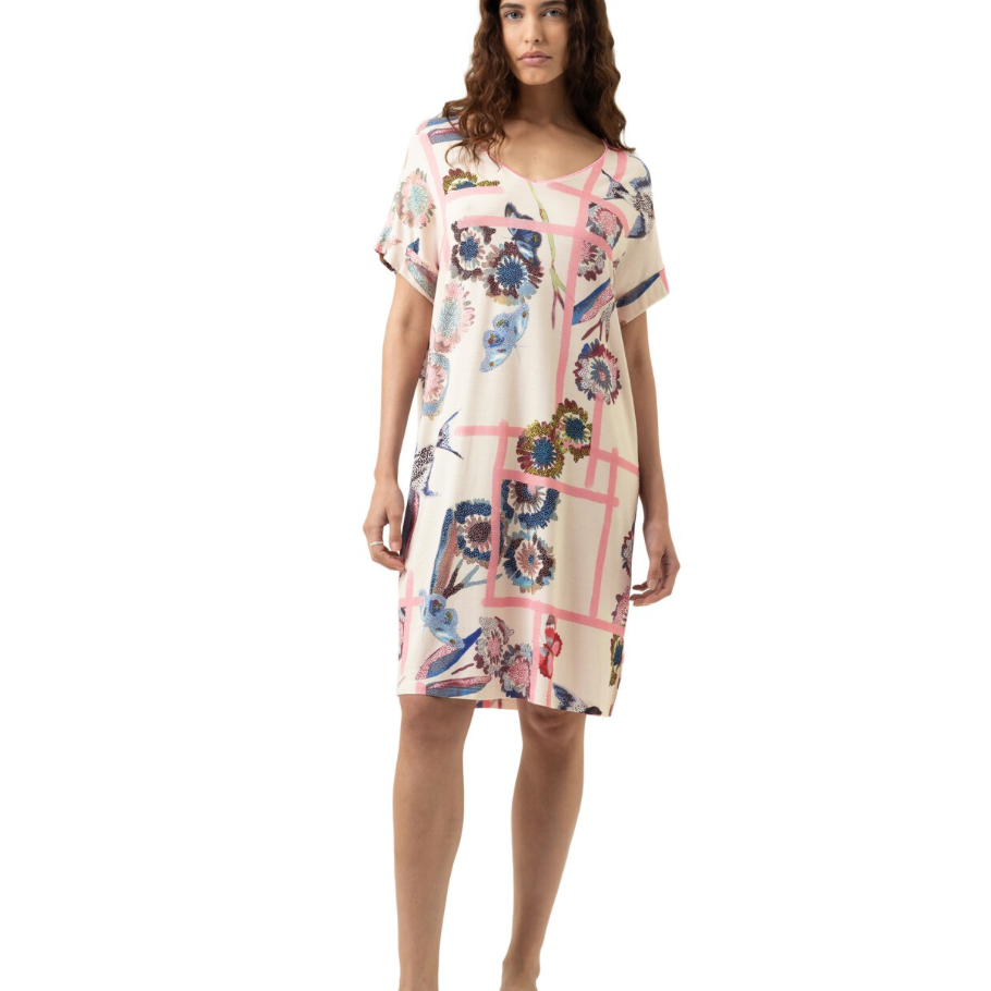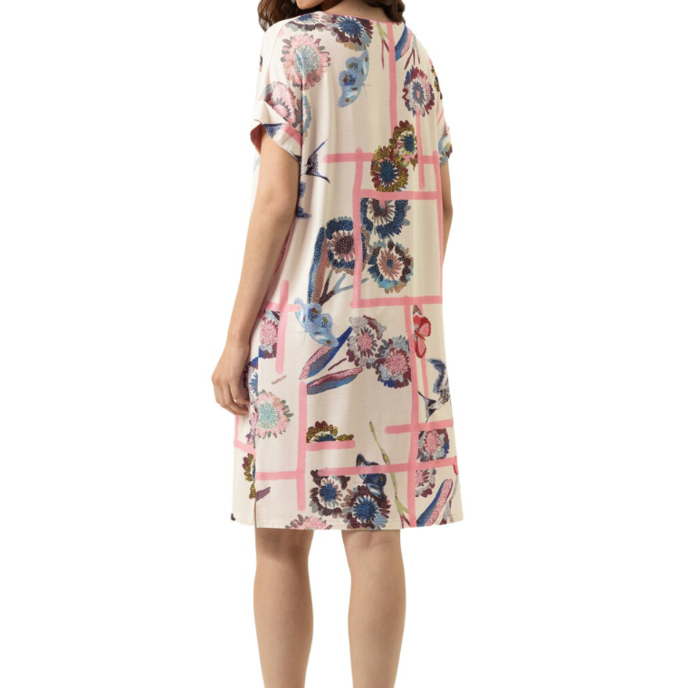 Mey Fragmented Garden yöpaita. Vaalealla pohjalla raikasta korallinpinkkiä sekä kukka- ja perhoskuviota. V-pääntie satiiniyksityiskohdilla. Ylöspäin käännetty hihansuu. Helmassa pienet halkiot sivuilla. Yleellisen pehmeä ja laskeutuva laadukas materiaali.