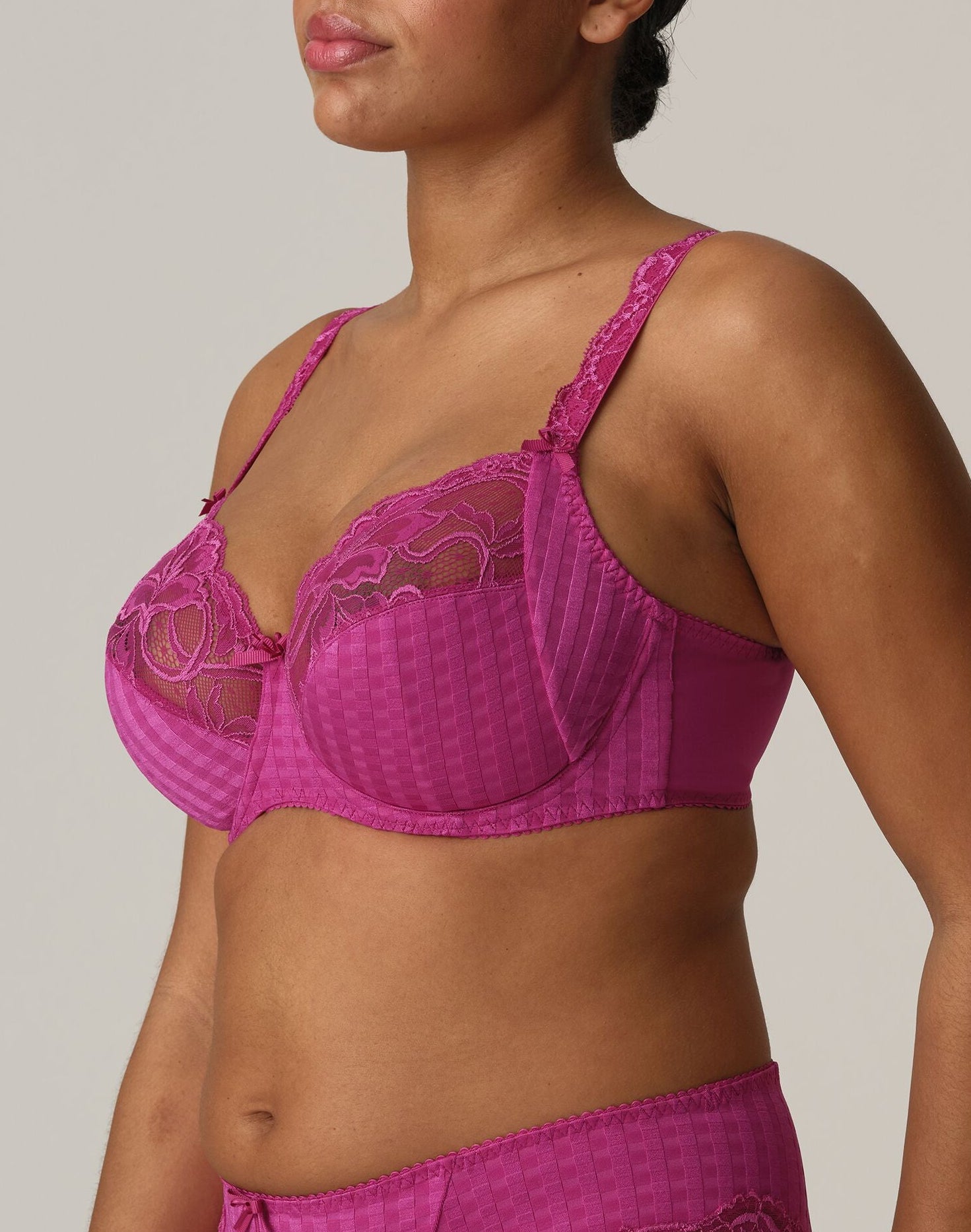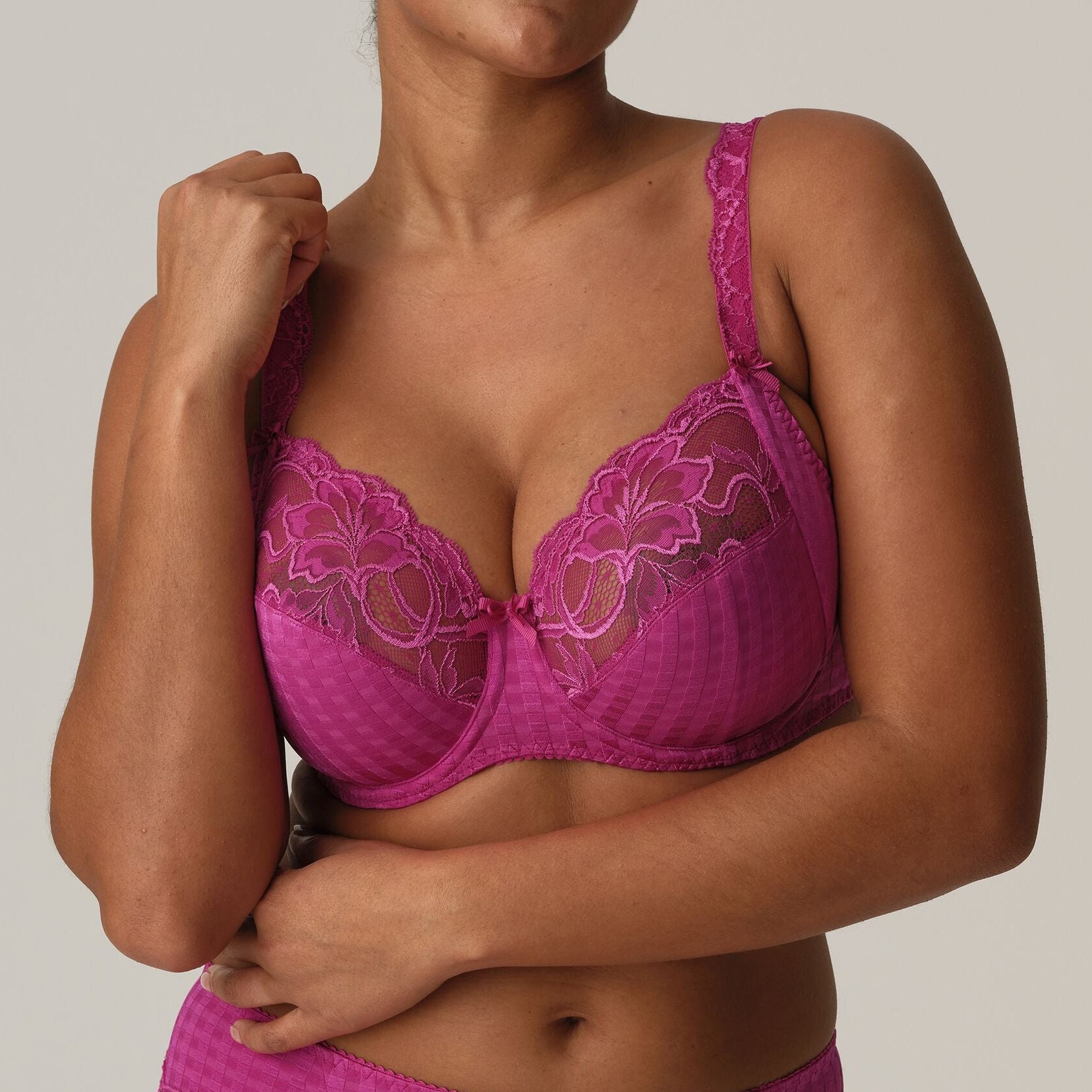 PrimaDonna Madison kaarituellinen rintaliivi toppaamattomalla tukevalla kupilla. Kauniit rintaliivit Primadonnalta kaarituilla, jotka antavat hyvän tuen povelle. Kolmesta palasta sekä tukikankaista muodostuva täyskuppi kohottaa rintaa ja korotettu sivupaneeli antaa lisätukea. Kaunis pitsi kupin yläreunassa mukautuu täydellisesti muotoihisi. Kuppien alaosassa ruudullinen kuvio ja alareuna on kaksikertaista jämäkkää materiaalia, jotta rintasi saavat parhaan mahdollisen tuen. Leveät sivuosat, jotka peittävät ja antavat lisätukea. Kuppien välissä pieni rusetti. Leveät ja säädettävät olkaimet ja hakaskiinnitys selässä. Olkaimet sekä liivin takaosan kiinnityskohta levenevät koon suuretessa. Ihanat rintaliivit isopoviselle.