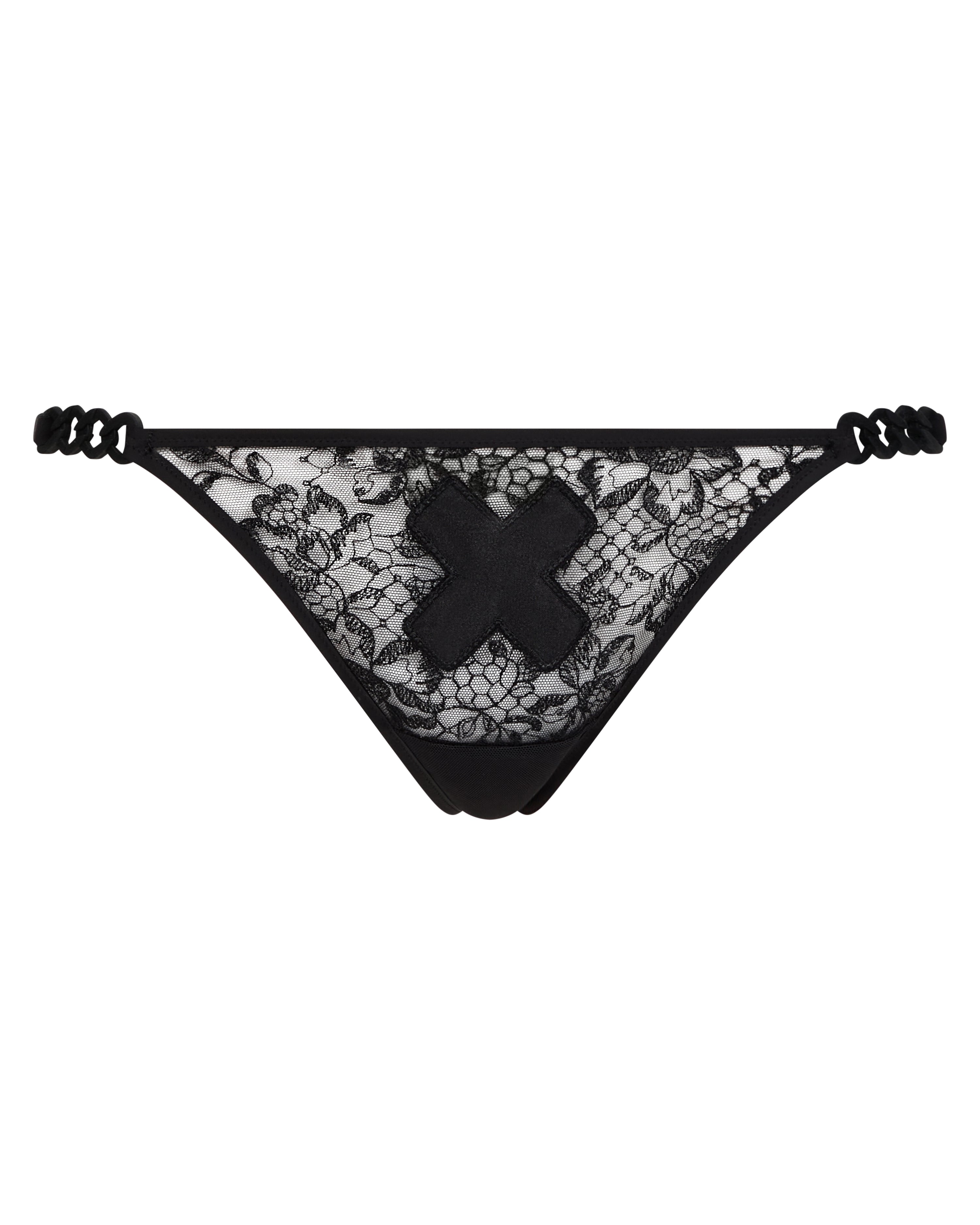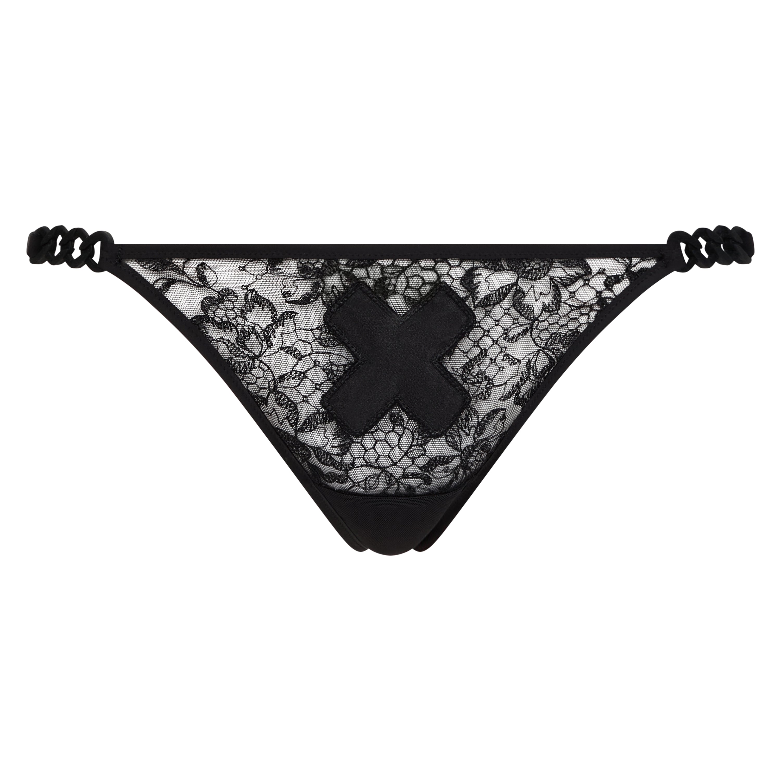 Chantelle X - Xplicit string-housu. Mustat stringit, joissa pitsinen etuosa X koristeella ja sileä saumaton ja pehmeä takaosa. Puuvillainen haarakiila.