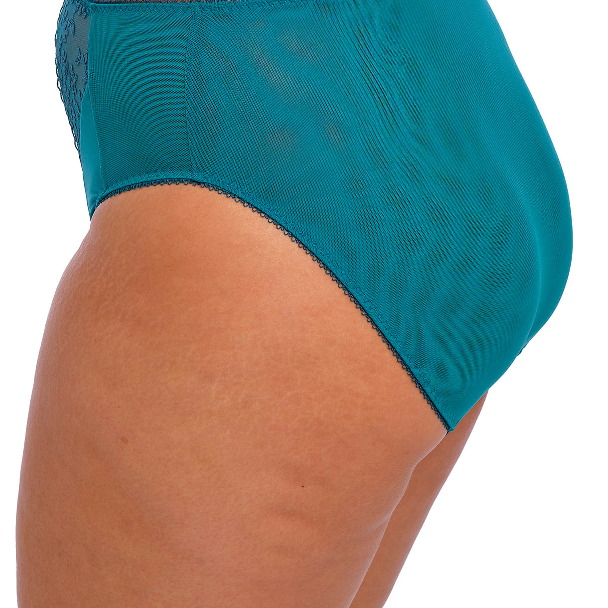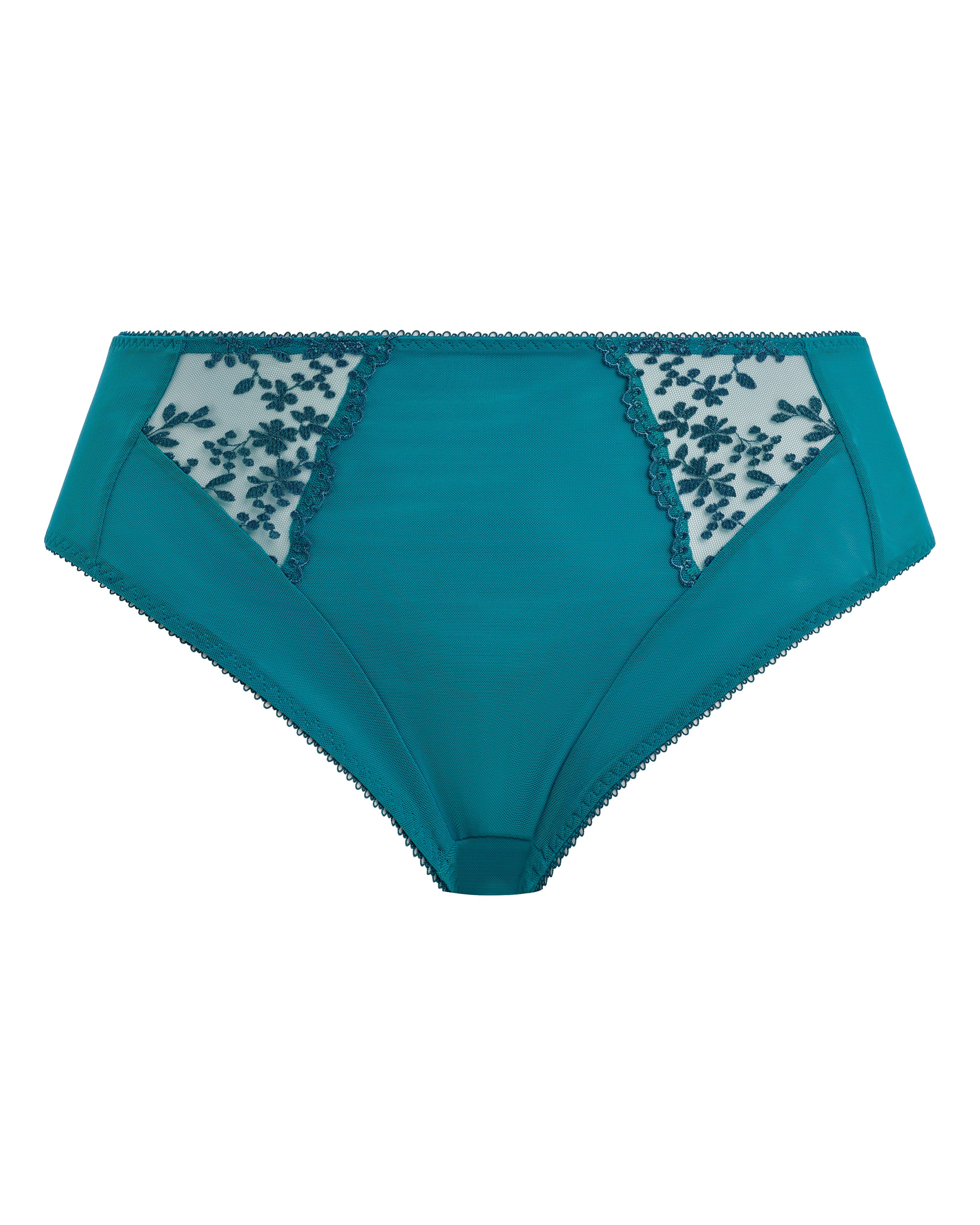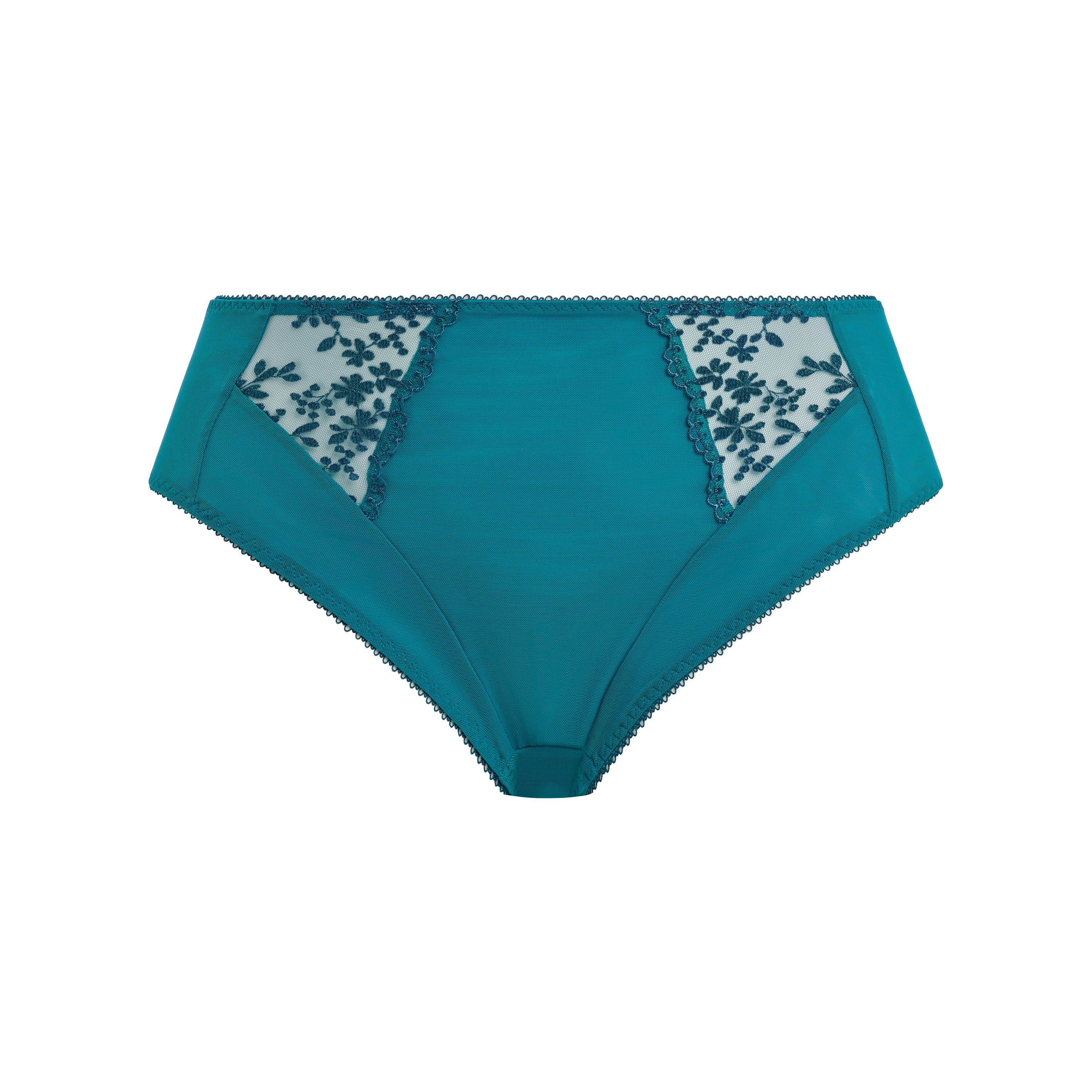 Elomi Zarla korkea alushousu. High leg -mallinen alusousu korkeammalla reisiaukolla. kauniit pitsikoristeet edessä. Materiaalina hengittävää mesh -vekkoa mikä ommeltu kaksinkertaiseksi. Puuvillainen haarakiila.