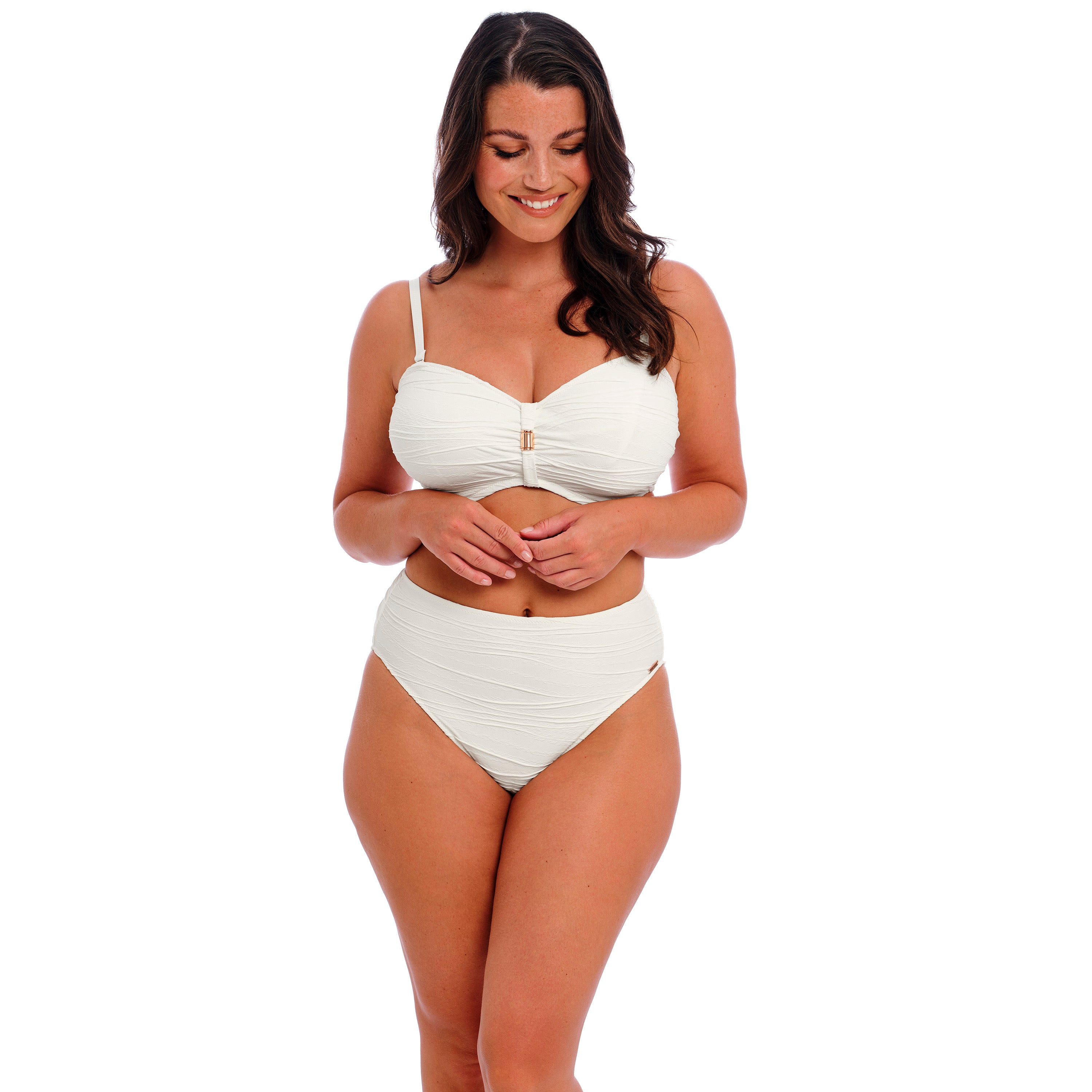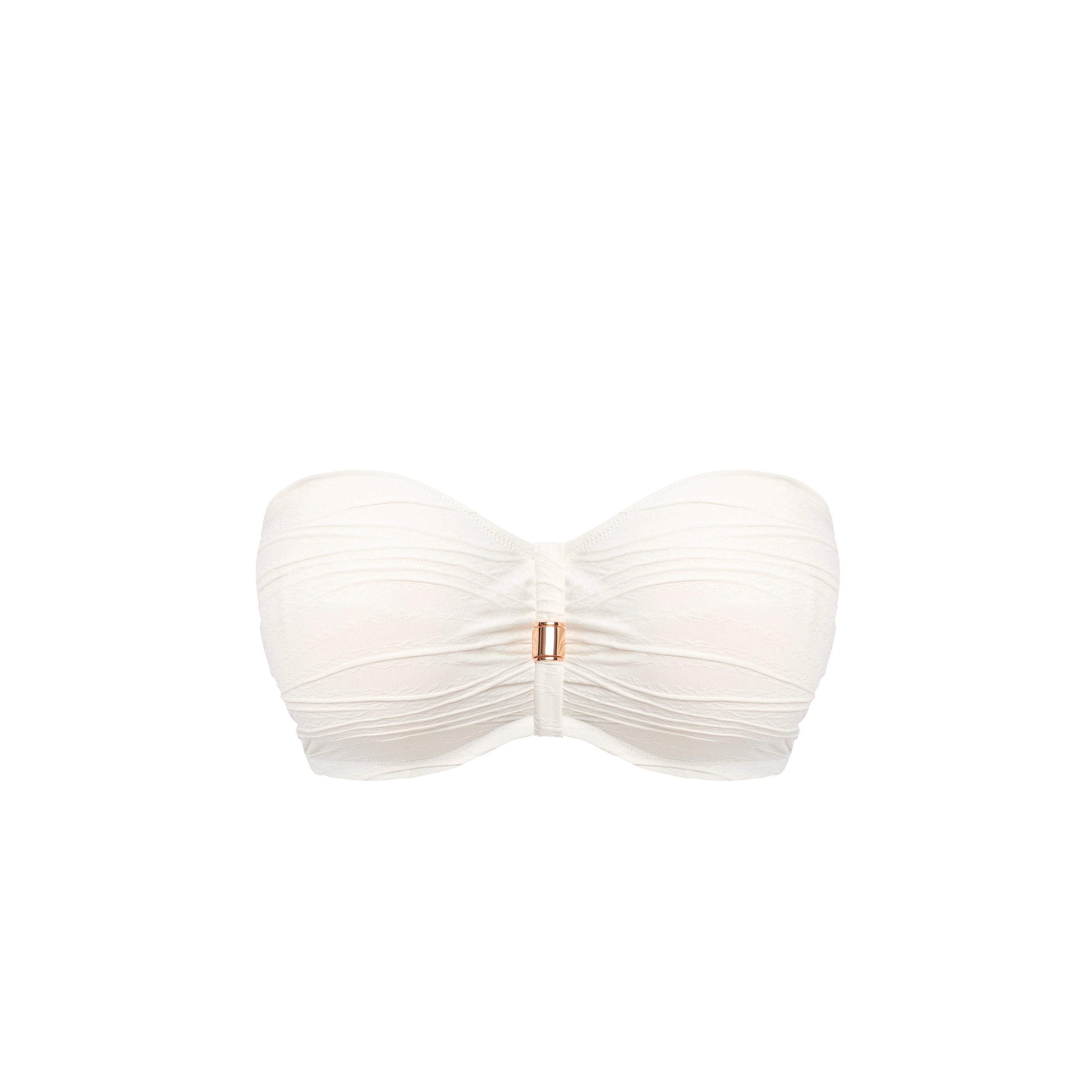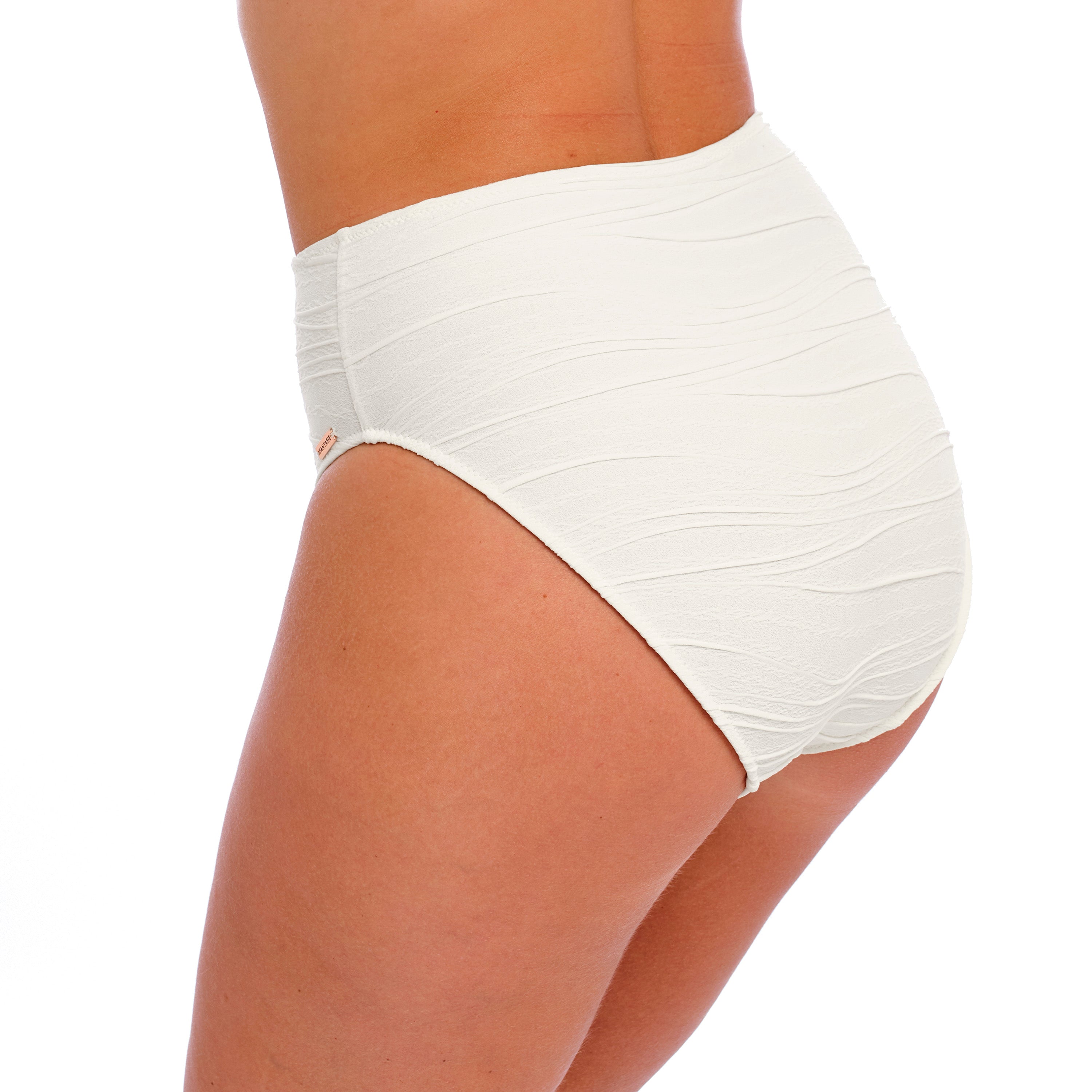 Fantasie bikinit irroitettavilla olkaimilla ja korkealla housulla. Kevyesti topattu kuppi pysyy hyvin ylhäällä myös ilman olkaimia. Säädettävät olkaimet ovat muunneltavissa myös ristiin. Kaunis luonnonvalkoien struktuuripinta. Kuppi ja housuosa ovat vuoratut, eivätkä ole läpikuultavia.