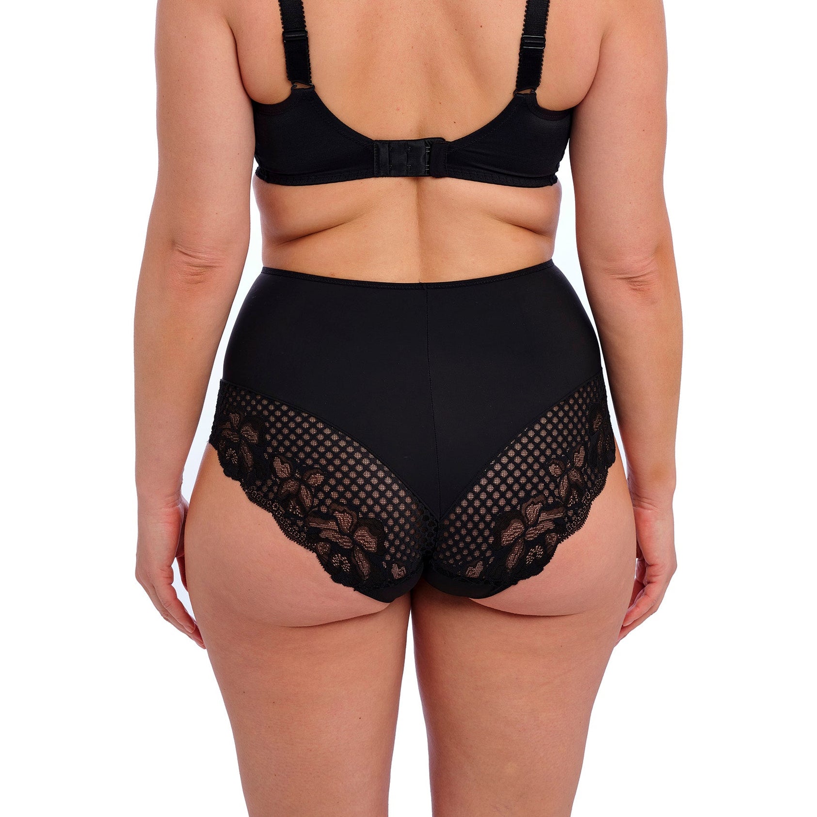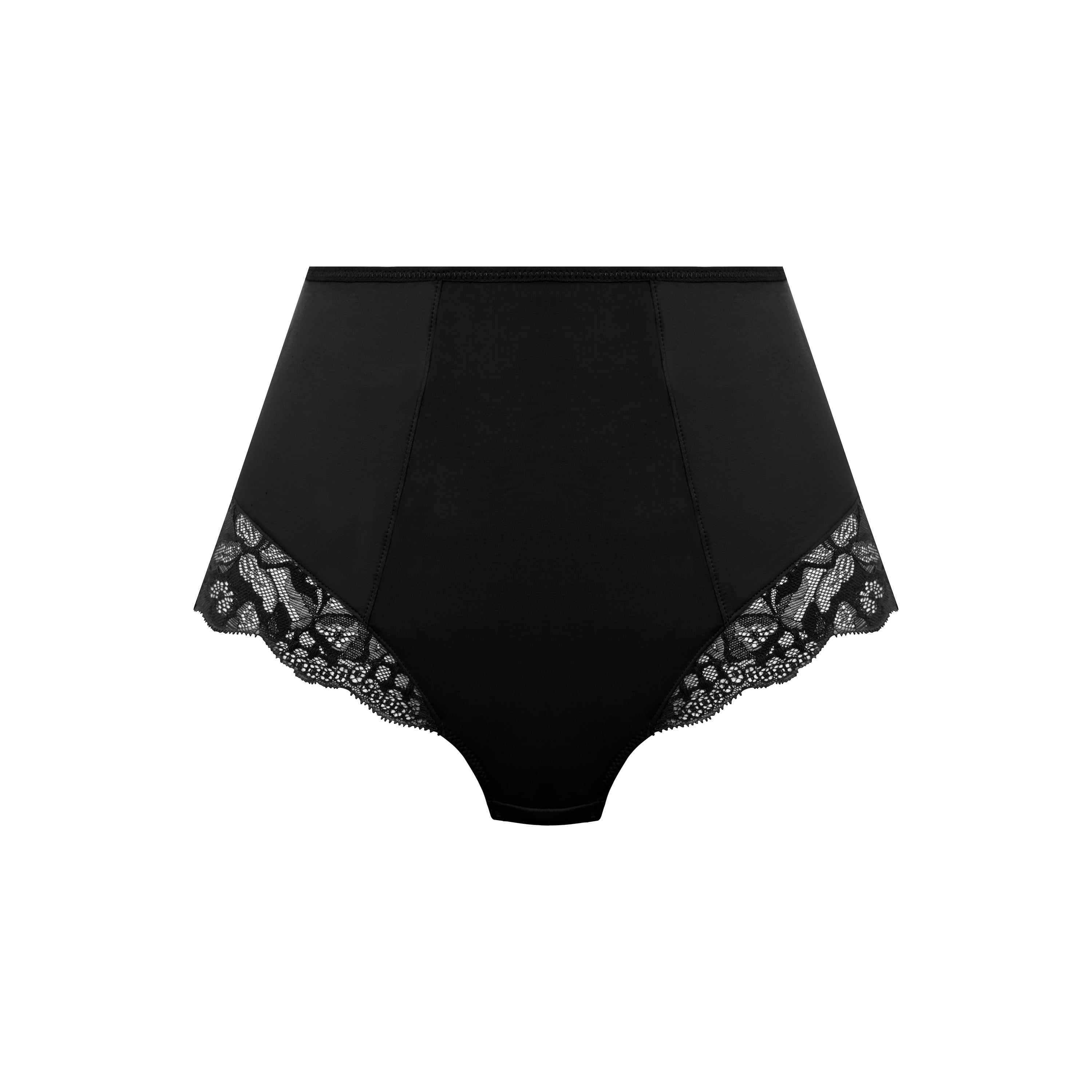 Fantasie Reflect korkea housu. Kaunis korkean mallinen vatsaa tukeva alushousu. Etuosa on vuorattu kaksinkertaisesti tukevalla mesh -verkolla. Sivu ja takaosa on joutavaa miellyttävän tuntuista mikrokuitua. Ei sivusaumoja lantiolla, joten housu on ihanan tuntuinen jalassa. Takana sauma. Houstavasta pitsistä tehdyt yksityiskohdat jalka-aukossa sekä pakarassa. Leveä puuvilla haarakiila.