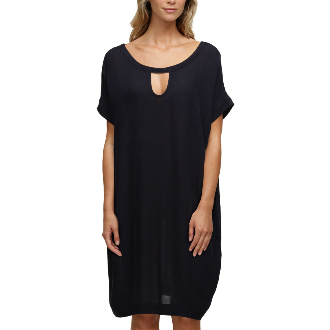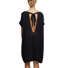 Femilet Pinta FS3240 rantatunika mustana avaralla selkäosalla. Selkäpuolella solmittavat nauhat niskassa. Miellyttävän ohutta ja laskeutuvaa struktuuripintaista kreppikangasta. Löysät t-paita hihat. Melko suoran mallinen helma.