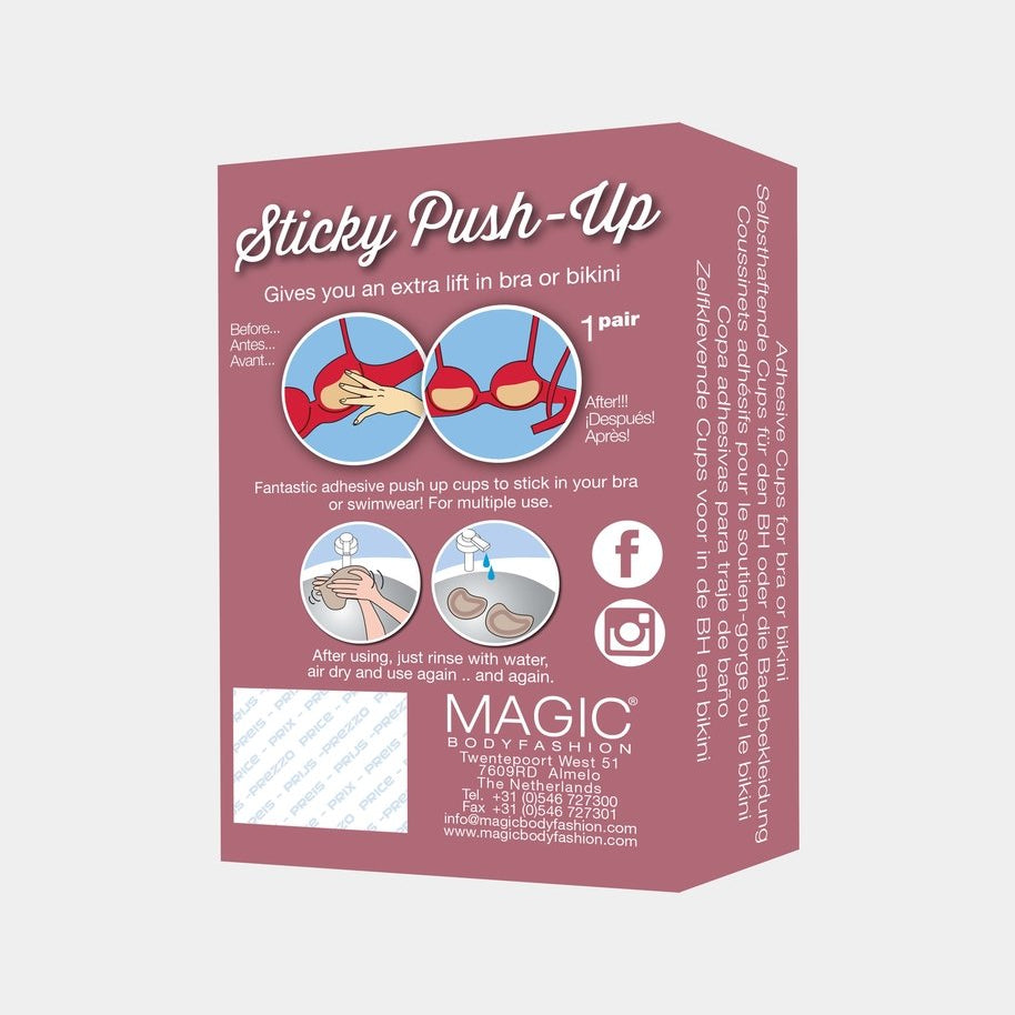 Magic Sticky Push-up tyynyt liimapinnalla. Toppaus kiinnitetään rintaliiveihin liimapinnan avulla, joten se pysyy hyvin paikallaan. Vaalean beigen sävyinen irtotoppaus leveydeltään n. 13cm ja korkeudeltaan 9,5cm.