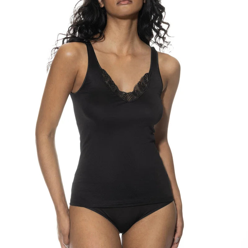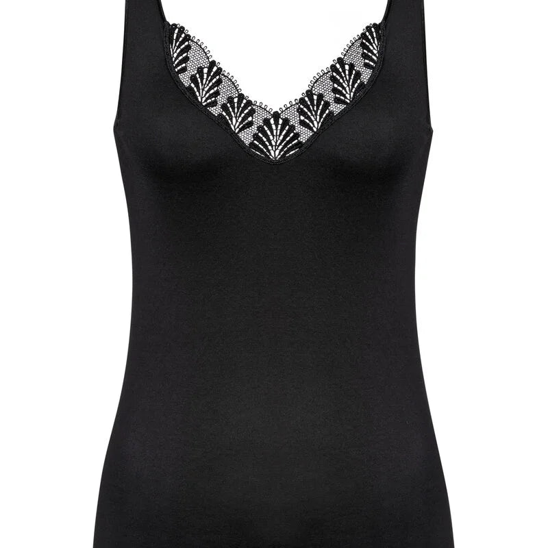 Mey Emotion 1110028 alustoppi. Materiaali on miellyttävän liukaspintaista ja sileää, pysyy erittäin siistinä, eikä nukkaannu. Hengittävä ja lämpötilaa säätelevä materiaali. Kaula-aukossa, decolteella kaunis ja jämäkkä pitsi. Leveähkö olkain. Vyötärössä ei ole sivusaumoja, joten paita on erittäin miellyttävä yllä. Väljähkö mitoitus, koska materiaali on mukavan joustavaa. Ota pienempi koko, jos haluat, että paita on ihonmyötäinen.