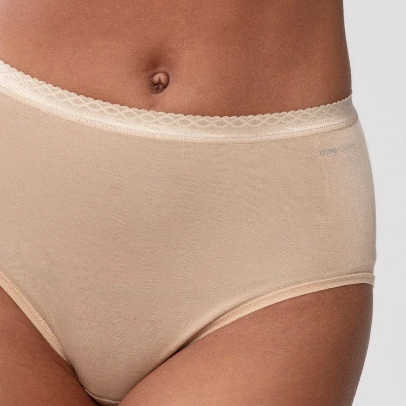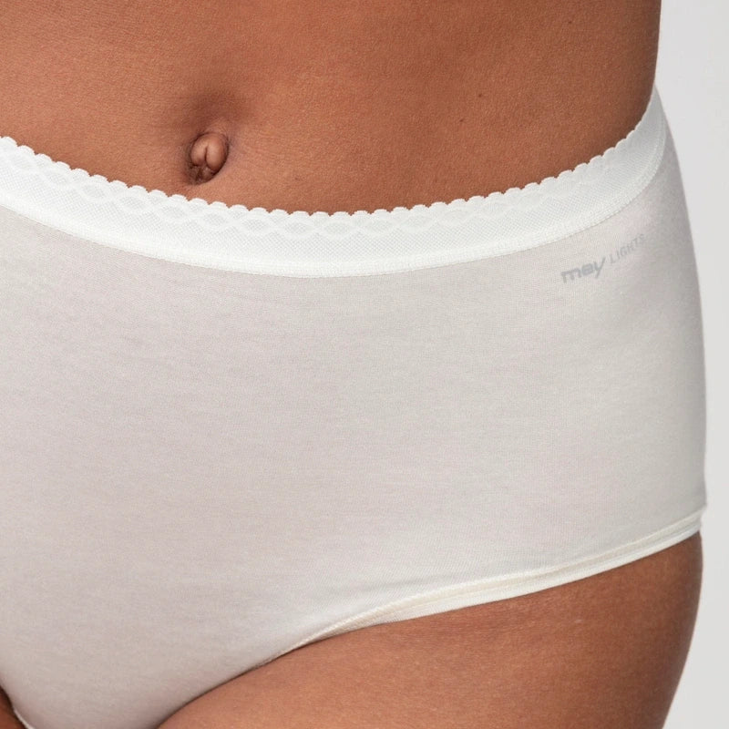 Mey Lights-sarjan korkeavyötäröinen alushousu. Housun materiaali on miellyttävää luonnonkuitua: sisäpuoli ihoystävällistä Peru-Pima puuvillaa ja ulkopinta hieman liukkaampaa ja hieman kiiltävää viskoosia. Hyvän istuvuuden takaavat riittävän leveä ja korkea takakappale sekä jalansuun litteät saumat. Ei sivusaumoja ja kumia reisiaukossa. Laadukas perushousu ja asiakkaidemme suosikki. Housun korkeus koossa 42 haarapalasta vyötäröön noin 34 cm.