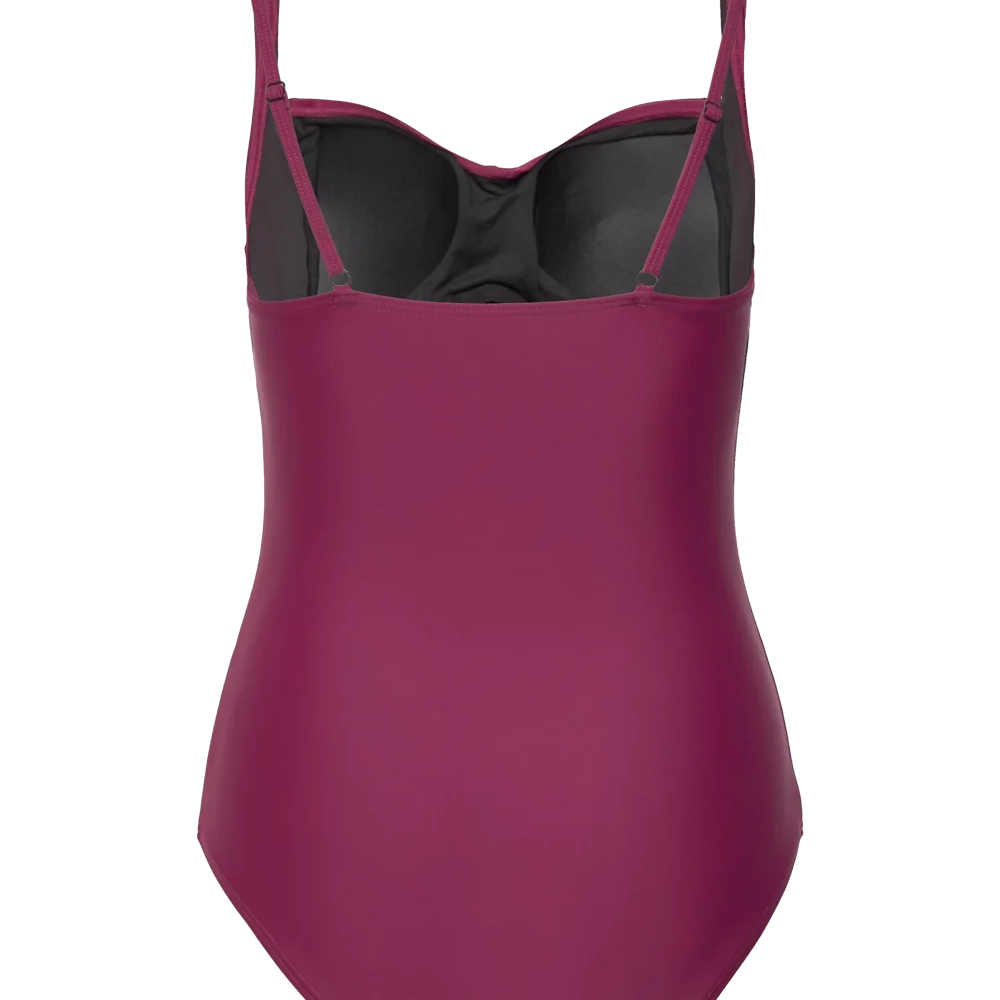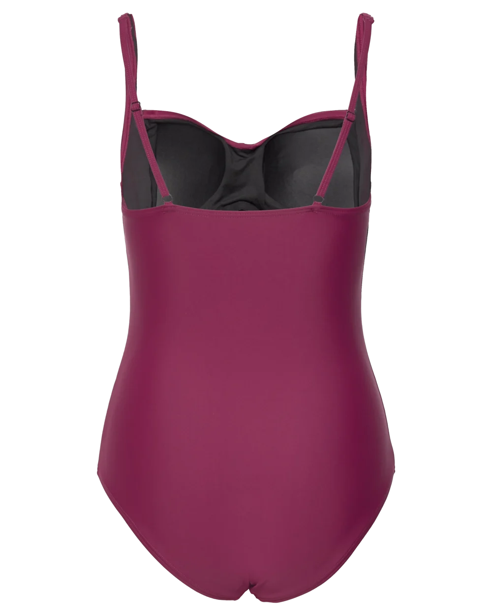 Missya Argentina uimapuku. Tumma purppuran lilahtava sävy. Kaaritueton uimapuku kevyesti topatulla kupilla. Rypytetty etuosa ja sileät sivukappaleet, jotka imartelevat vartaloa. Säädettävät ohuet olkaimet ja suora selkäosa. Uimapuku on vuorattu edestä napakalla mesh verkolla ja takaa pehmeällä lycralla.