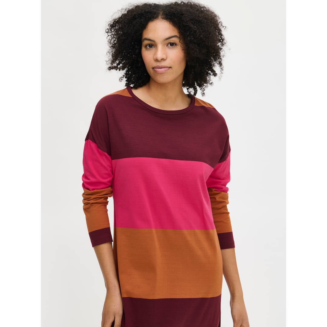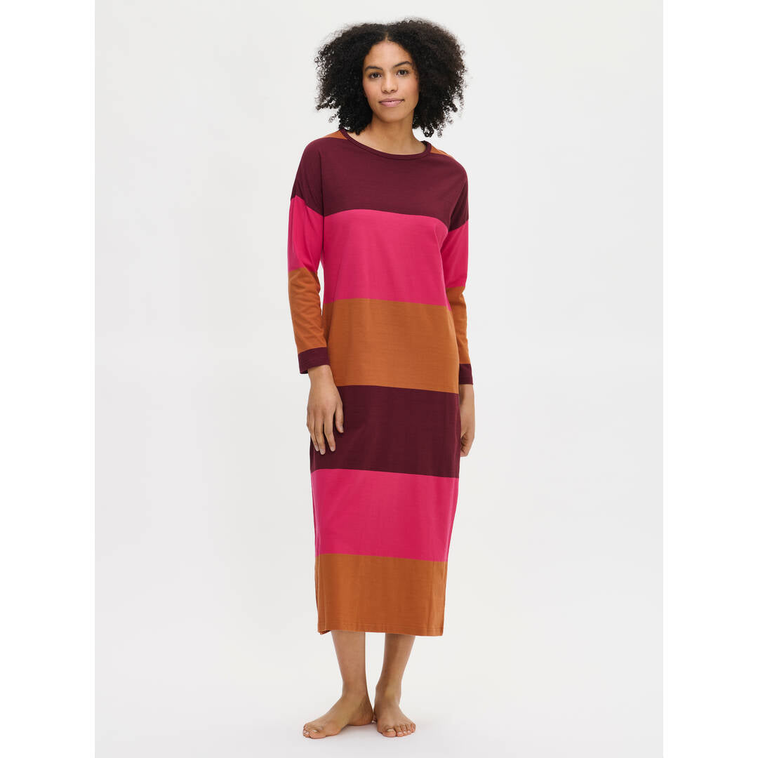 Nanso Trio-yöpaita 29064 pitkillä hihoilla ja pyöreällä pääntiellä. Rennon yöpaidan pääntie on viimeistelty yksivärisellä kantilla. Suoralinjaisen yöpaidan pituus koossa M on noin 130 cm. Materiaali on laadukasta, iholla miellyttävän pehmeältä tuntuvaa ja helppohoitoista puuvillaneulosta, joka pysyy hyvänä pesusta toiseen. Neulos on valmistettu sertifioidusta puuvillasta.