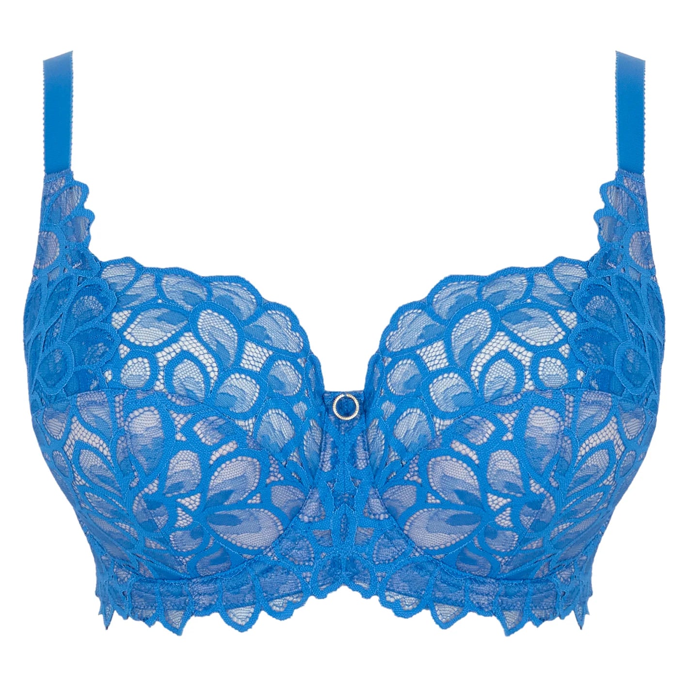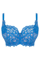 Panache Allure kaarituelliset rintaliivit. Toppaamaton full cup -täyskuppinen kuppimalli kohottavalla leikkauksella. Kupin leikkaukset luo pyöreän muodon rinnalle ja keskittää rintaa pois kainalosta. Kupin alaosa on tukeva, vuorattu ja kupin yläosa on joustavaa pitsiä. Kierrätysmateriaaleista valmistettu pitsi on sileää ja miellyttävää ihoa vasten. Yläreunan pitsi mukautuu hyvin rinnan muotoon. Kuppien välissä on kultainen pieni koriste. Liivin takaosa on leveähkö ja se on tukevaa mesh -verkkomateriaalia. Olkaimet on kokonaan säädettävät. Värinä upea sininen, Azure Blue.