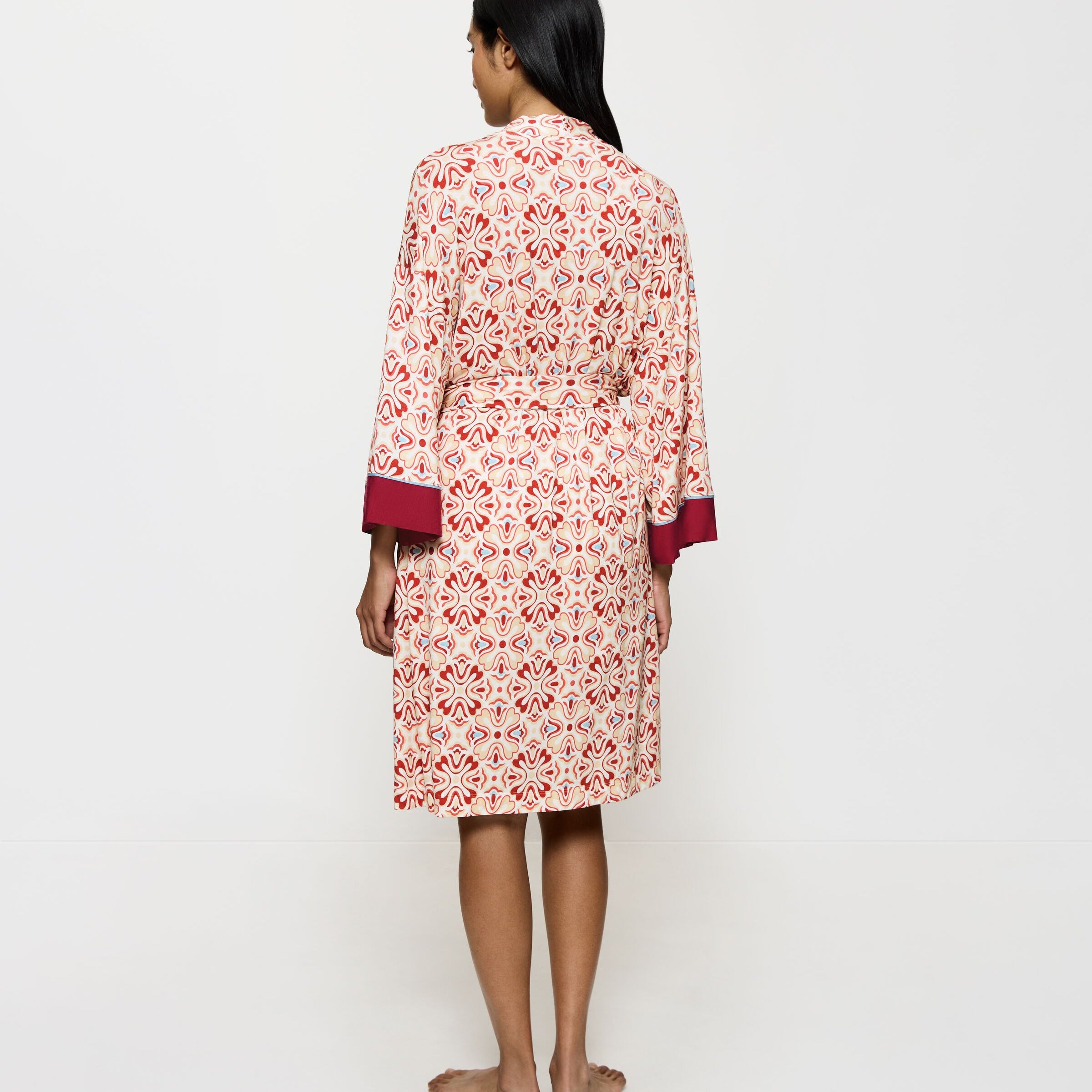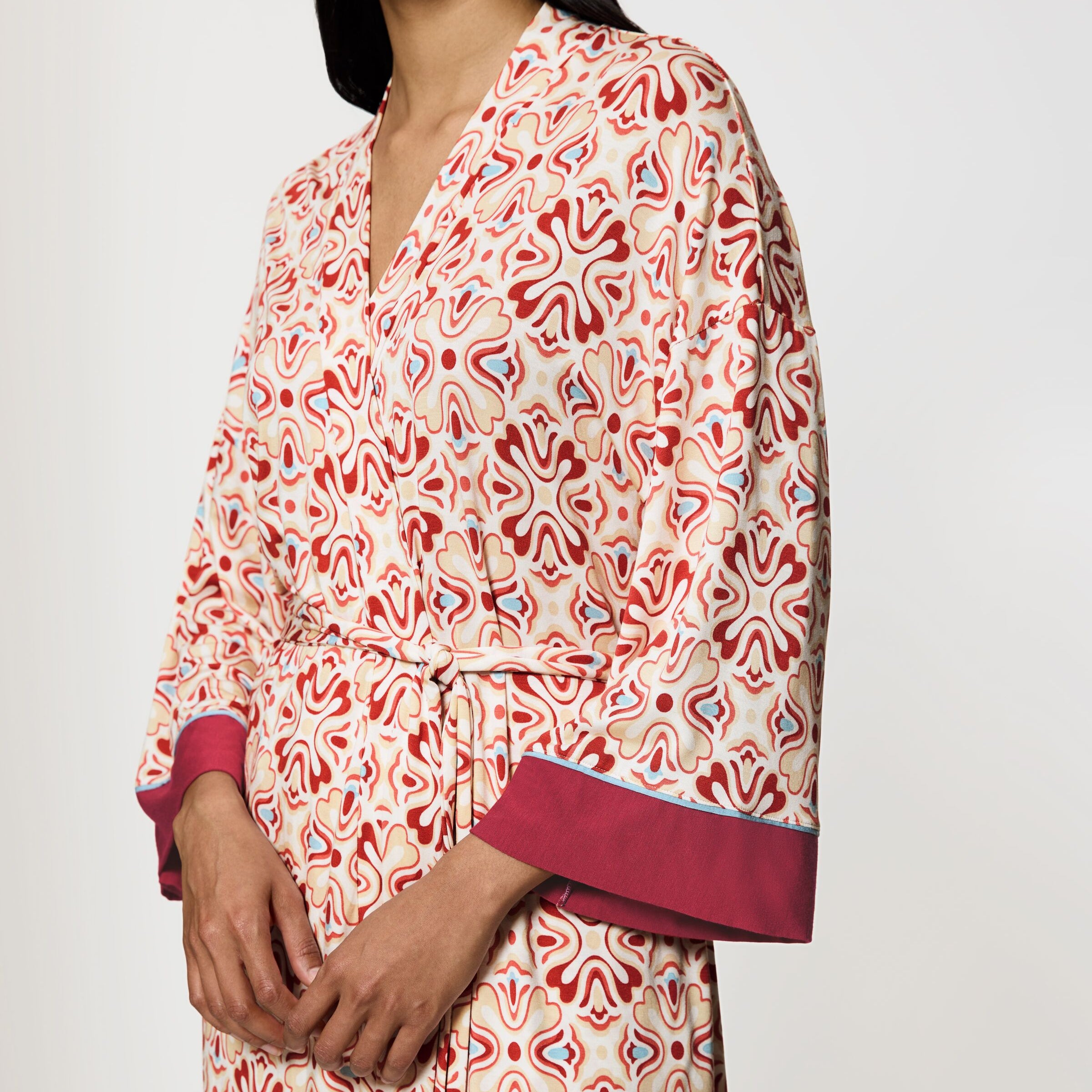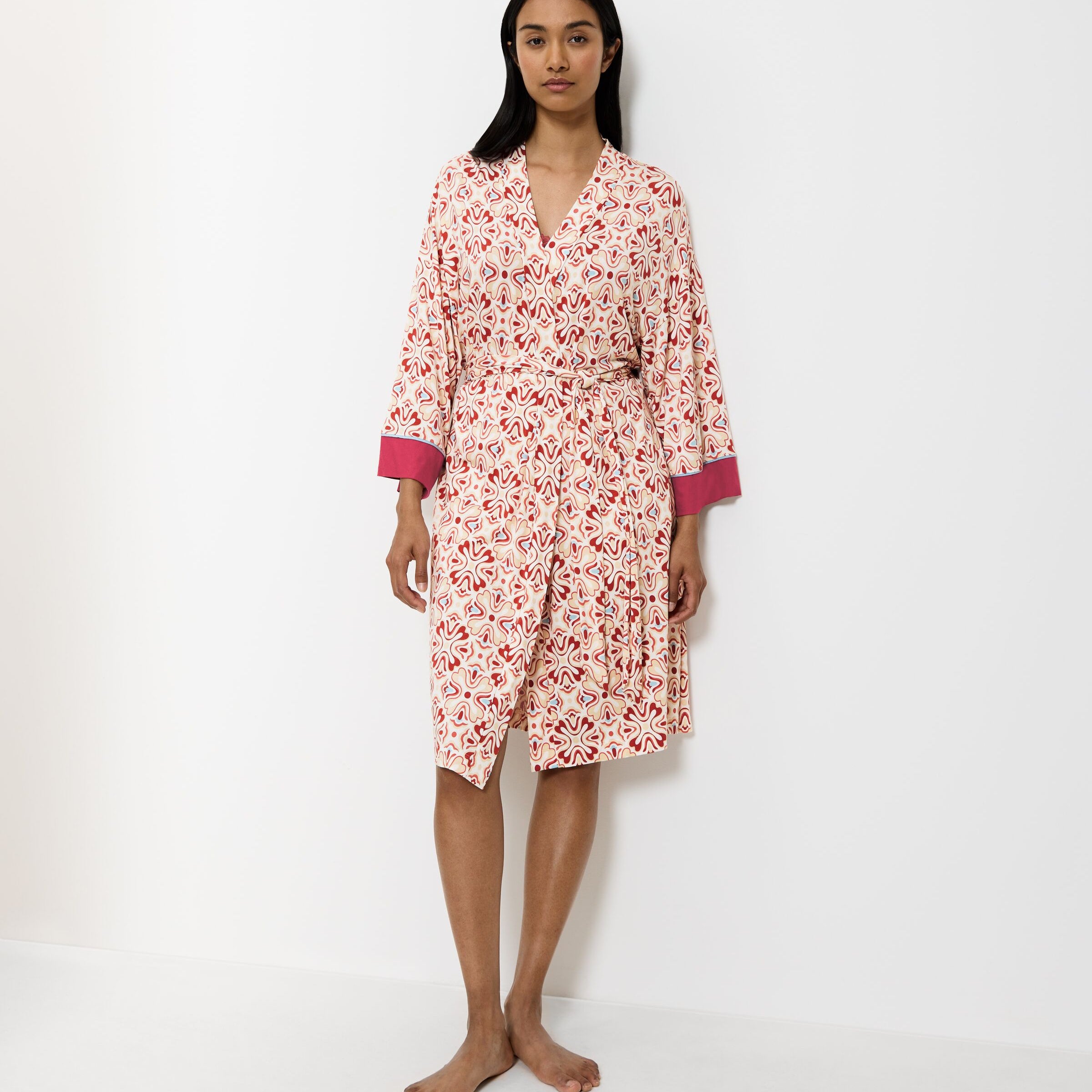 Triumph Aura Spotlight aamutakki väljän mallisilla kimono hihoilla. Ihanan pehmeää ja joustavaa modaali-elastaania. Kaunis ruskean punertava-beige kuviointi pienillä turkoosin sävyisillä yksityiskohdilla.