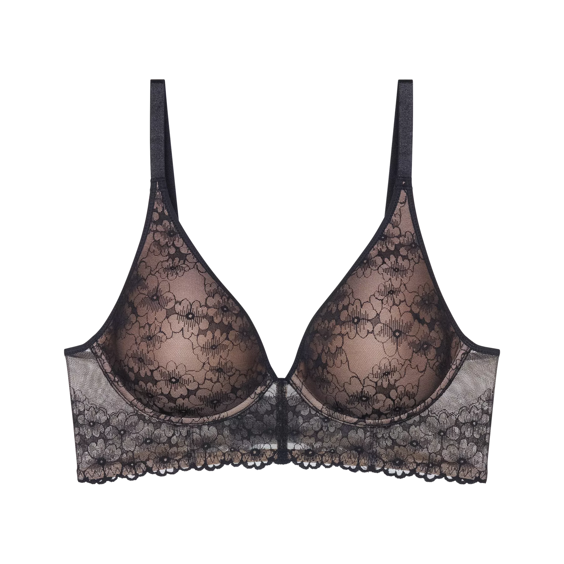 Triumph Bright Spotlight P, kevyen tuen antava kaaritueton bralette-rintaliivi. Joustavan ja sileän mustan pitsin läpi kuultaa ihonvärinen vuoraus sekä kupin pehmeä ohut toppaus.
